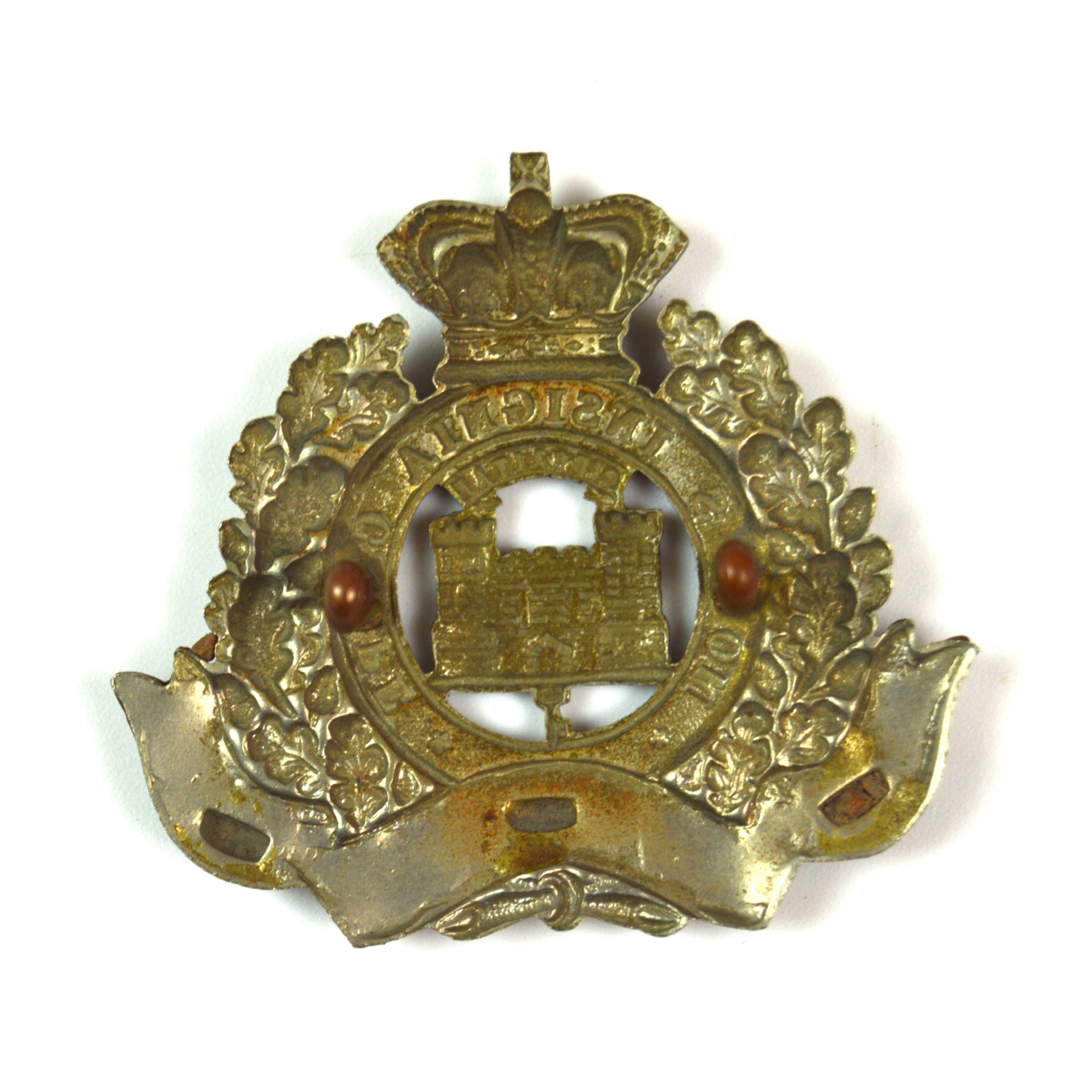 This pattern was worn during the regiment’s service in the late Victorian campaigns, including postings in India, Egypt, and South Africa during the Second Boer War. It was replaced after Queen Victoria’s death in 1901 with a King’s Crown variant. The reverse of the badge is fitted with original east–west copper lugs, correct for the period.