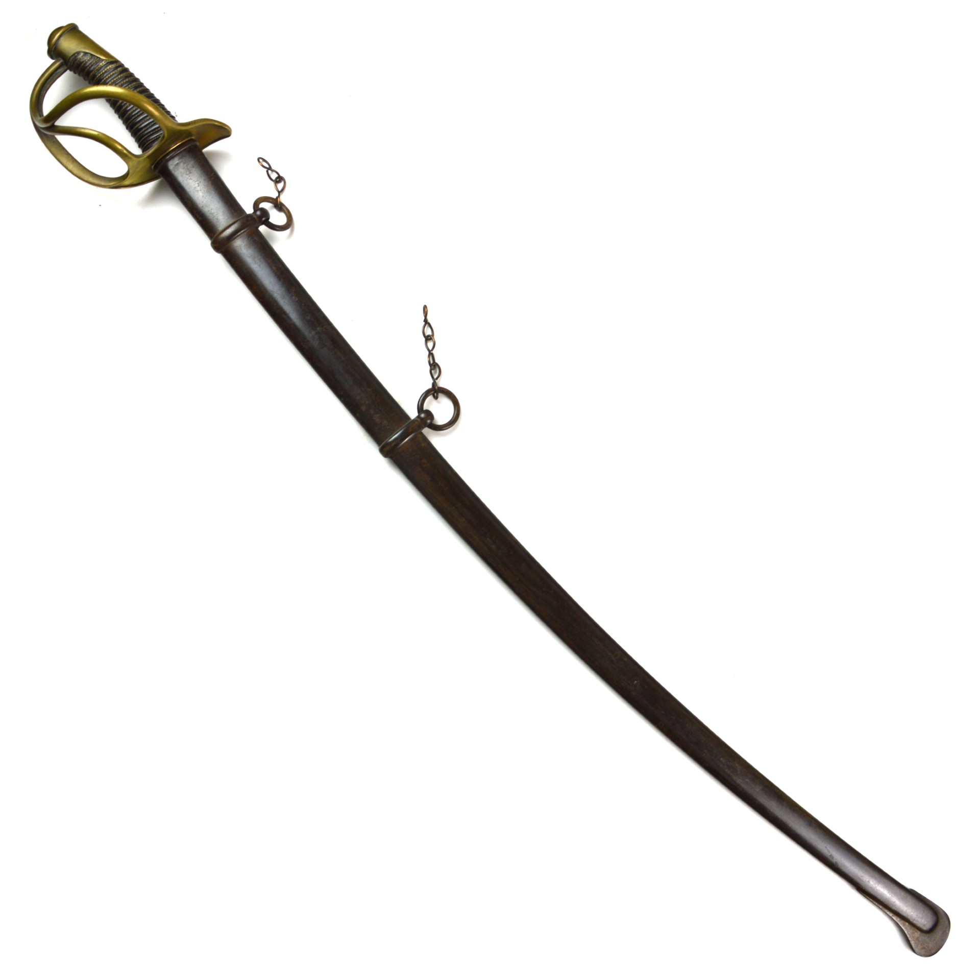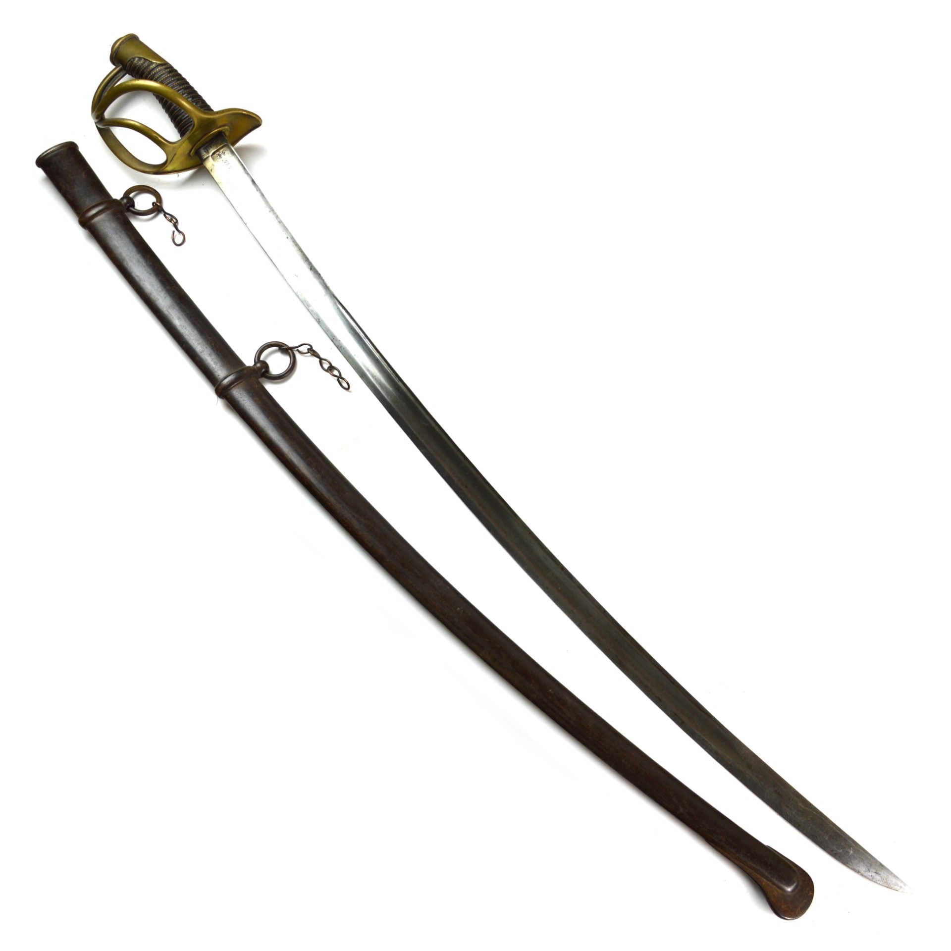 The sword features a curved, single-edged blade with a broad fuller extending for most of its length, characteristic of continental light cavalry designs of the period. The brass three-bar guard provides excellent hand protection and is paired with a leather-covered wooden grip, secured by twisted brass wire binding. Complete with its original steel scabbard, fitted with dual suspension rings.