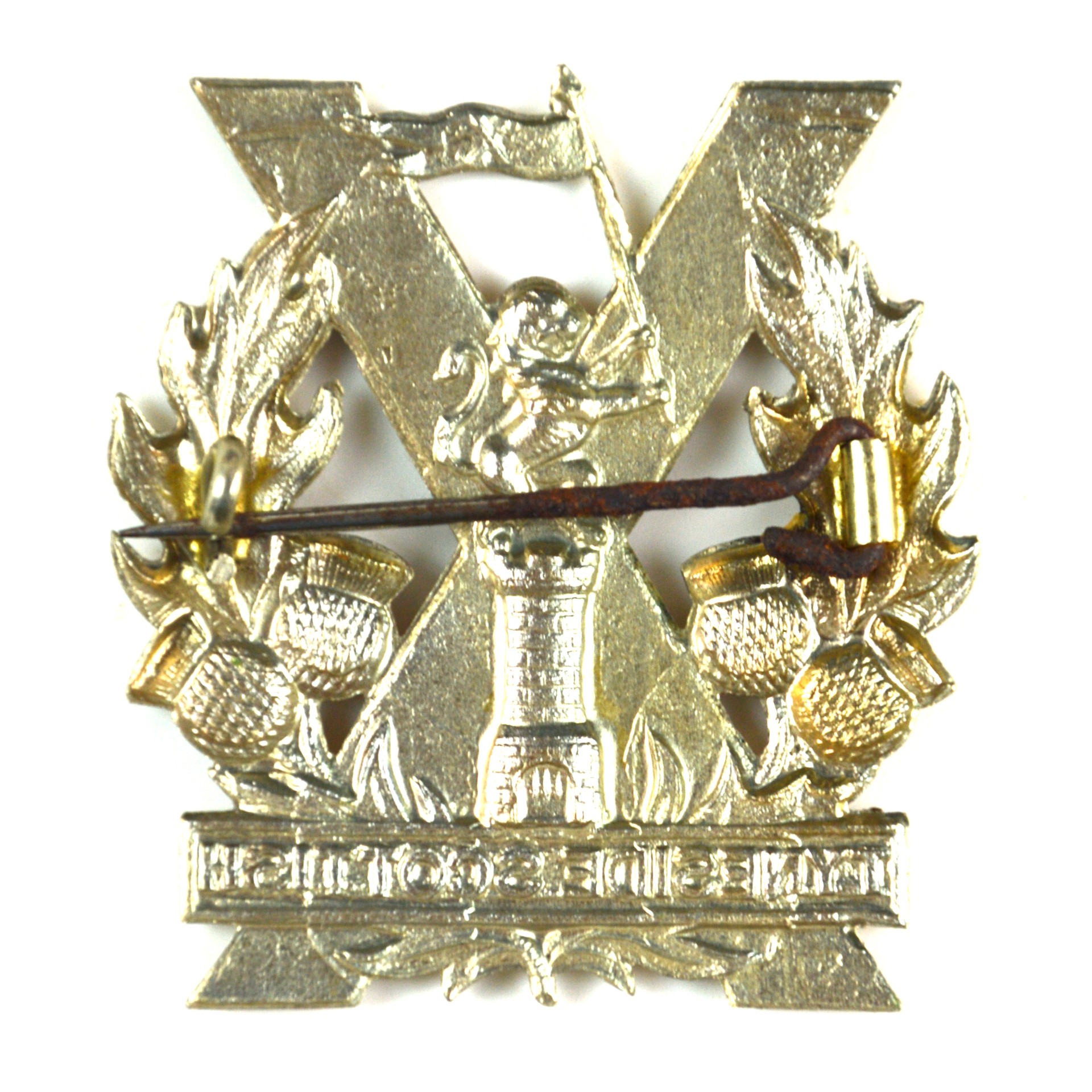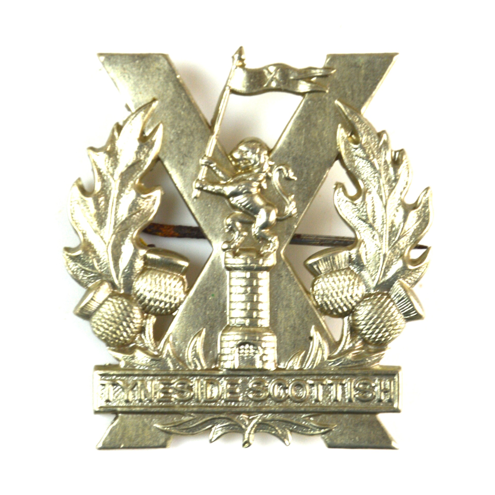 This early war badge is struck in white metal, featuring the St. Andrew’s Cross over a wreath of thistles, with a lion holding a flag atop a tower and a plaque bearing the regiment’s title “Tyneside Scottish”. Reverse fitted with a broach pin fitting for Glengarry attachment, typical of WWI manufacture.