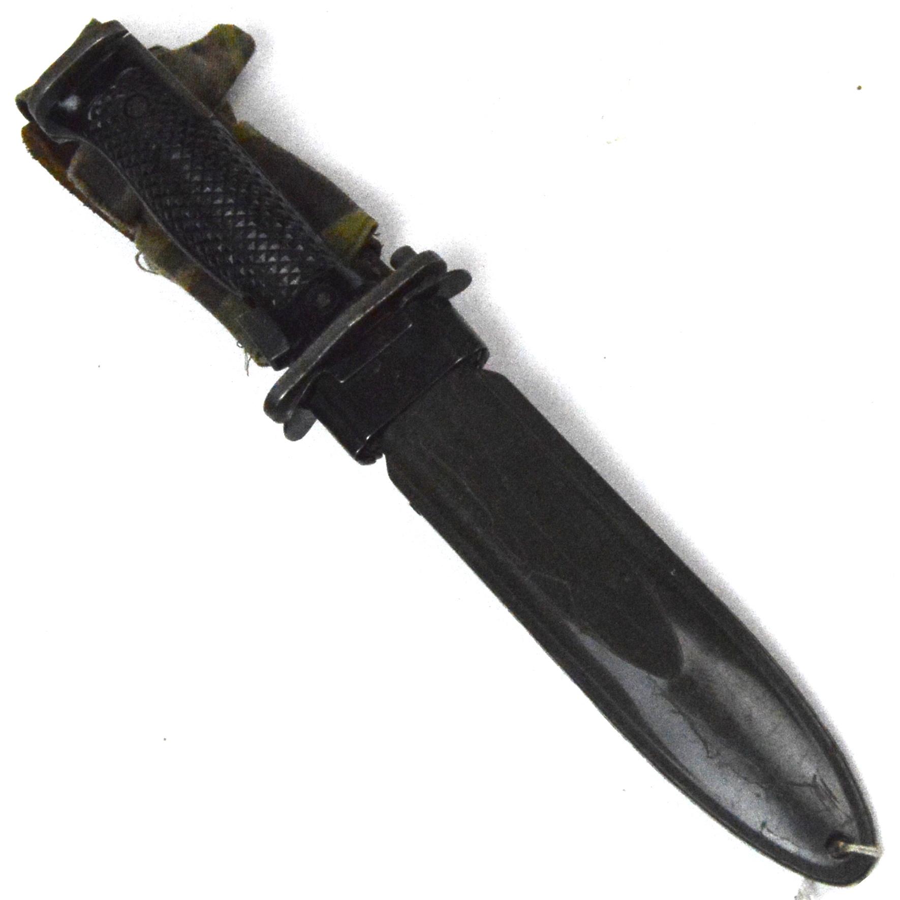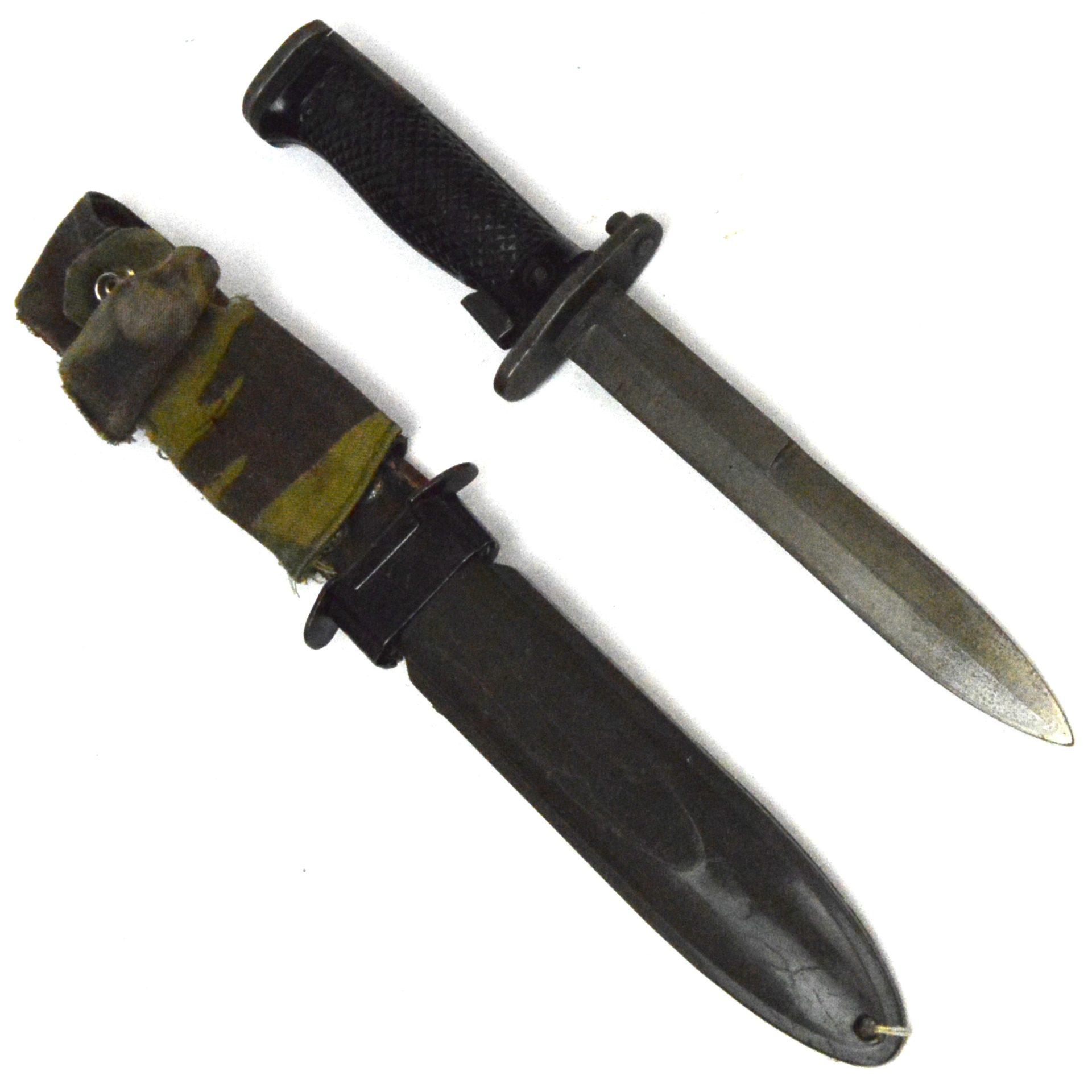 US Reproduction M5 Bayonet in original M8A1 scabbard. For M1 Garand. Slip-on camouflage cloth is covering a break in the integral leather belt loop.