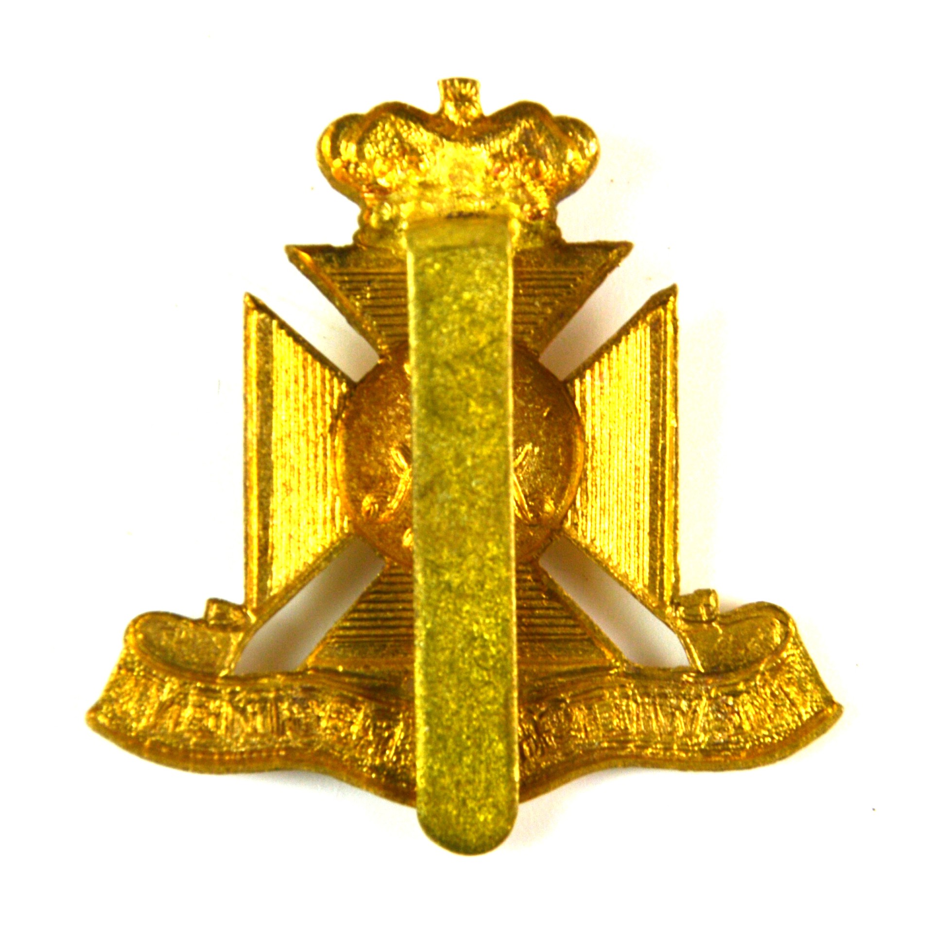 A restrike cap badge of the Wiltshire Regiment (Duke of Edinburgh’s), produced in the style of the original British Army pattern worn on service dress caps by regiment personnel. This British military cap badge displays the recognised Wiltshire Regiment insignia in clear relief, with a defined Maltese cross surmounted by a Duke’s crown, the “AEA” cypher and scroll beneath reading “The Wiltshire Regiment”. Manufactured in gilding metal and intended as a reproduction reference example, it is suitable for collectors of British Army badges, Wiltshire Regiment memorabilia, Duke of Edinburgh’s Regiment insignia, and general militaria displays. The reverse is fitted with standard hook slider fittings for secure attachment to headdress or collector mounts.