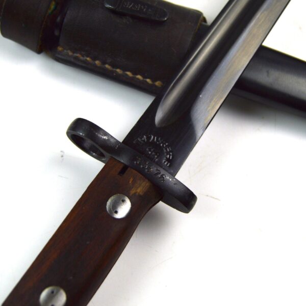 Yugoslavian M1948 Mauser Bayonet in its blacked steel scabbard. 248mm single-edge fullered blade with wooden slab grips held by two grip bolts. 15.5mm muzzle ring.