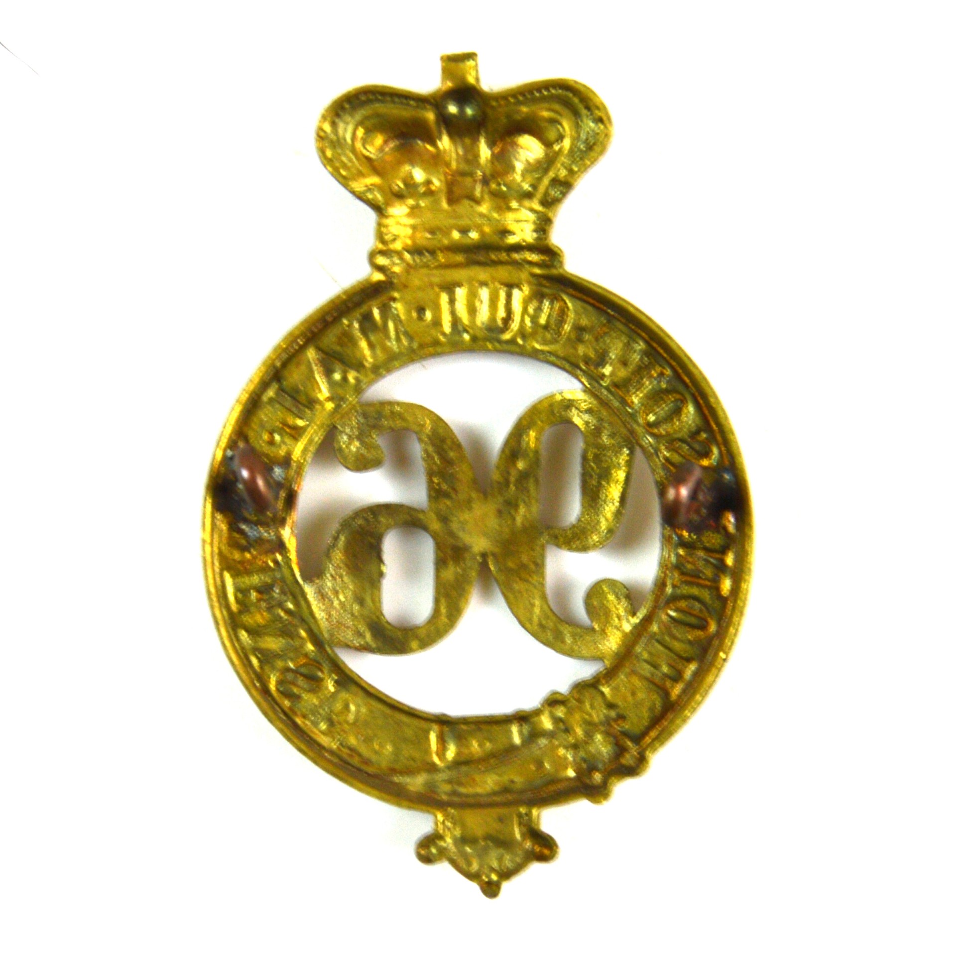 The 96th Regiment of Foot was raised on 12 December 1798 in Menorca by Lieutenant-General Sir Charles Stuart, originally from German-speaking prisoners of war of Swiss regiments in Spanish service — an origin that gave the regiment its later designation as the 96th (Queen’s Own Germans) Regiment of Foot, under which it was briefly known until its disbandment at Limerick in December 1818. Reformed in January 1824 in response to the threat posed by French intervention in Spain, the regiment was confirmed as the direct successor of the earlier formation with full continuity of battle honours. The regiment served in the Egyptian campaign of 1801, during which Private Antoine Lutz distinguished himself at the Battle of Alexandria by recovering the colour of the 21st Demi Brigade Légère, a colour that had initially been seized by a sergeant of the 42nd Foot before falling back into French hands. It subsequently served with distinction throughout the Peninsular War, fighting at Vimeiro in 1808, Talavera in 1809, Bussaco in 1810, the First Siege of Badajoz in 1811, and Albuera in 1811, before serving in Canada during the War of 1812. From 1874, the regiment wore the standard other ranks glengarry badge in brass with its regimental number and the Garter motto. On 1 July 1881 the Childers Reforms came into effect and the regiment was amalgamated with the 63rd (West Suffolk) Regiment of Foot to form the Manchester Regiment, with the numbered glengarry badge pattern ceasing at that point. The lineage of the regiment is today perpetuated by the Duke of Lancaster’s Regiment.