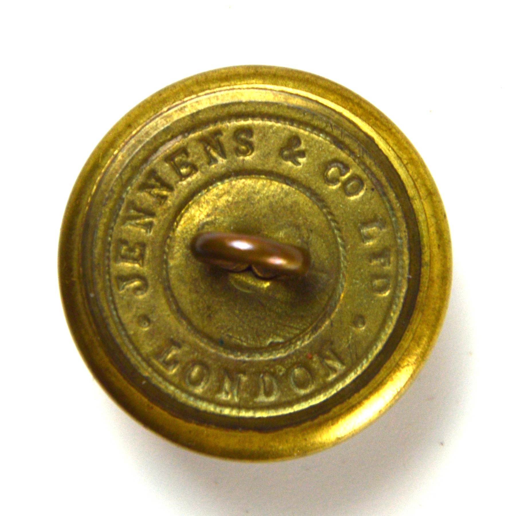 An officer’s gilt uniform button issued to the 14th (London Scottish) Battalion, County of London Regiment. The button features the regiment’s official cap badge executed in relief with a gilt finish, consistent with British Army officer dress uniform standards. Designed for attachment to tunics or ceremonial dress, the button exemplifies the formal styling of early 20th-century regimental insignia.