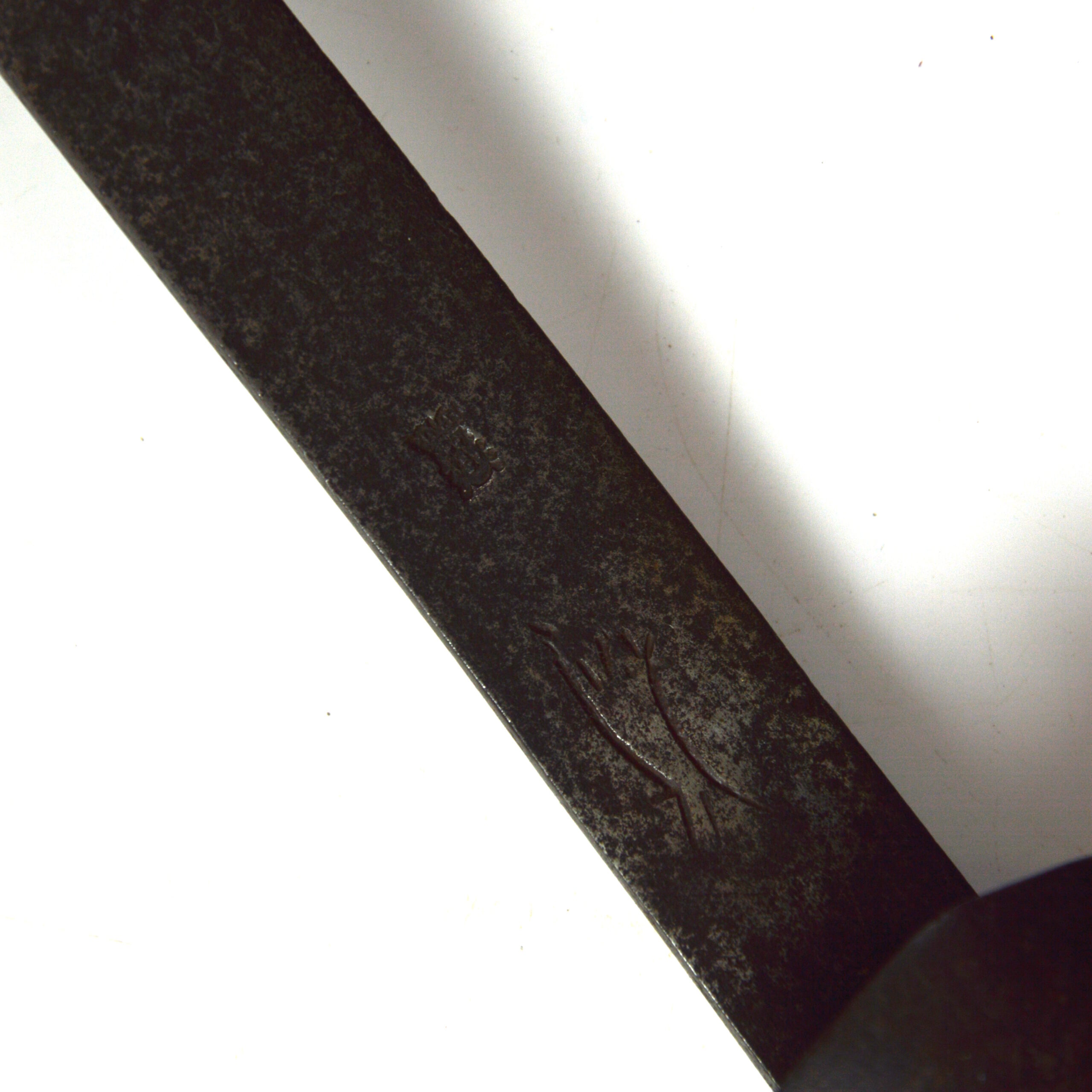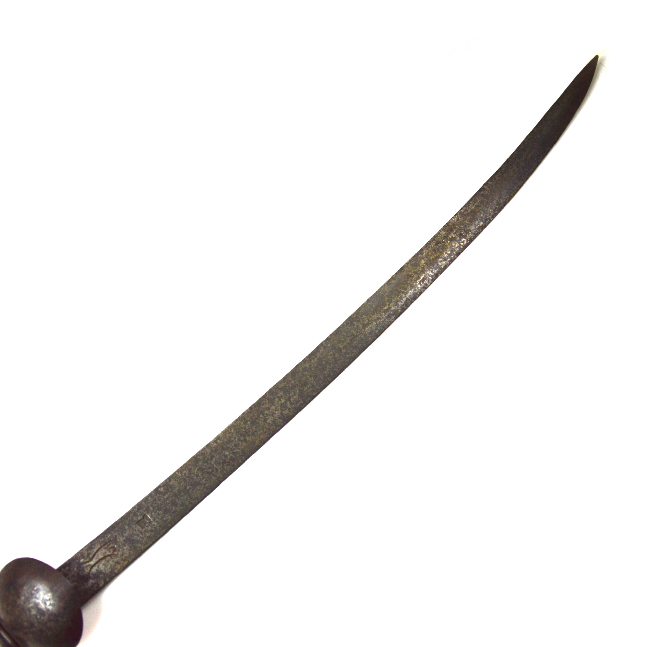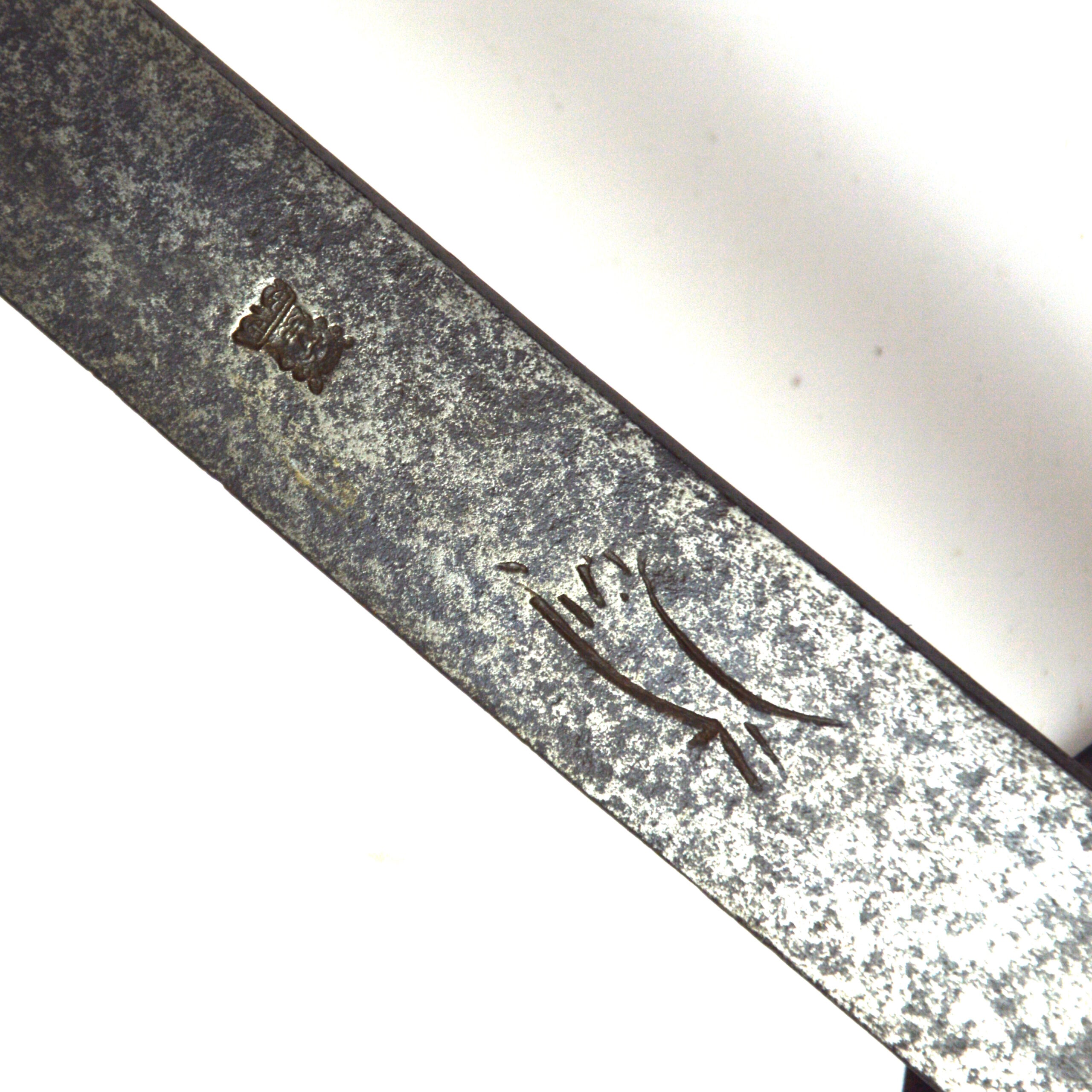 The sword features a simple, long, curved steel blade, suited to close use in hunting contexts, including the dispatch of game. Blades of Solingen origin were often prized for their quality and durability and were frequently mounted with locally produced hilts in Britain. The blade features 2 sets of maker’s or retailer’s marks, including a crowned face, associated with English retail, and a running fox or wolf, associated with Solingen at the time.