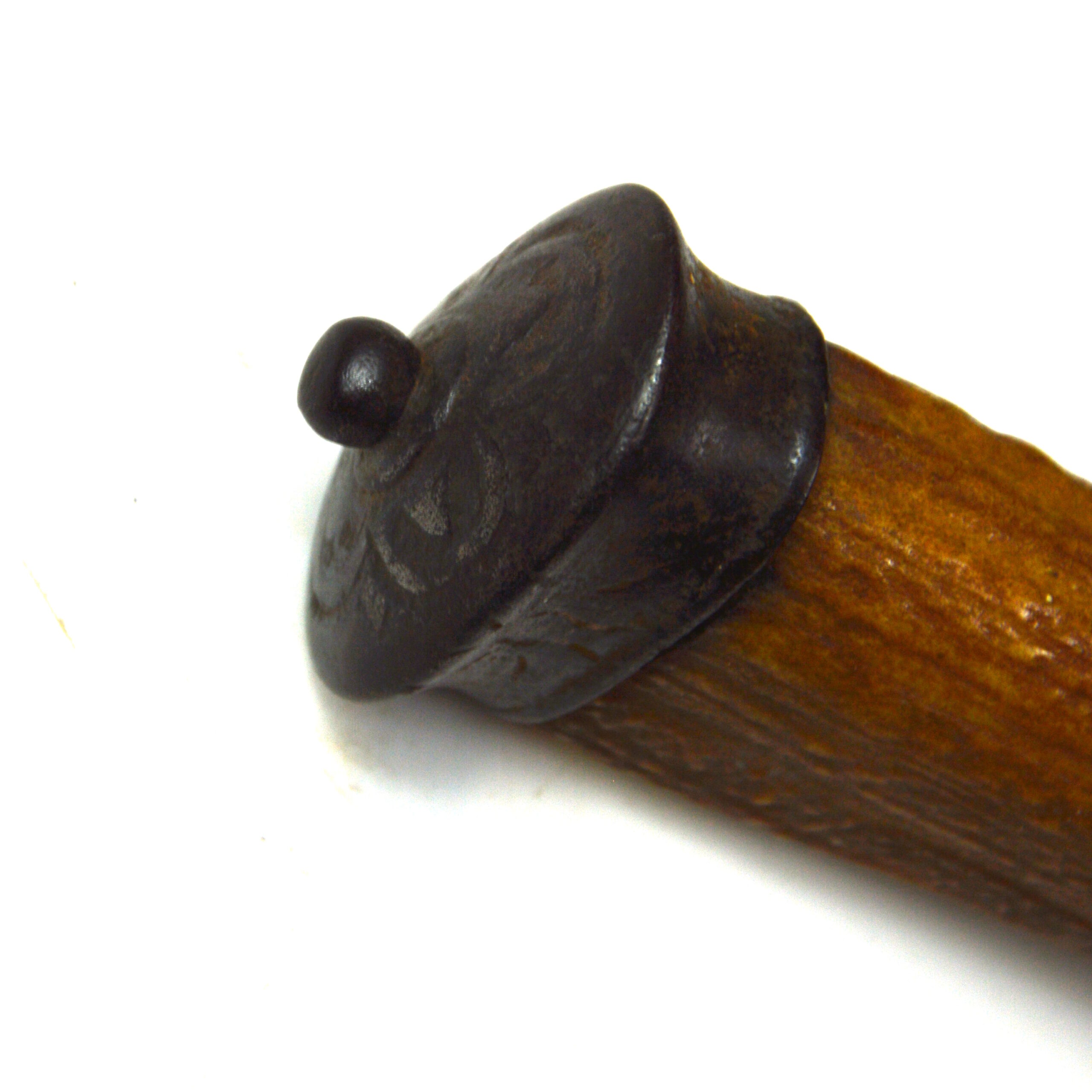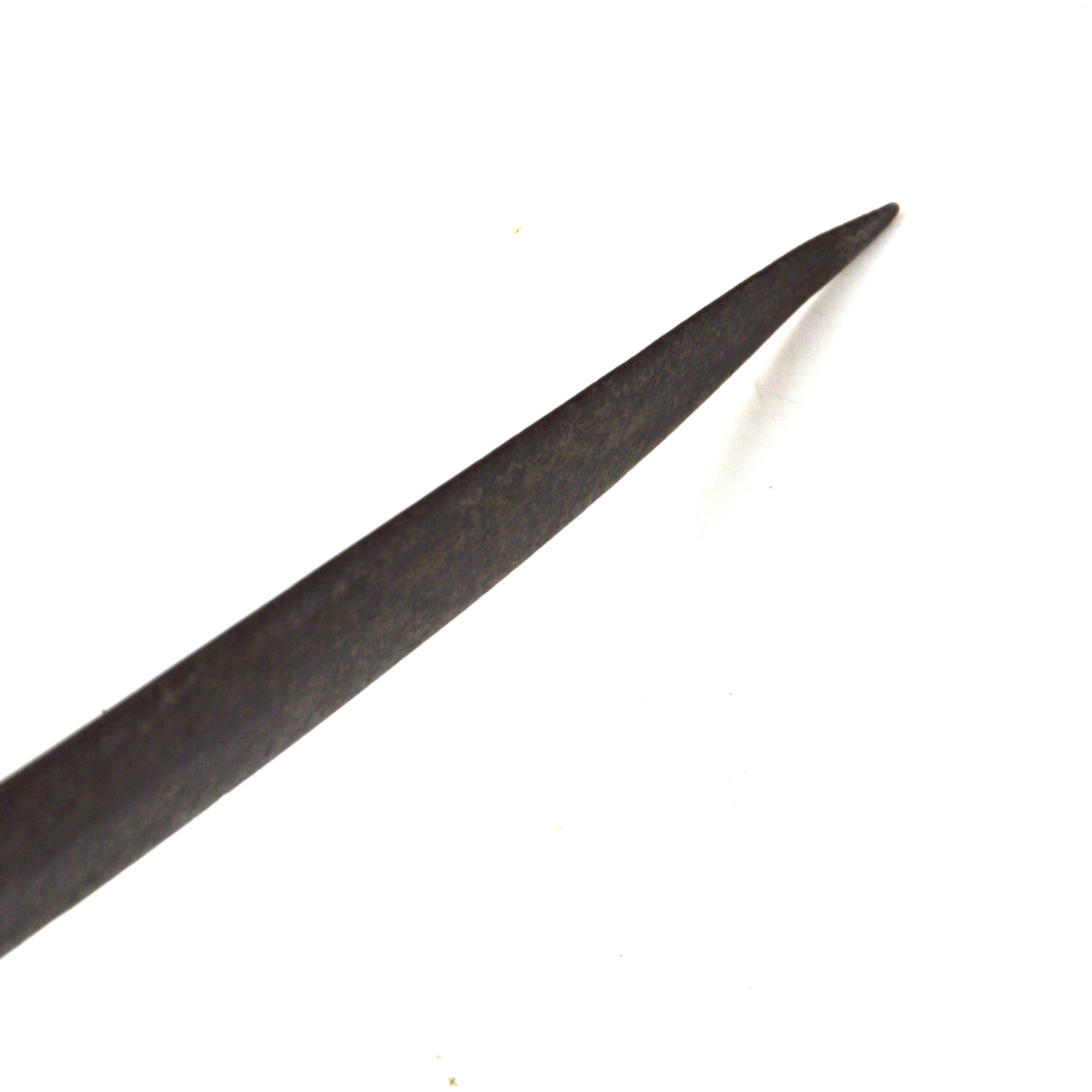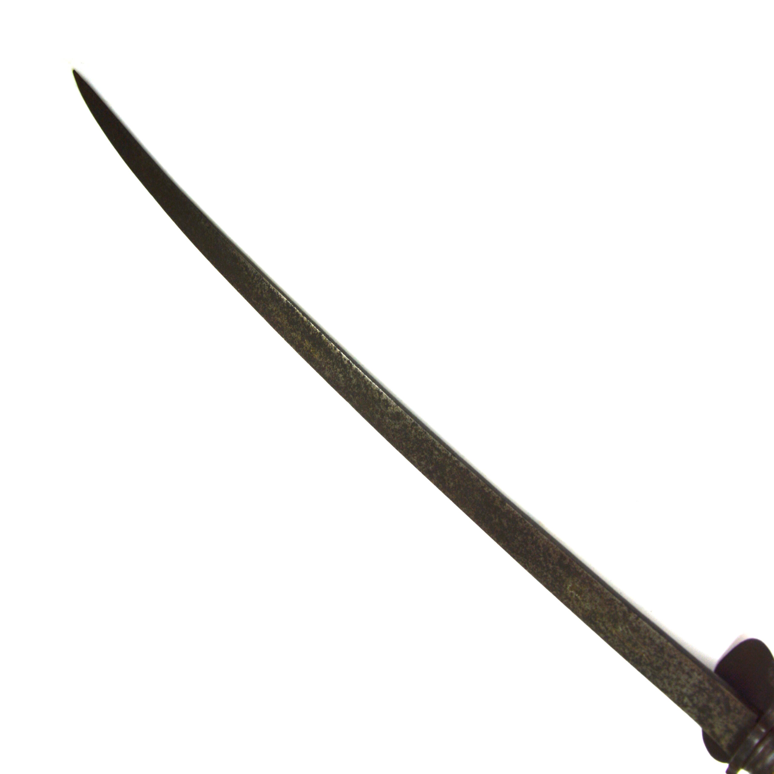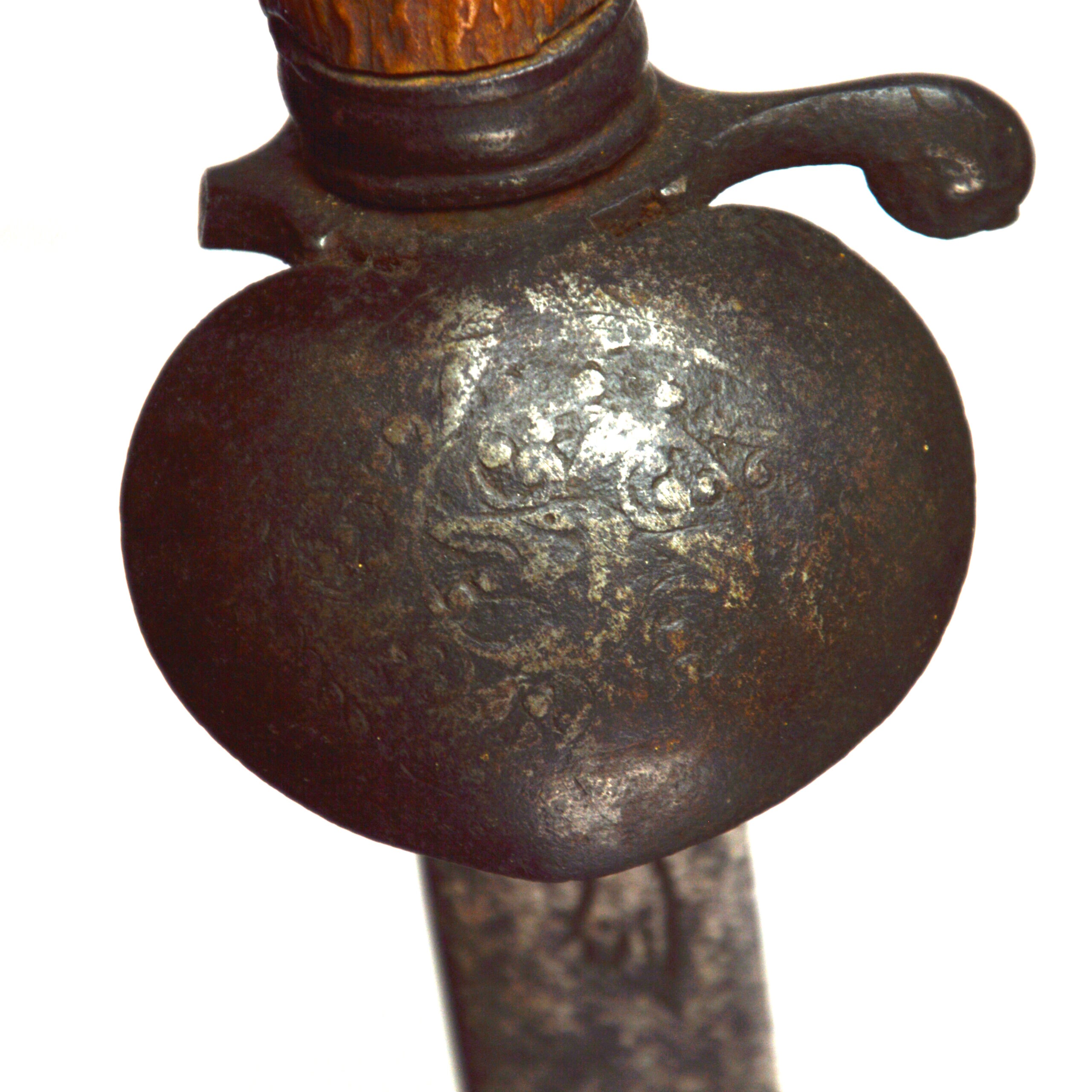 The sword features a simple, long, curved steel blade, suited to close use in hunting contexts, including the dispatch of game. Blades of Solingen origin were often prized for their quality and durability and were frequently mounted with locally produced hilts in Britain. The blade features 2 sets of maker’s or retailer’s marks, including a crowned face, associated with English retail, and a running fox or wolf, associated with Solingen at the time.
