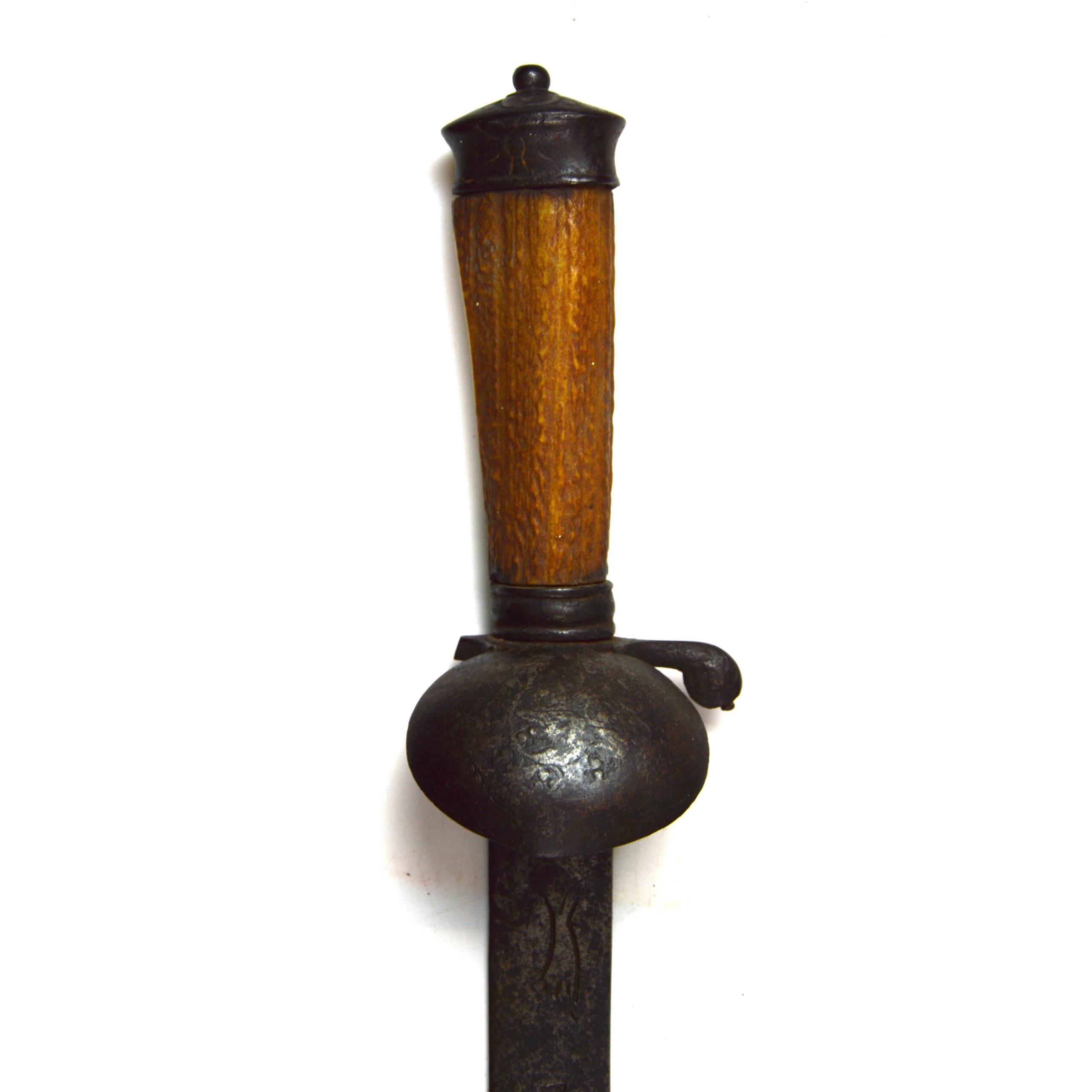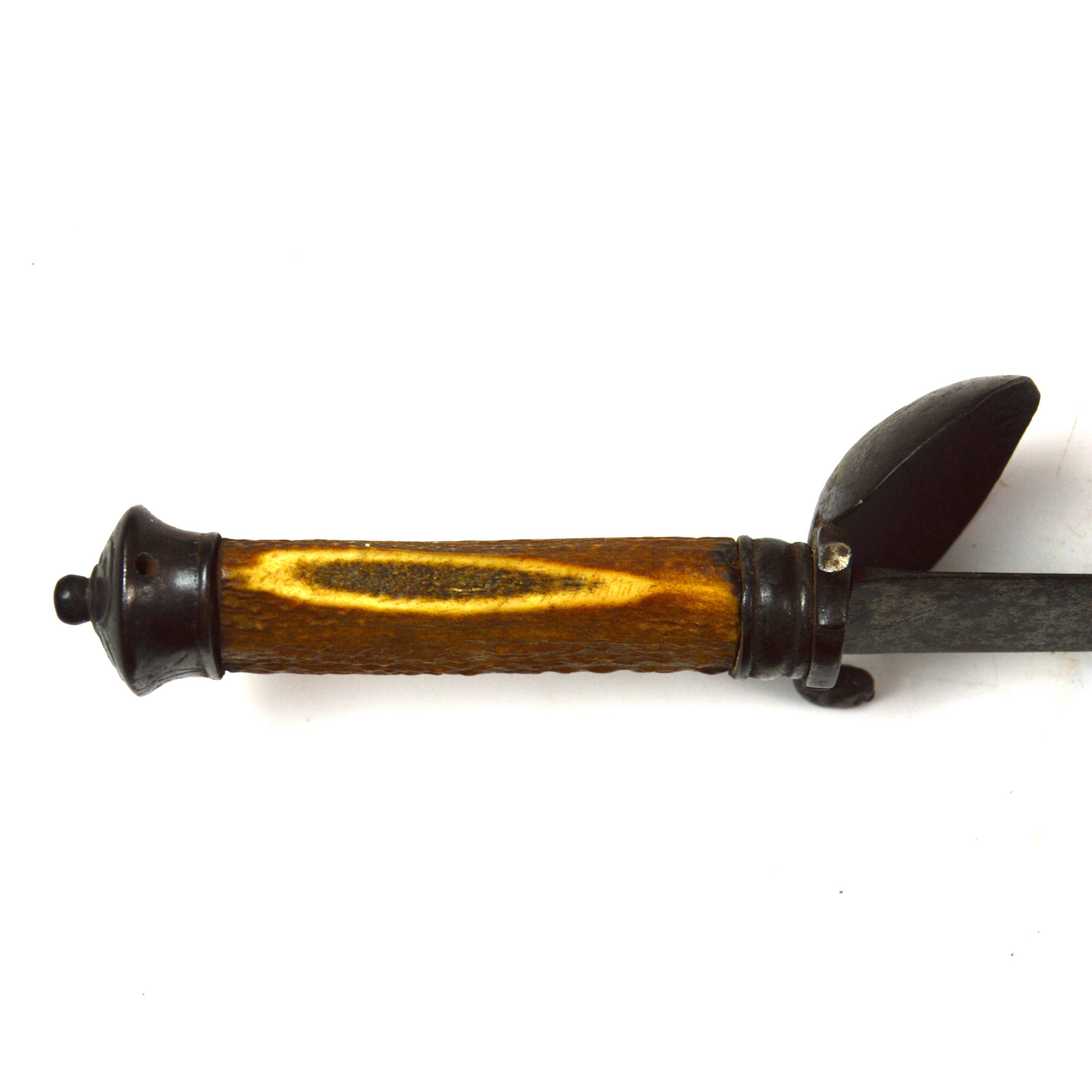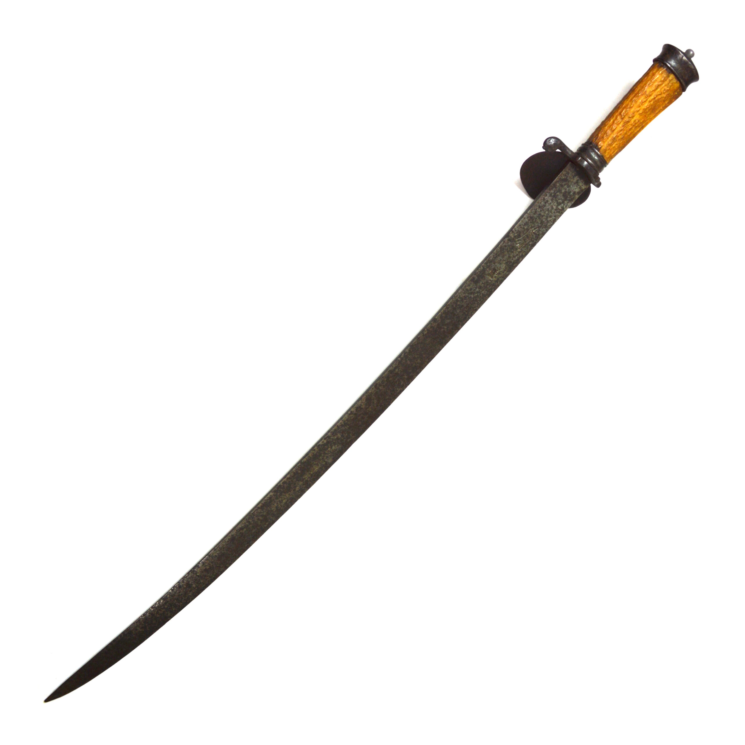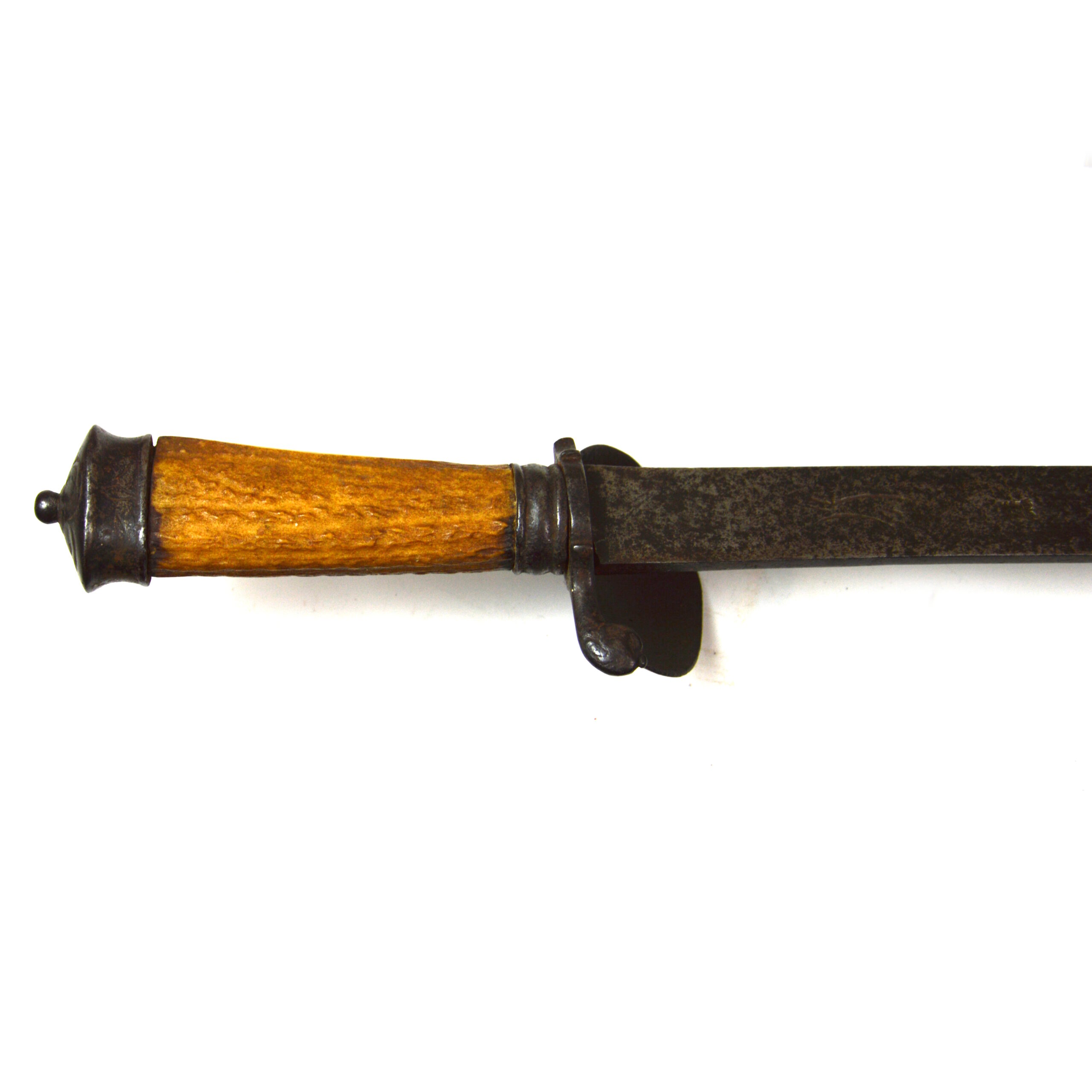The hilt form on hunting swords of this era includes an ornate steel crossguard with a guard shell and would’ve originally had a knuckle bow hand guard for knuckle protection. This is accompanied by a grip of antler horn and a modest engraved steel pommel. These weapons occupied a space between functional tools and status items, often carried as part of hunting dress and occasionally serving as personal and naval sidearms.