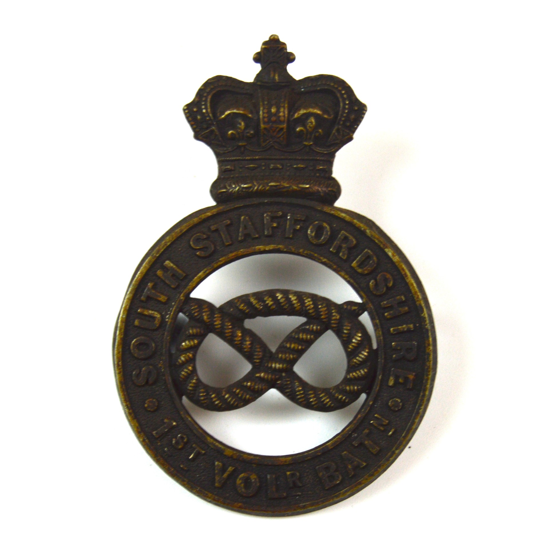 An original Victorian-era Glengarry badge worn by the 1st Volunteer Battalion of the South Staffordshire Regiment, dating from approximately 1878 to 1902. This pattern represents the early insignia worn by Volunteer Force units before the formation of the Territorial Force in 1908.