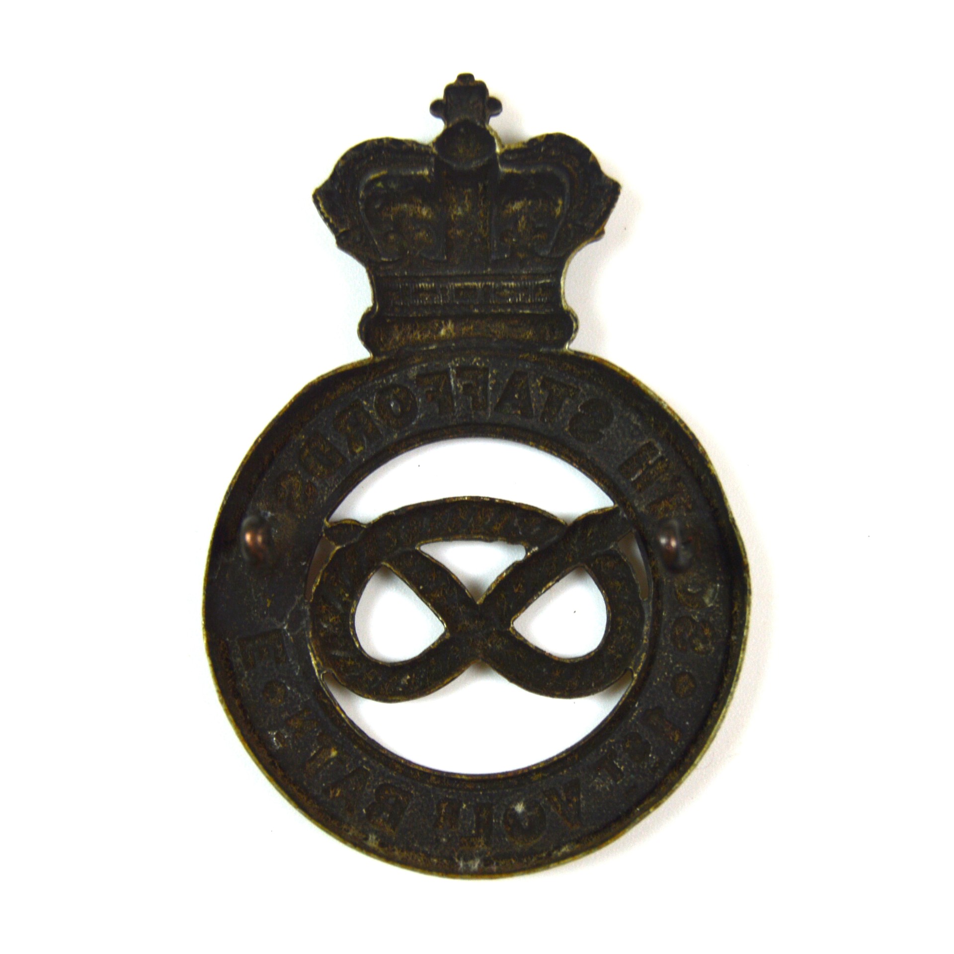 Die-struck in white metal and blackened, the badge features a crowned circlet that reads “South Staffordshire/1st Volr Batn”, within which sits the Staffordshire Knot. At the top is the Queen Victoria Crown, firmly placing this pattern from the late 19th century to the very early 20th century. The reverse is fitted with two original copper lugs (loops), consistent with Glengarry fittings of the period. Badges like this were worn on the Glengarry cap, a popular undress headgear for Volunteer battalions, particularly in the latter half of the 19th century.
