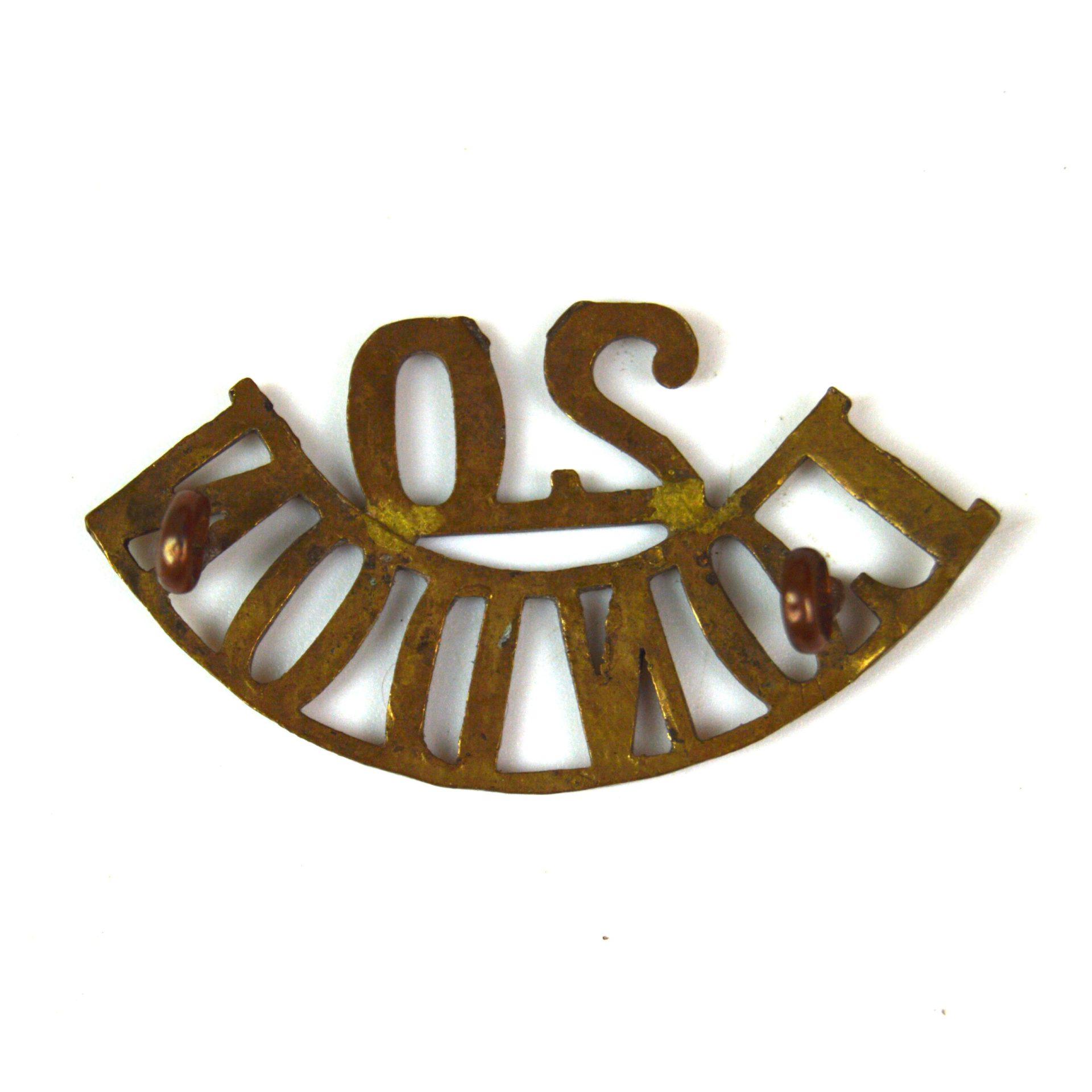 A genuine shoulder title. 20th Battalion (Blackheath and Woolwich), The London Regiment Shoulder Title, Original. A collectable piece of British military insignia.