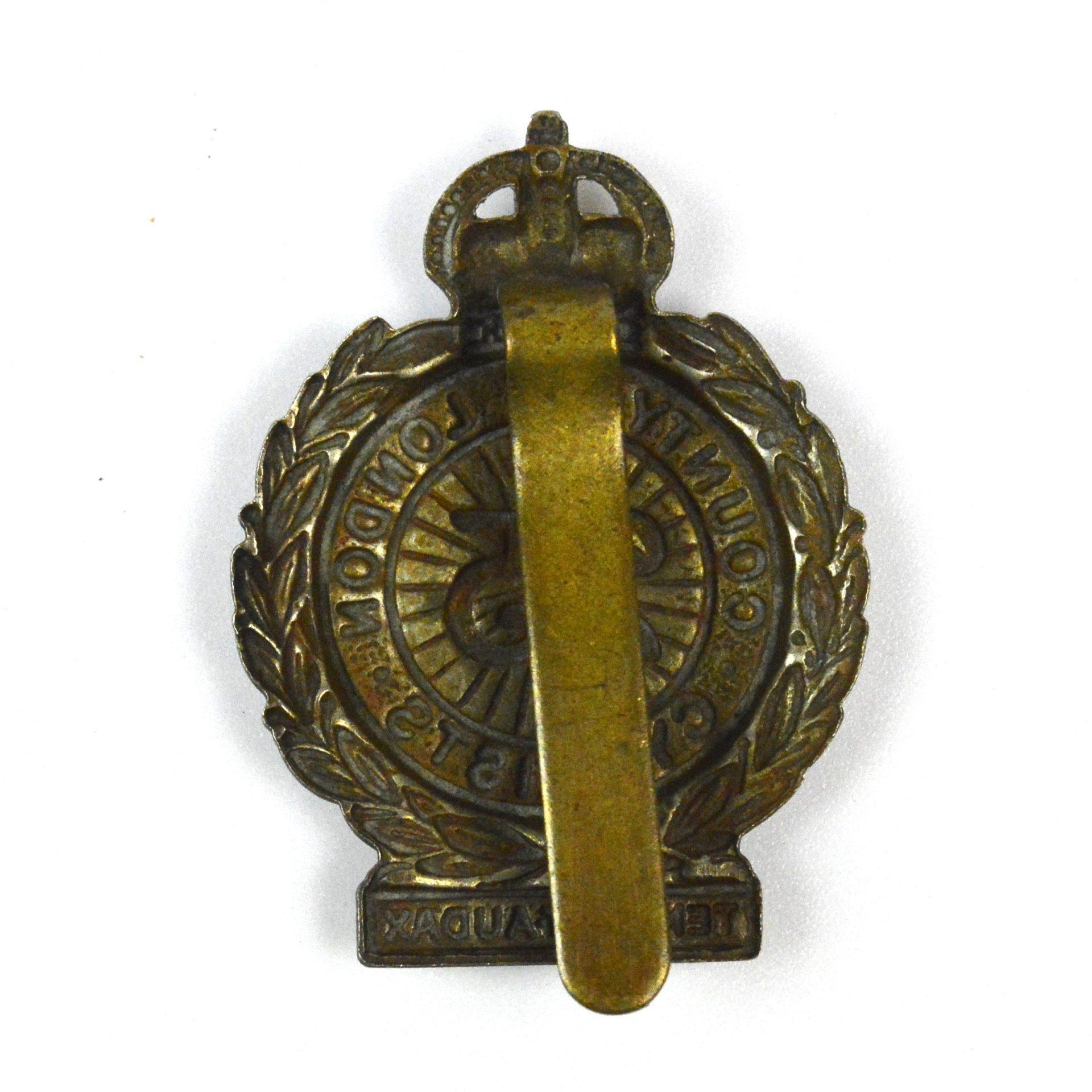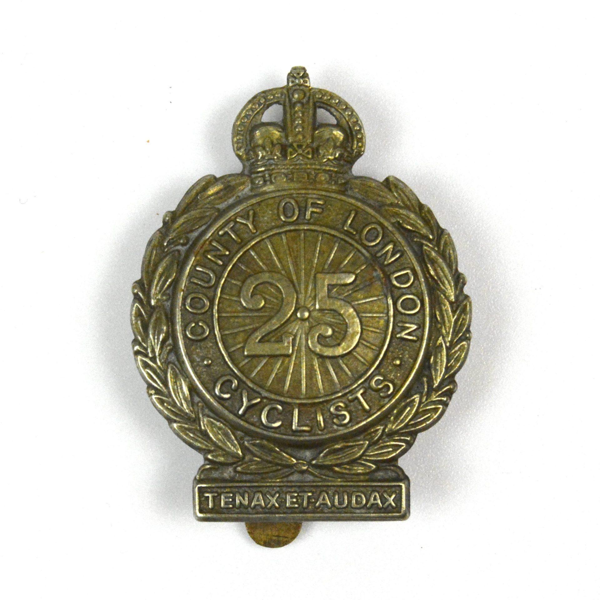 A restrike white metal cap badge of the 25th Battalion (Cyclists), County of London Regiment Cap Badge. A collectable piece of British military insignia.
