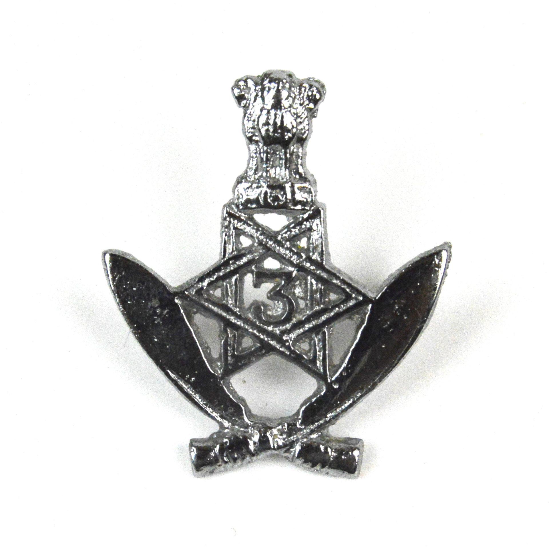 Crossed Kukri’s, points uppermost, supporting a double trinity star, with arabic ‘3’ in centre, Ashoka’s Lions above.