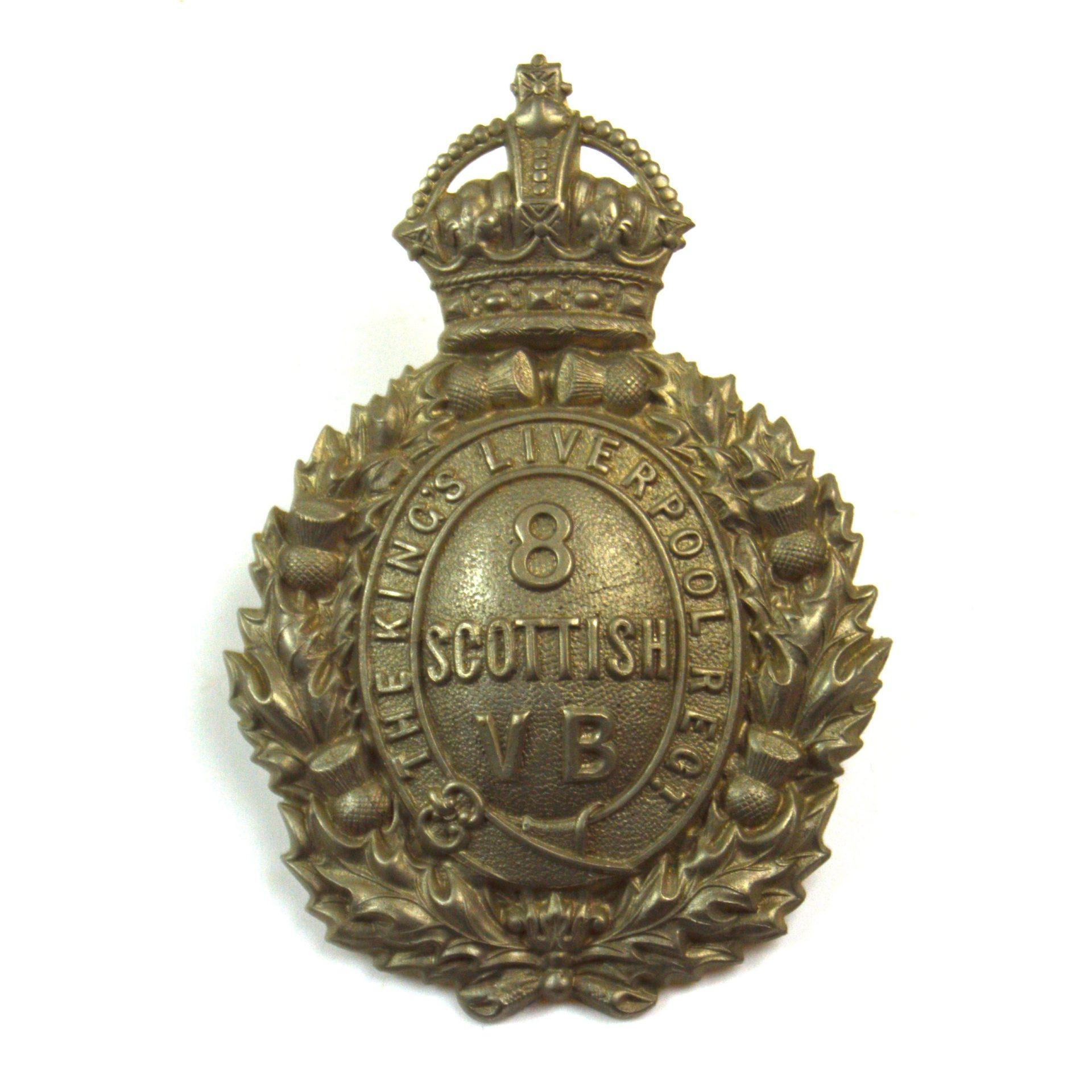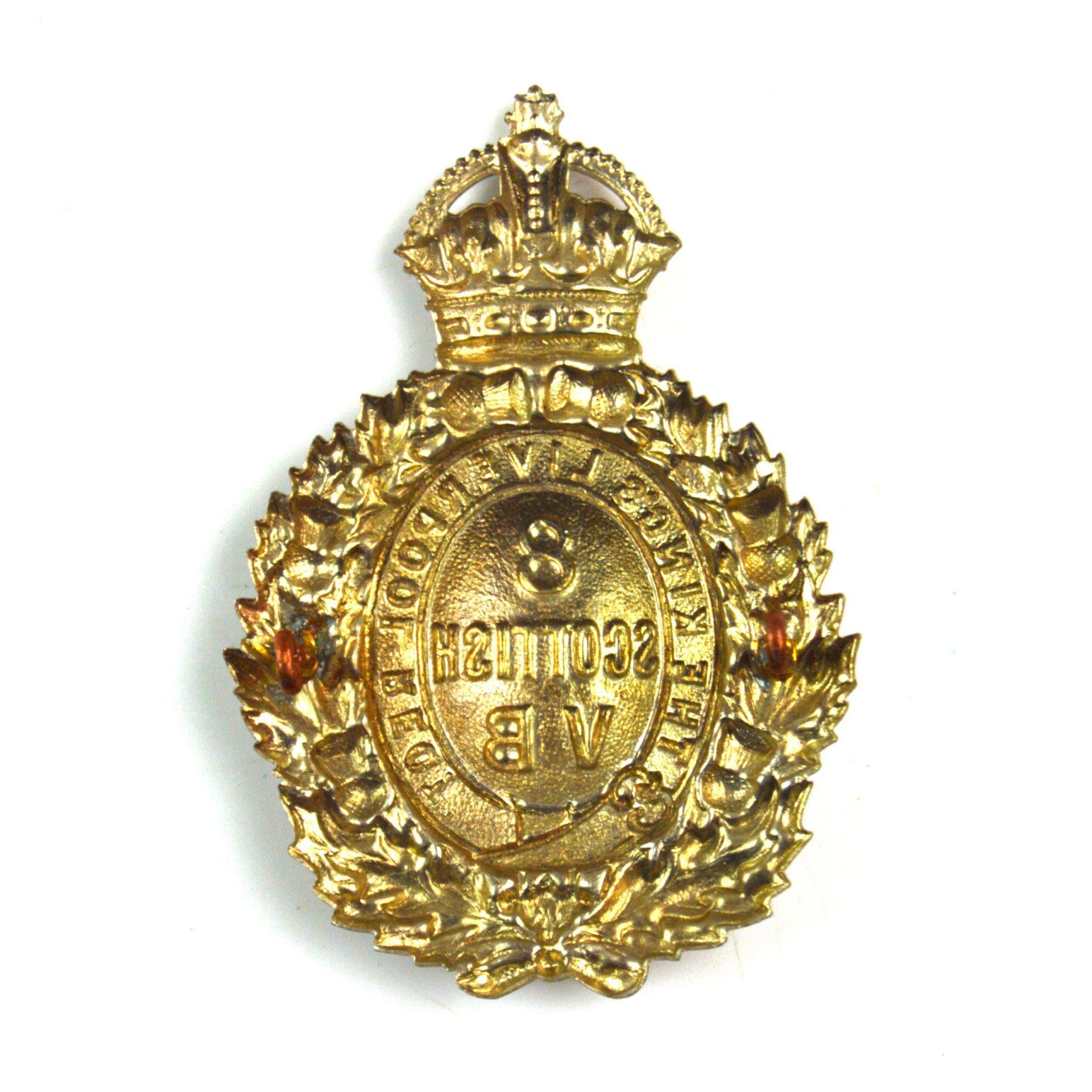 A restrike helmet plate of the 8th Scottish Volunteer Battalion, King’s Liverpool Regiment. A collectable piece of British military insignia.