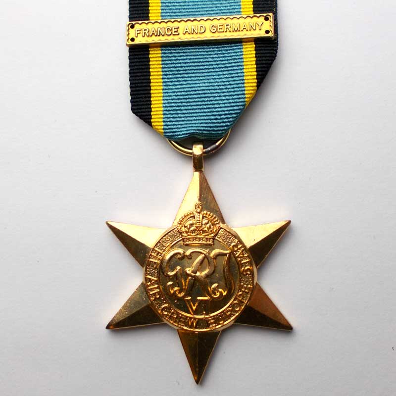 Six pointed star with a circular centre and the GRI/VI monogram, surmounted by a crown and inscribed “THE AIR CREW EUROPE STAR”