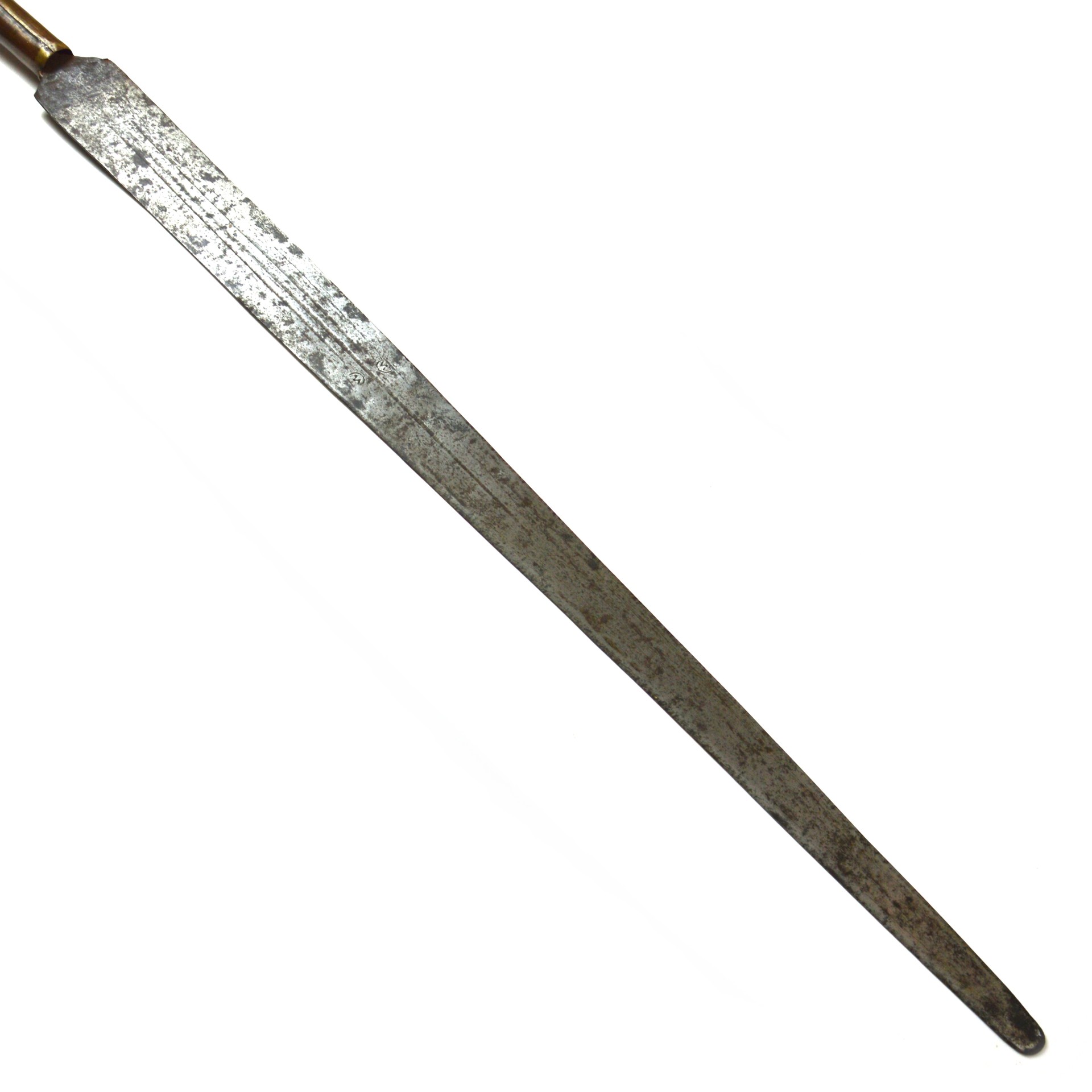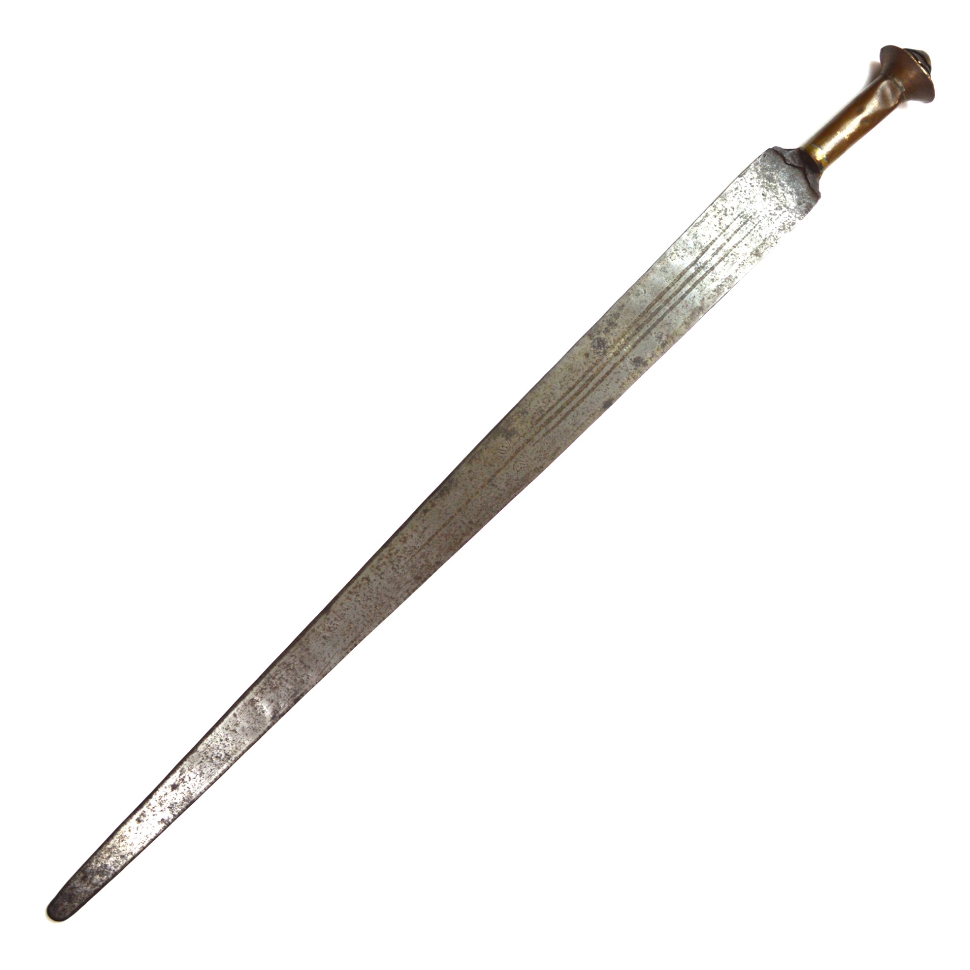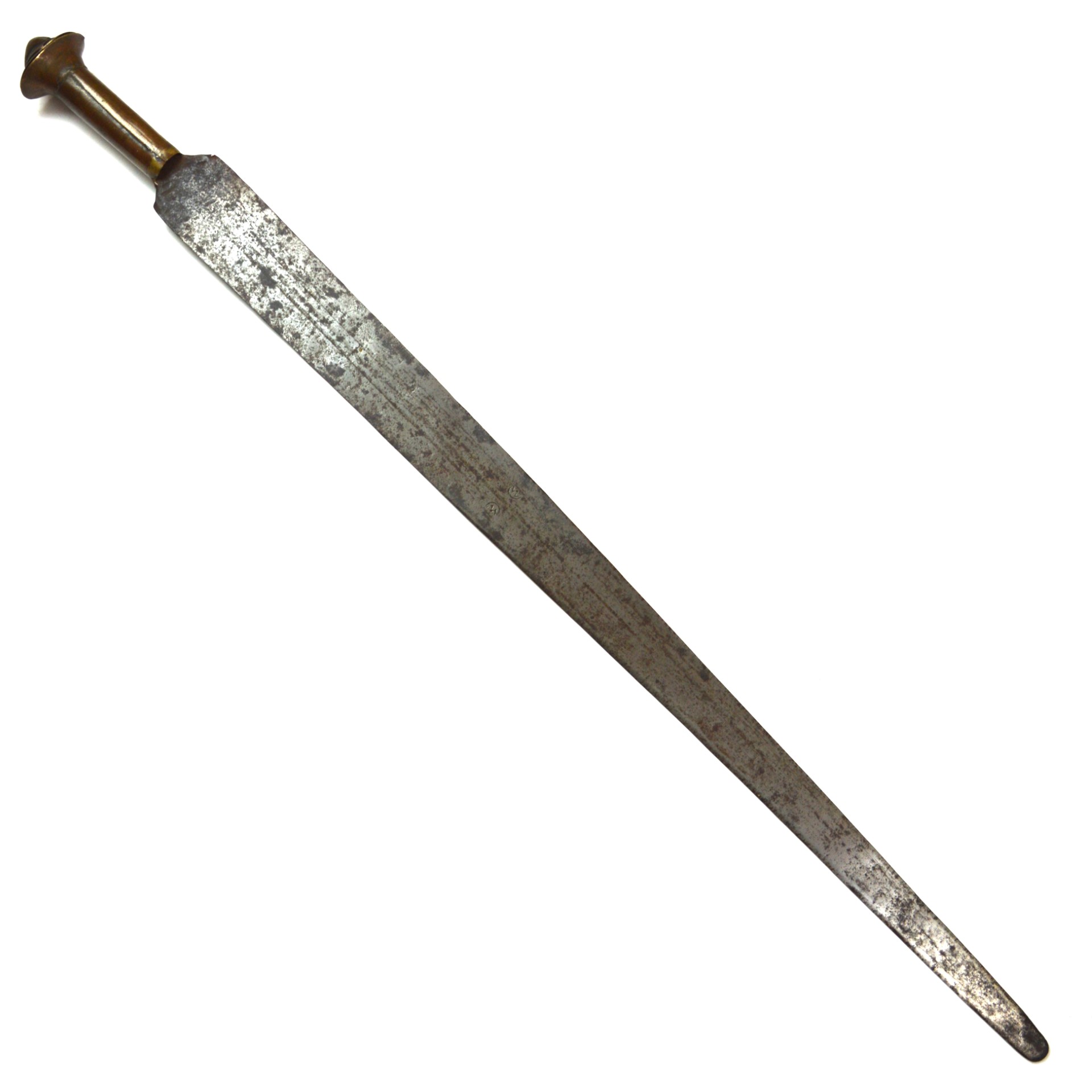 Good overall condition, with age-related wear consistent with use and environmental exposure. The blade shows patina and surface marks typical of age. The hilt covering exhibits wear and minor dents from handling and storage. Absence of a crossguard should be noted.