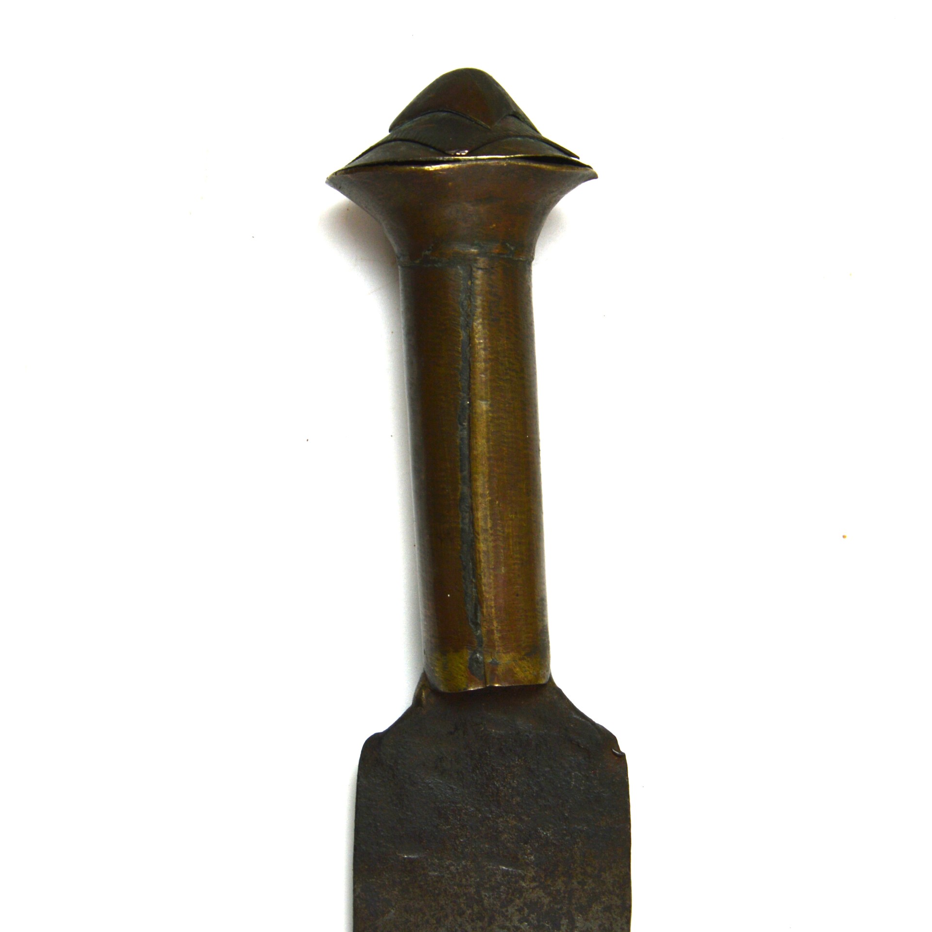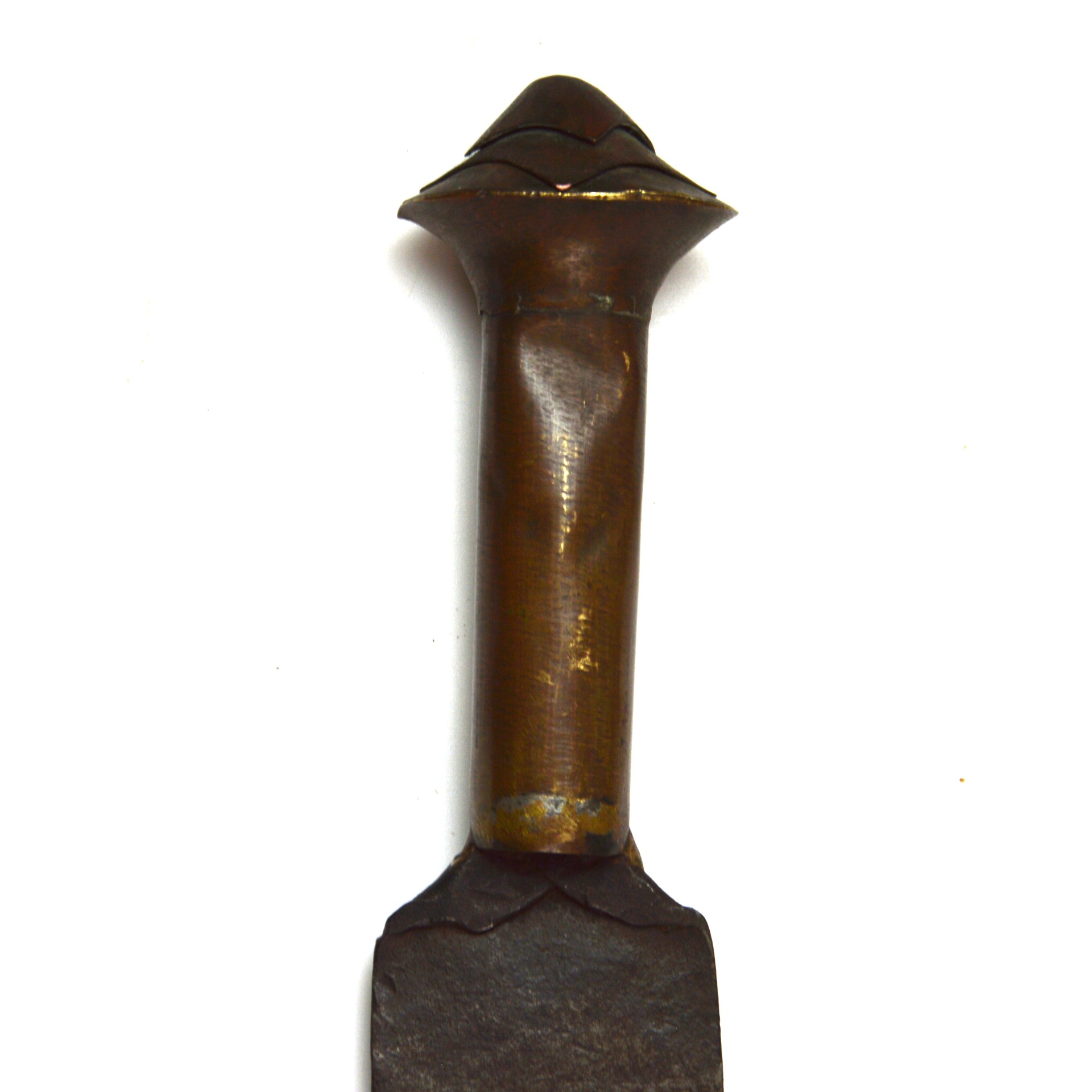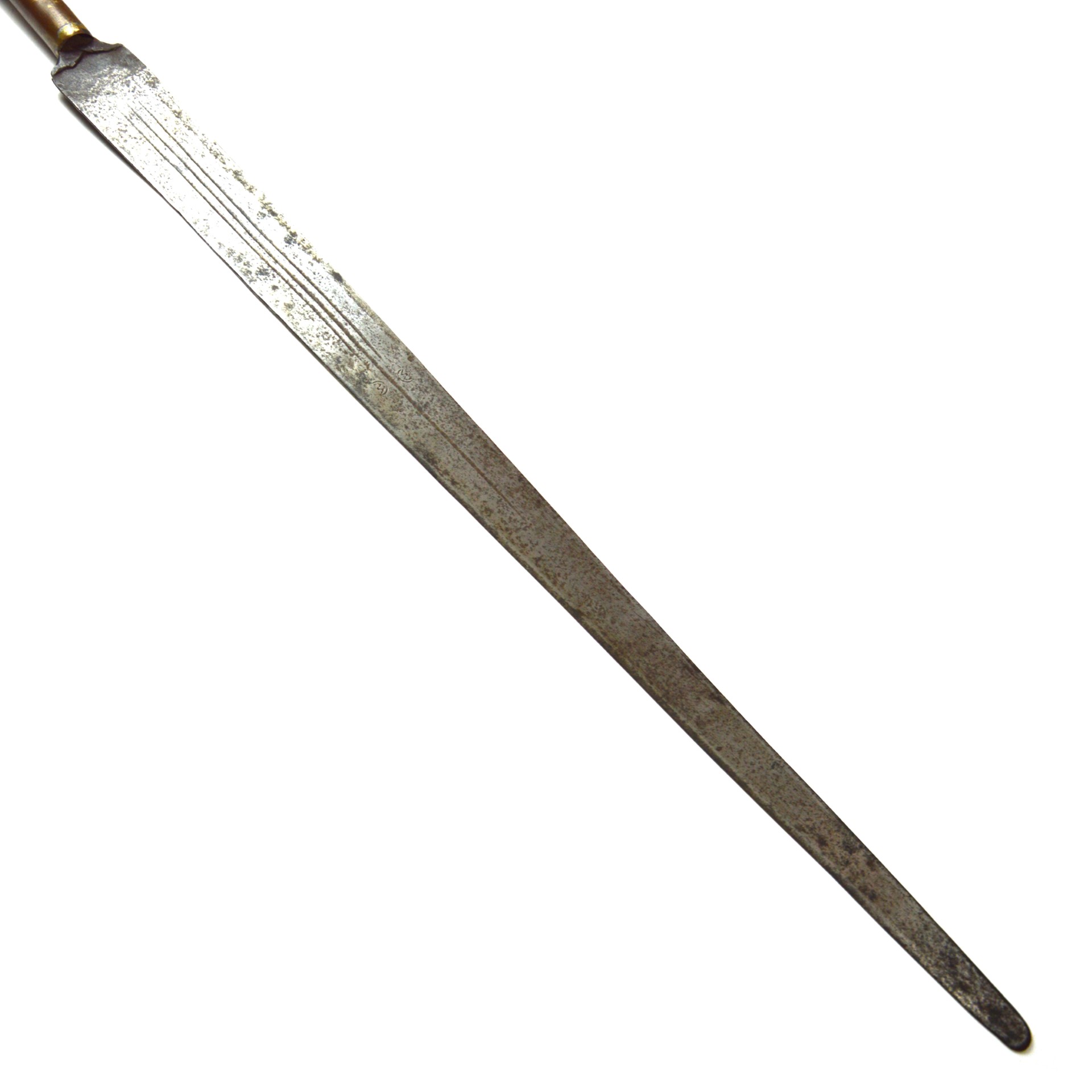 Good overall condition, with age-related wear consistent with use and environmental exposure. The blade shows patina and surface marks typical of age. The hilt covering exhibits wear and minor dents from handling and storage. Absence of a crossguard should be noted.