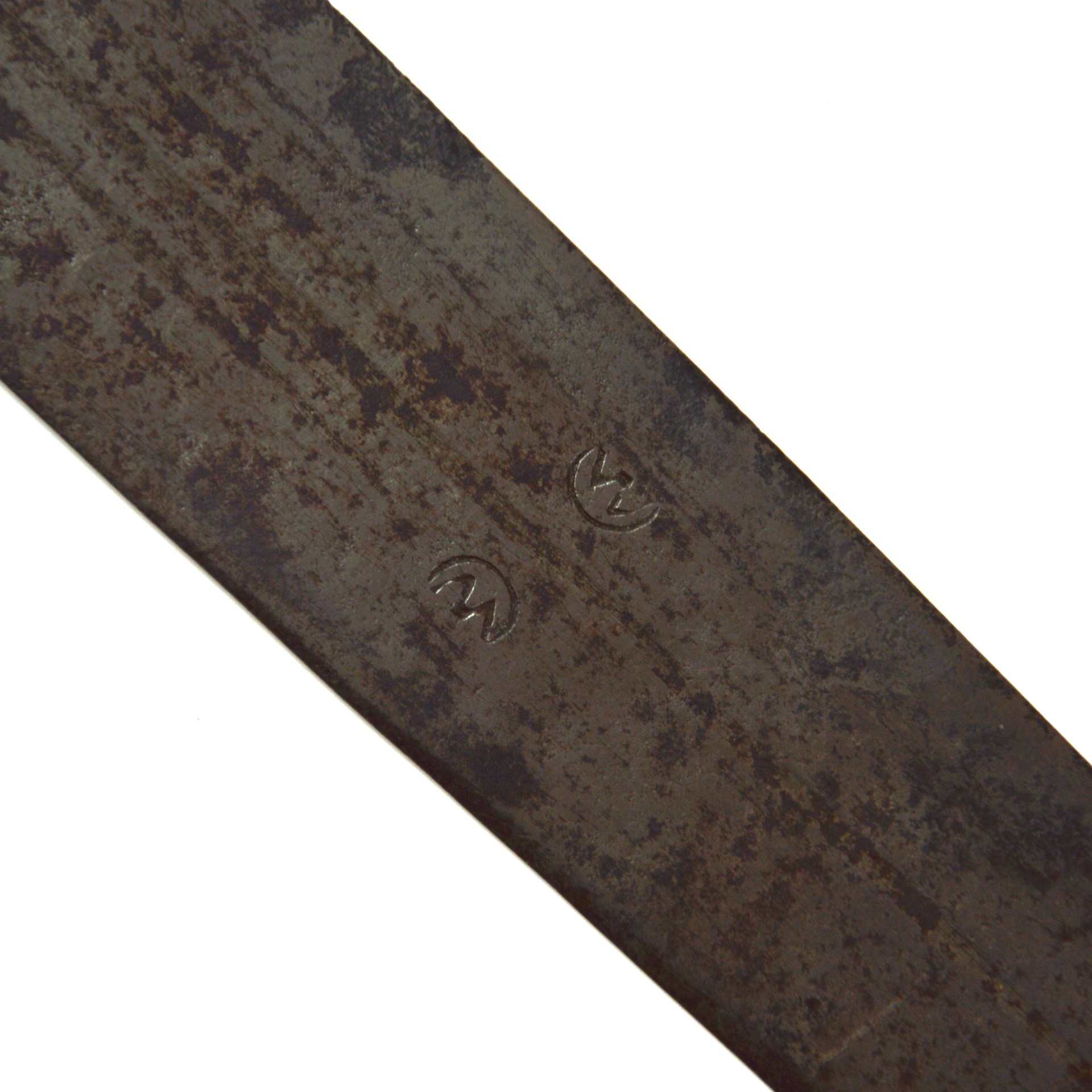 Antique Tuareg Takoba sword, a traditional edged weapon of the Saharan and Sahel regions, associated with the nomadic Tuareg, the Hausa, and the Fulani peoples of North and West Africa, presented here in a form lacking the typical crossguard. The Takoba sword is characterised by its long, straight, double-edged blade with typical crescent moon markings seen in Saharan and Sahel swords, often inspired or repurposed from earlier European or locally forged origins, mounted in a distinctive hilt which originally would have likely been covered in leather with decorative elements reflecting regional craftsmanship.
