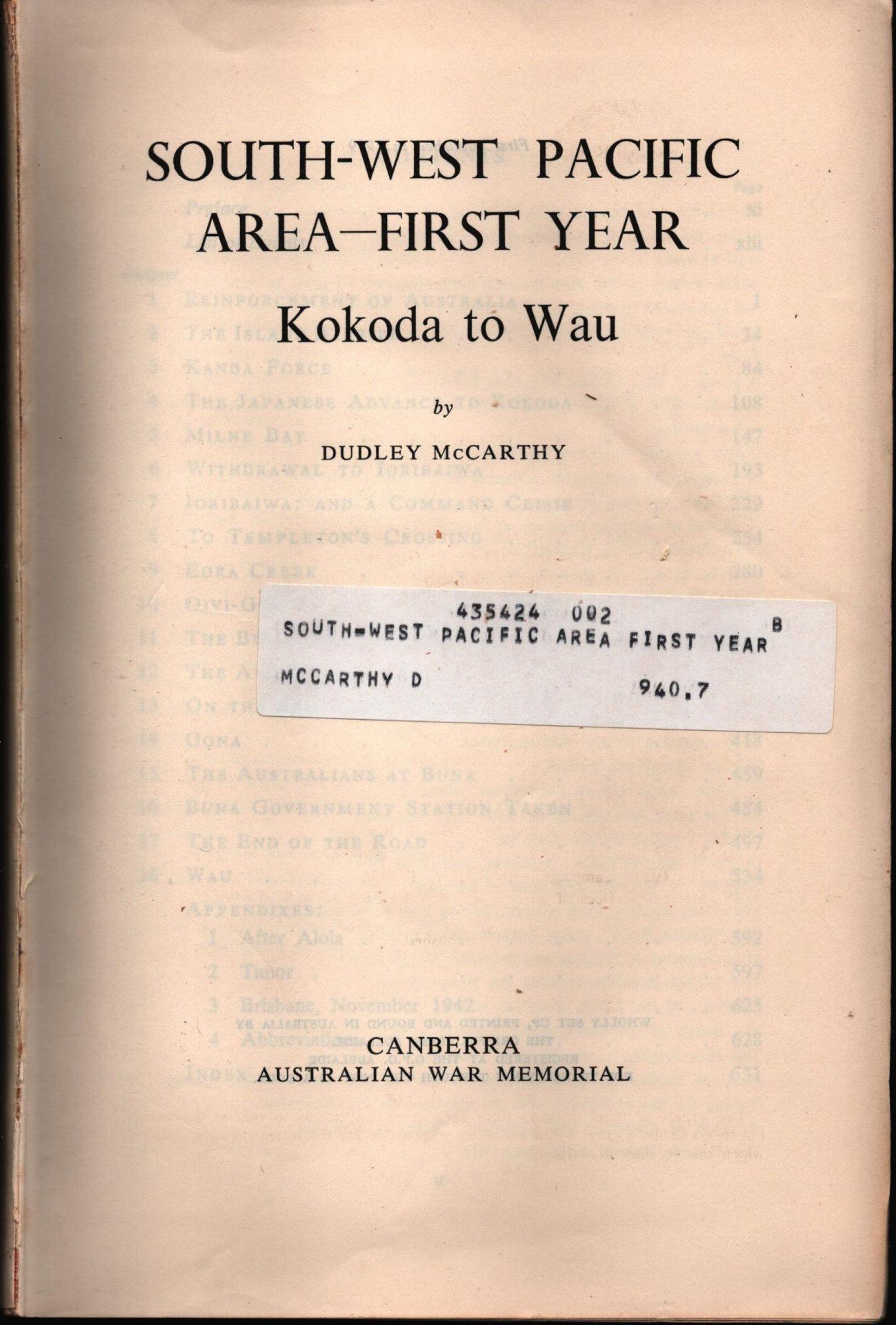 Australia in the War of 1939-45, Army, South-West Pacific Area, First Year, Kokoda to Wau. A 20th century military publication. Essential reading for the military book collector.