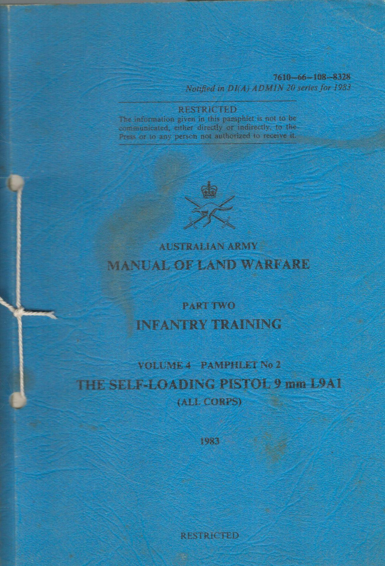 AUSTRALIAN ARMY MANUAL OF LAND WARFARE. PART TWO: INFANTRY TRAINING. VOLUME 4 PAMPHLET NO 2 THE SELF-LOADING PISTOL 9mm L9A1Availability: Only 1 left in stock
