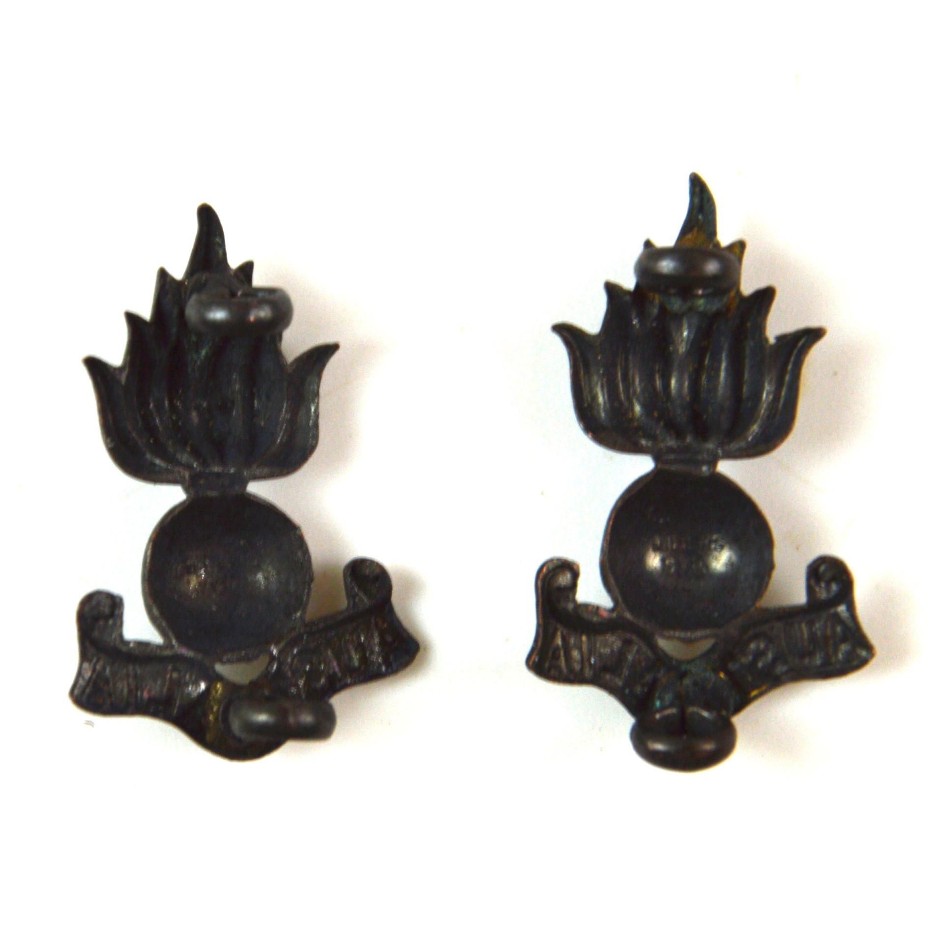 Royal Australian Engineers collar badges were produced as a facing pair in bronze, in the pattern worn from 1907 by the Australian Engineers of the Australian Army. These Australian Army engineer corps collar badges display the recognised flaming grenade in clear relief, surmounting “AUSTRALIA” in a scroll. The bronze construction is consistent with the oxidised finish commonly applied to Australian badges of this period, distinguishing them from the brass badges of the same pattern.