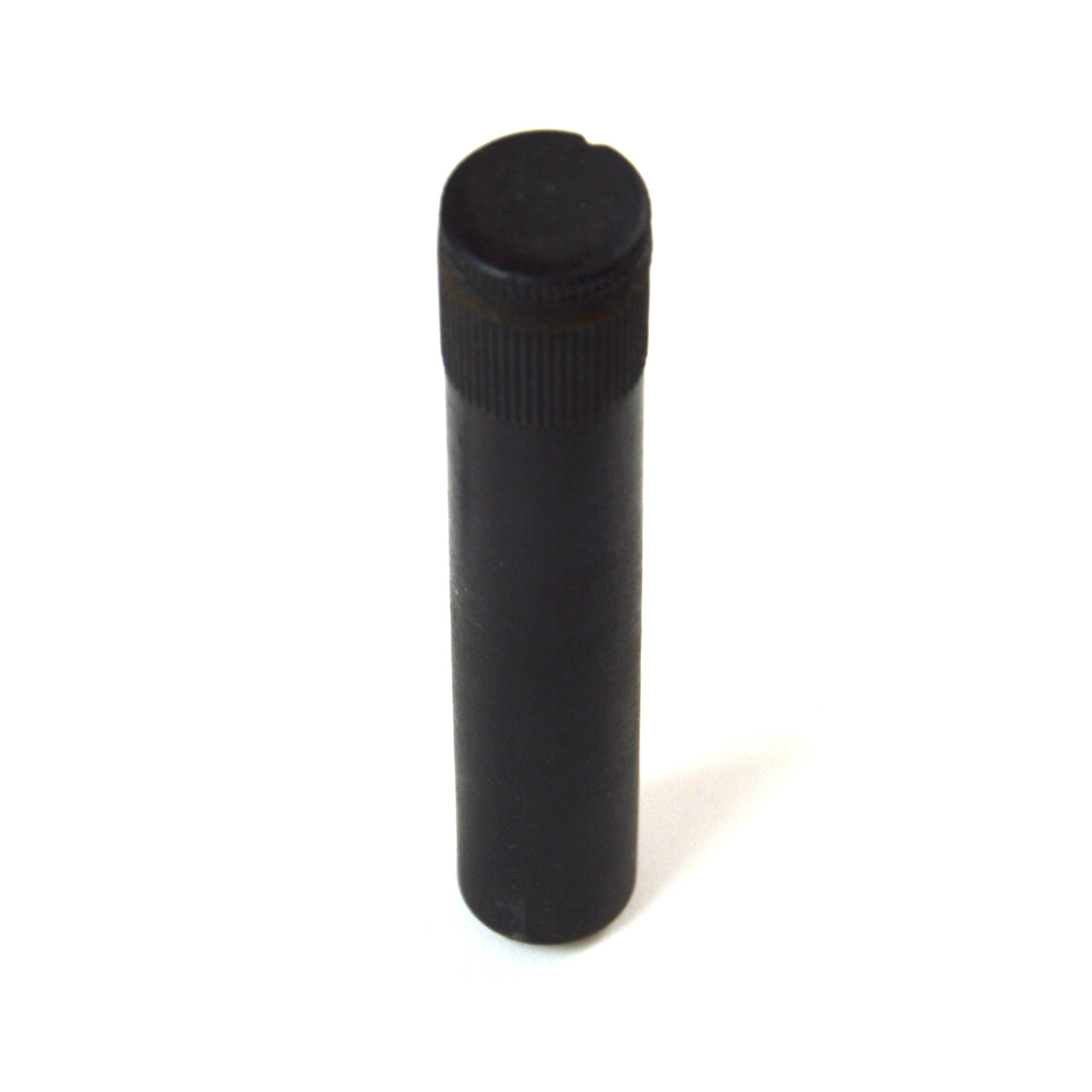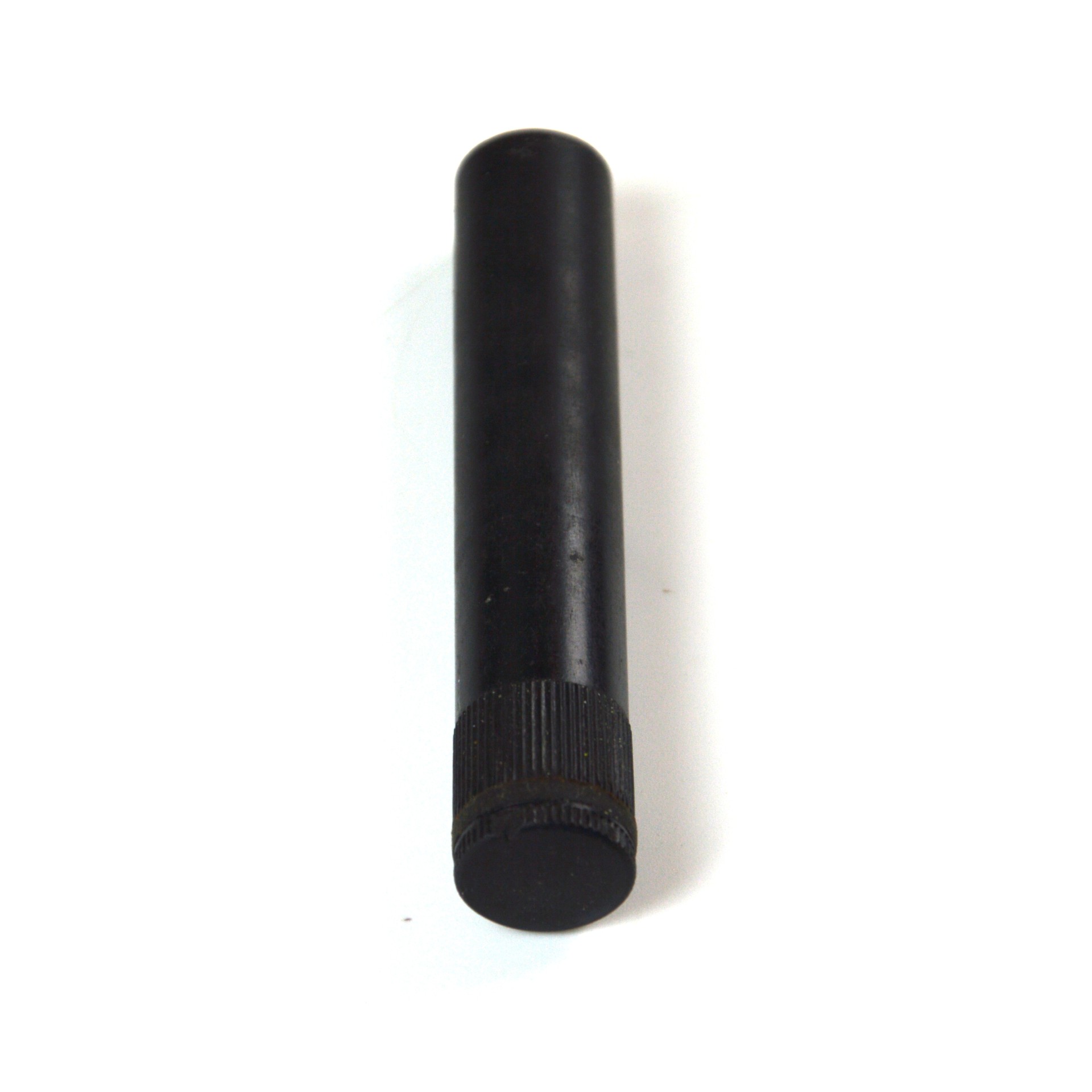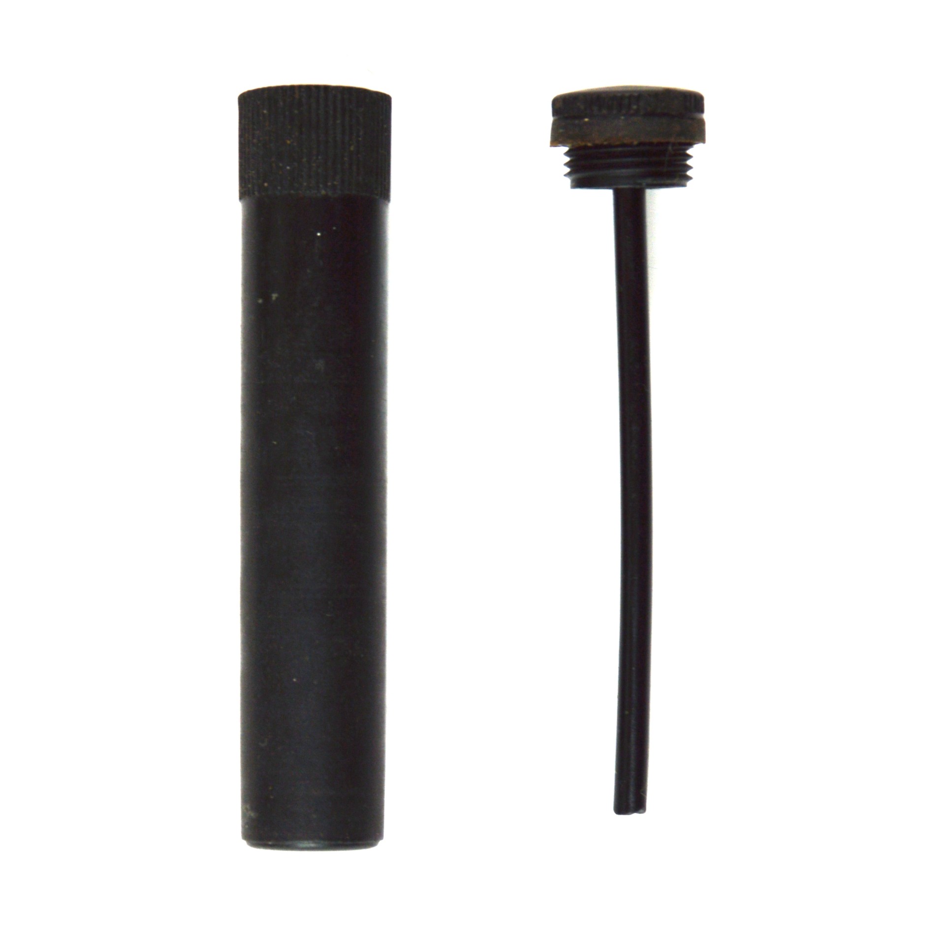 Black plastic oil bottle designed for the application and storage of lubricating oil used in the maintenance of rifles and pistols. This compact container features a simple, functional design, comprising a cylindrical body with a screw top with an application rod, allowing controlled dispensing of oil for cleaning and preservation of metal components.