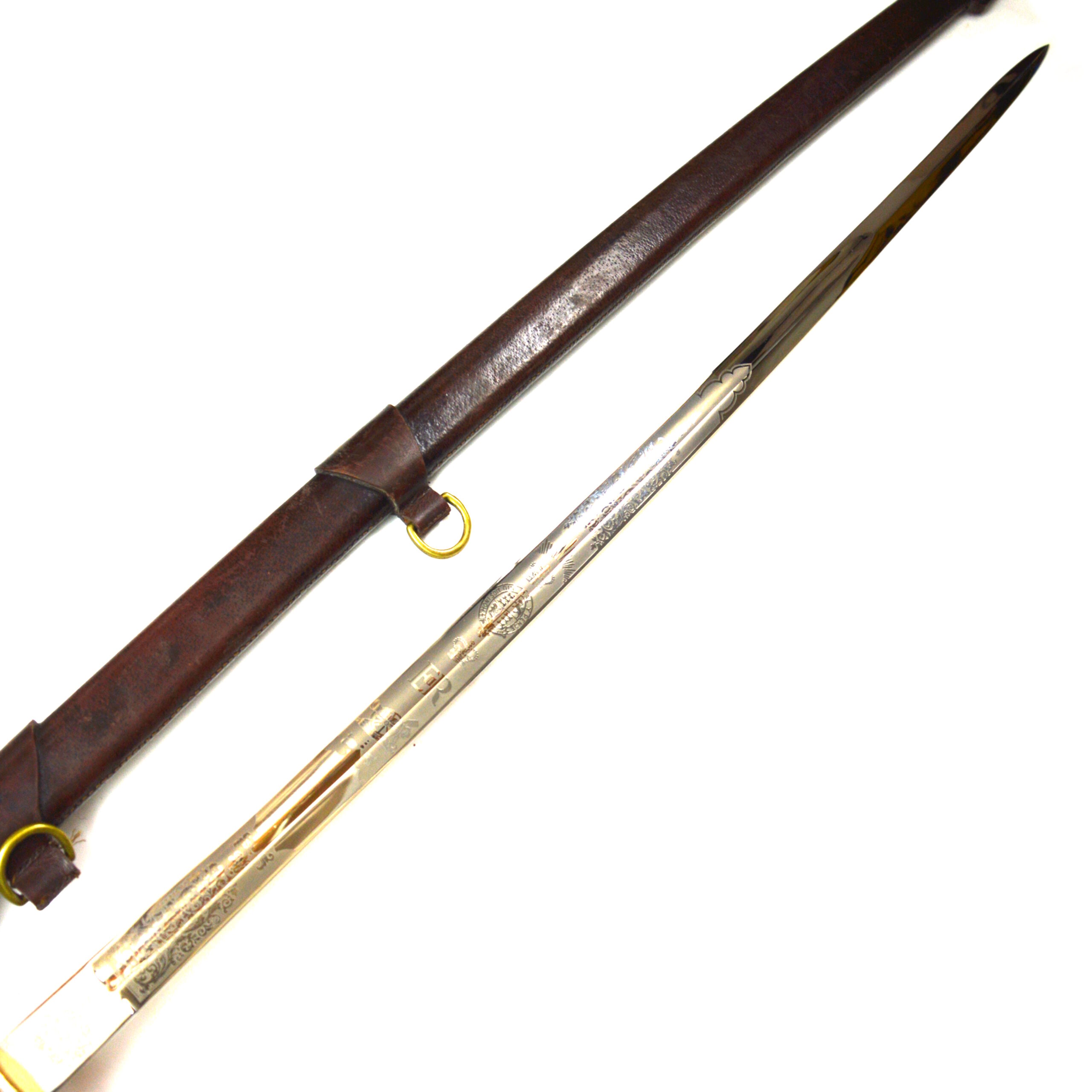Excellent overall condition, with clear blade etching and a well-preserved hilt. Minimal signs of wear consistent with ceremonial use. The scabbard remains intact and in similarly good condition. No significant damage or repairs are evident.