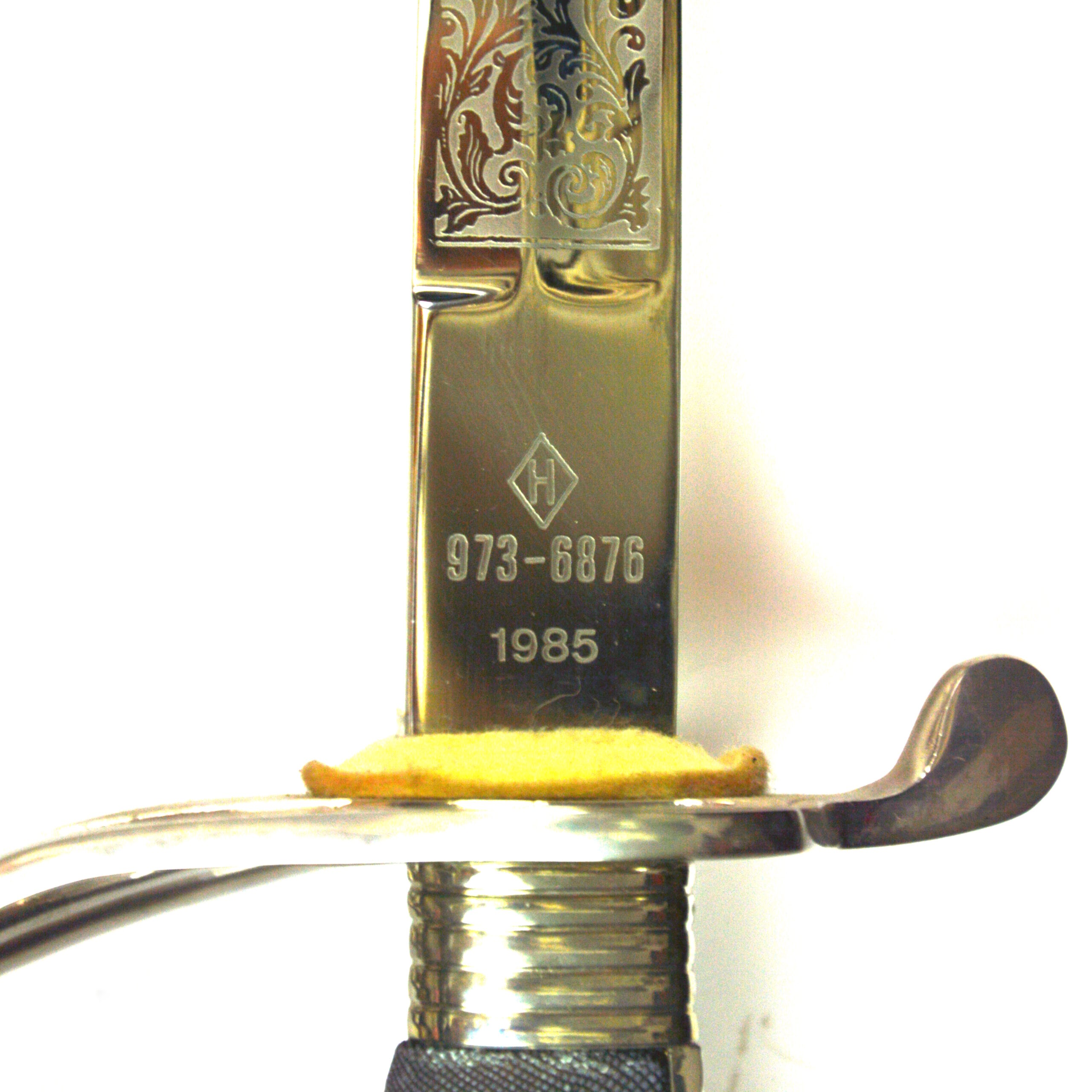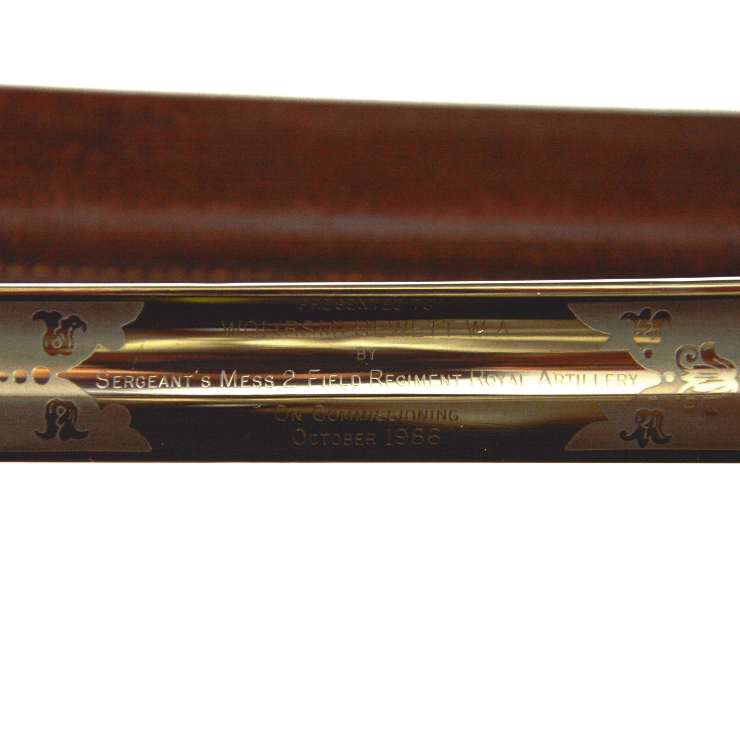 The sword follows the classic 1845 pattern form, featuring a slightly curved, single-fullered blade etched with decorative panels, including the royal cypher of Elizabeth II (ERII), regimental motifs, artillery devices such as crossed guns, and foliage as well as the makers’ mark of an “H” in a diamond, abbreviated NATO part number “973-6876”, and date “1985”. The blade is also laser-engraved with the following: “Presented To / WO1 (RSM) Hewett W A / by / Sergeant’s Mess 2 Field Regiment Royal Artillery / On Commissioning / October 1986”.