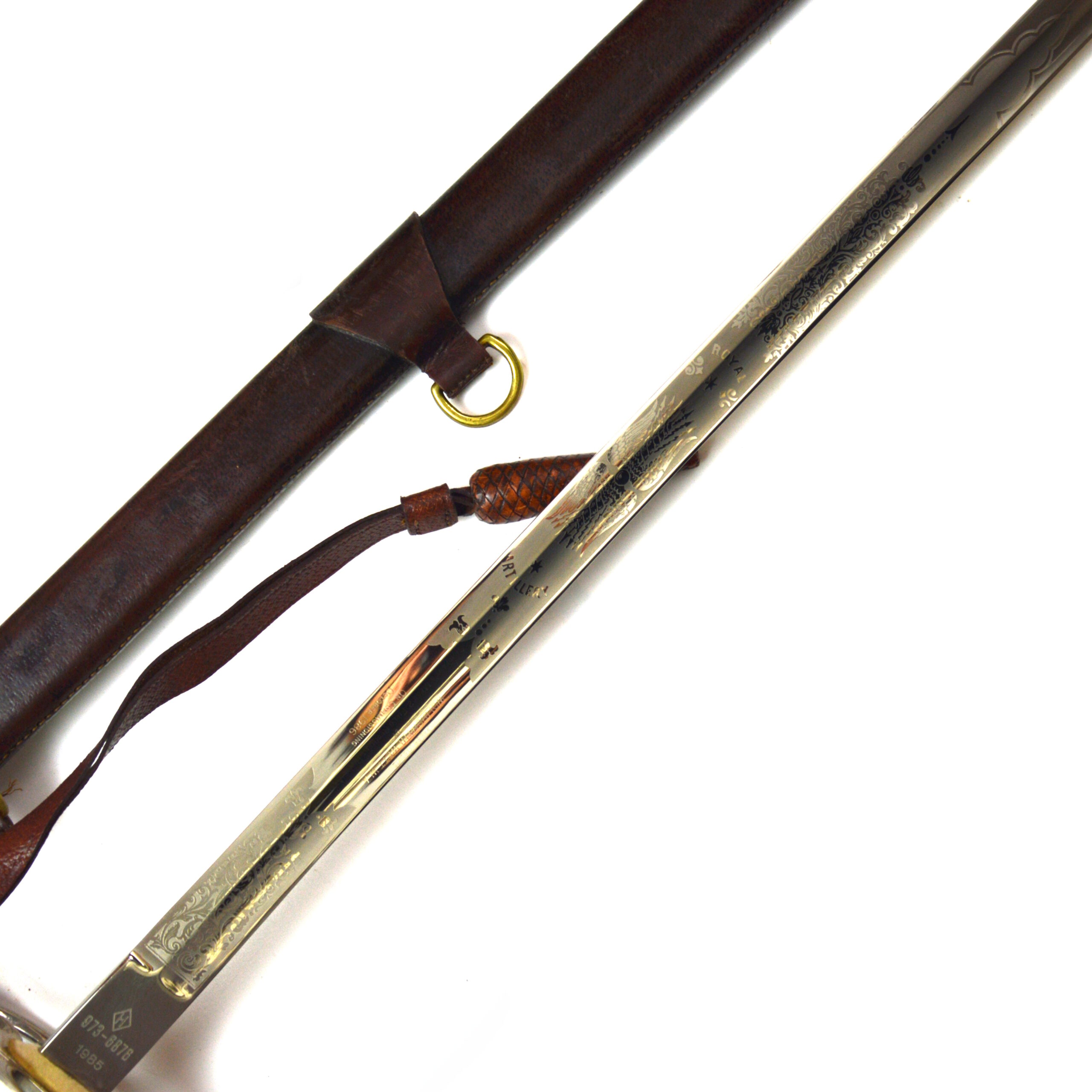 British 1845 Pattern Royal Artillery Officer’s Sword with scabbard, dated 1985, a late 20th-century example of the long-established British Army pattern, produced for ceremonial and dress use. This sword is associated with the Royal Artillery and is named as awarded to “WO1 (RSM) Hewett, W.A.”, reflecting presentation within a commissioned officer context.