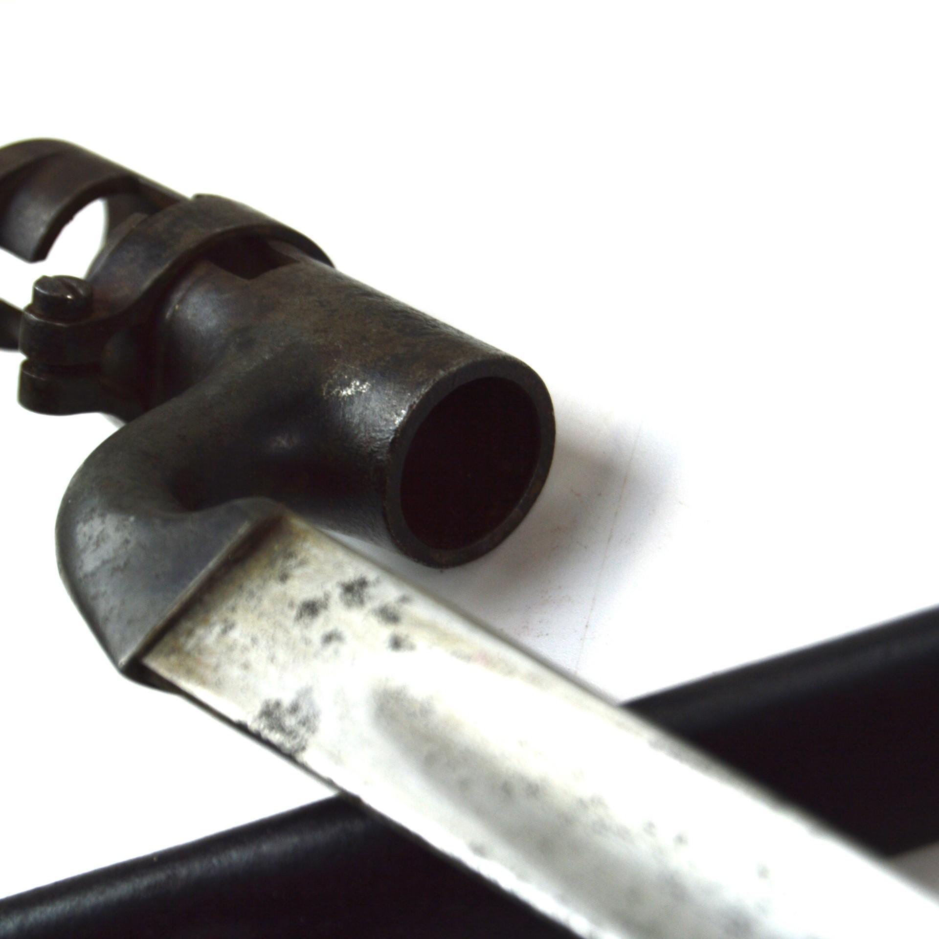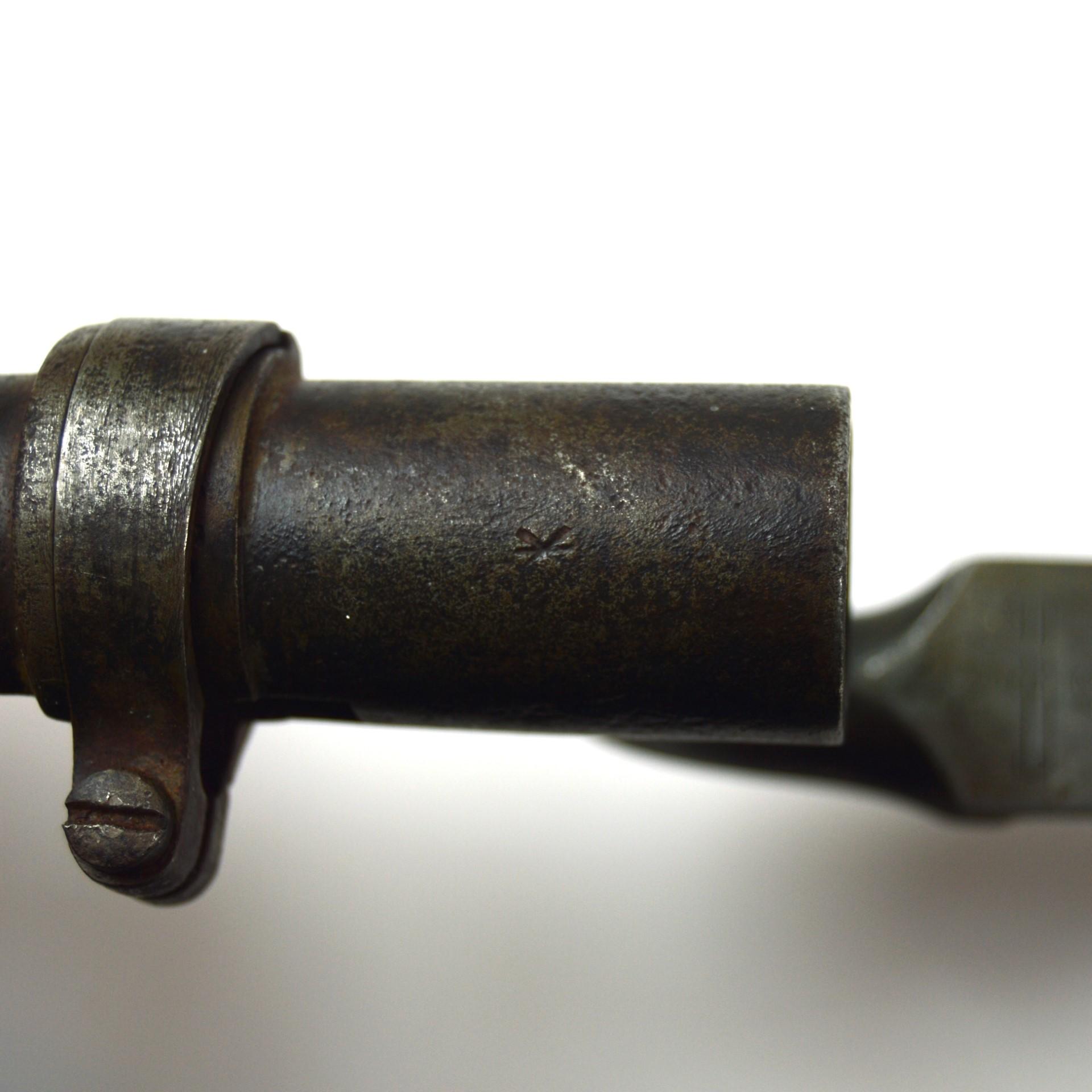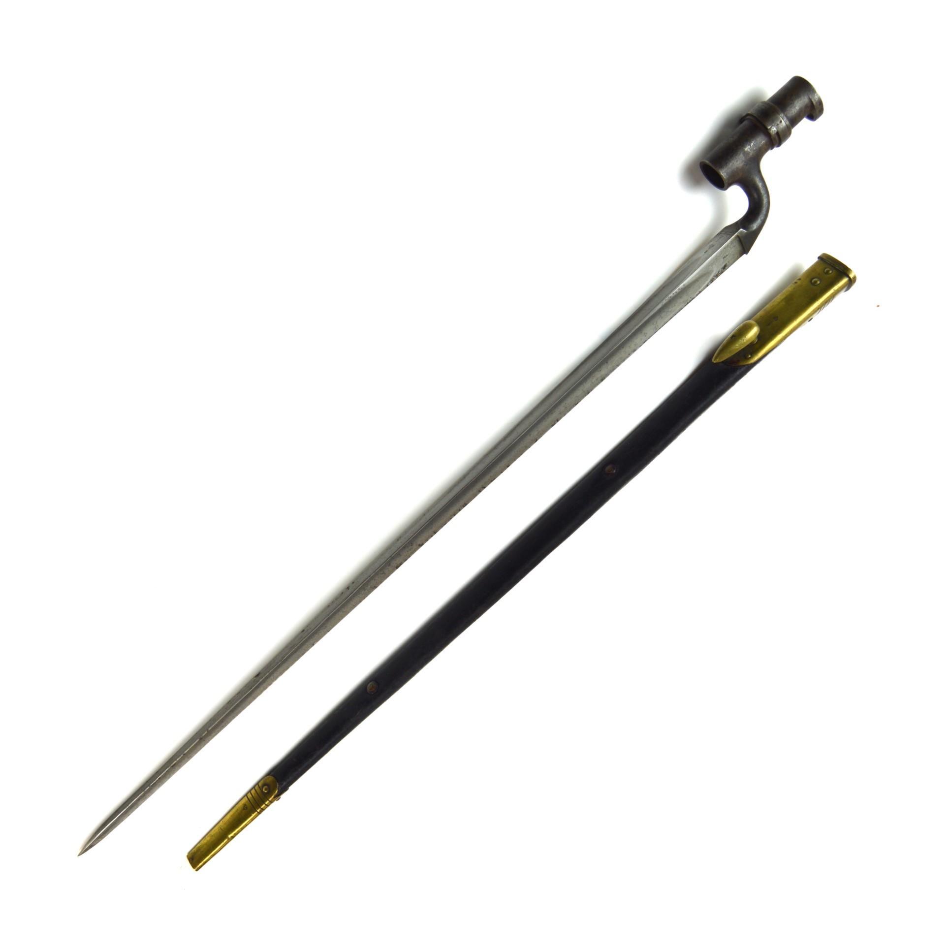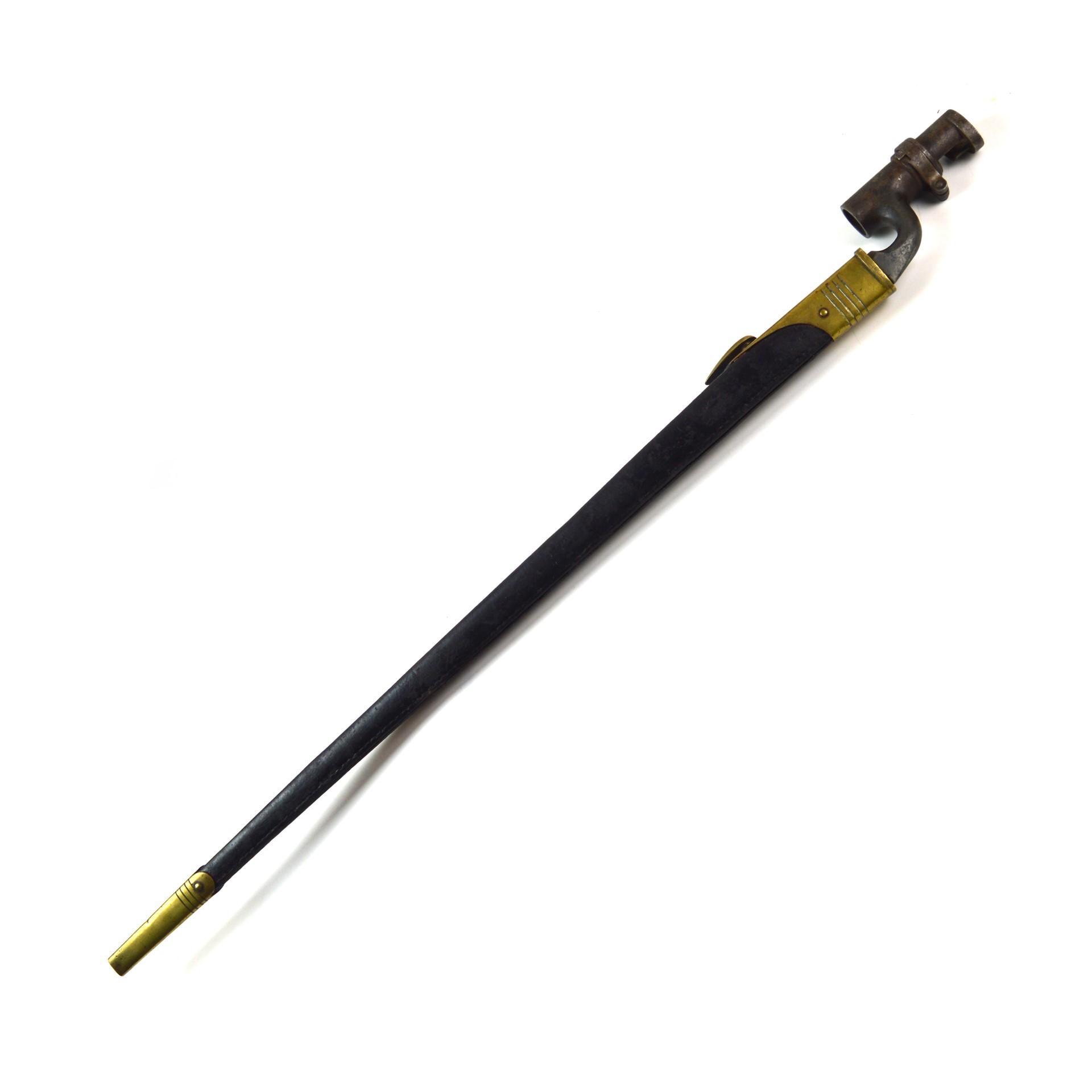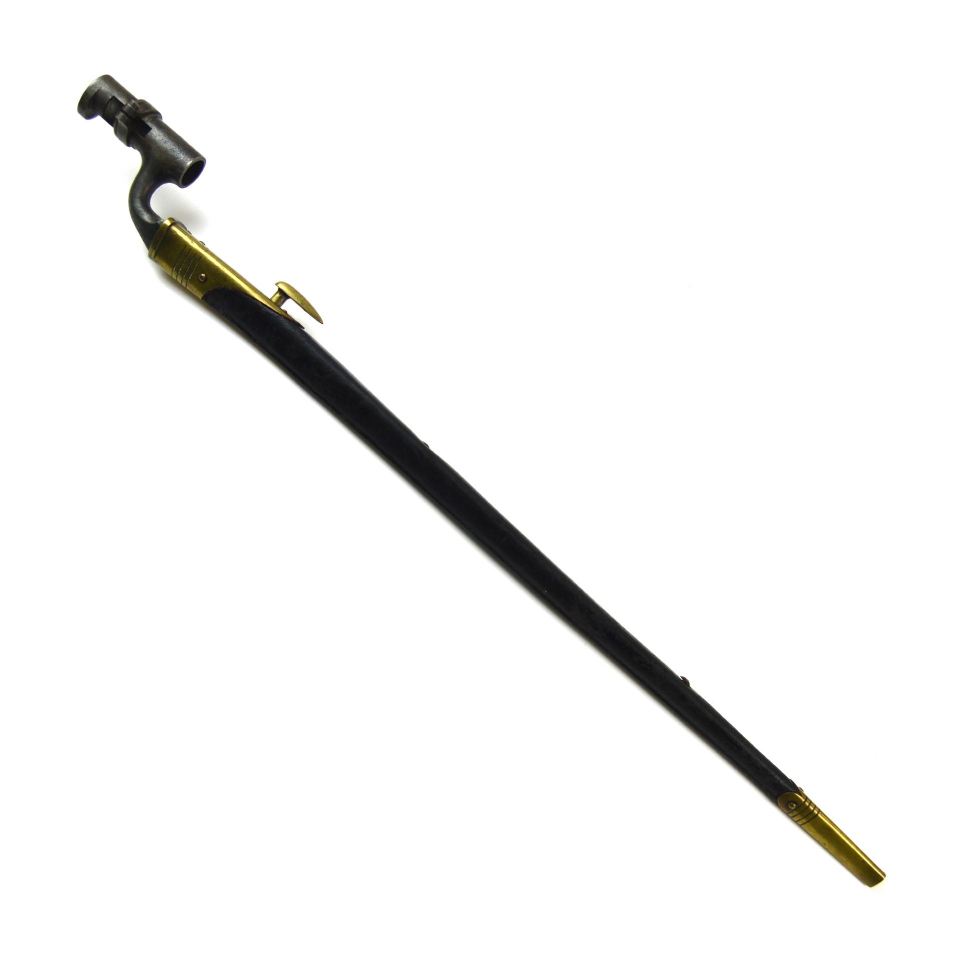 British 1876 Pattern Martini-Henry Socket Bayonet in Scabbard, designed for the .577/.450 Martini-Henry rifle. Triangular 549mm steel bayonet with 75mm long socket.