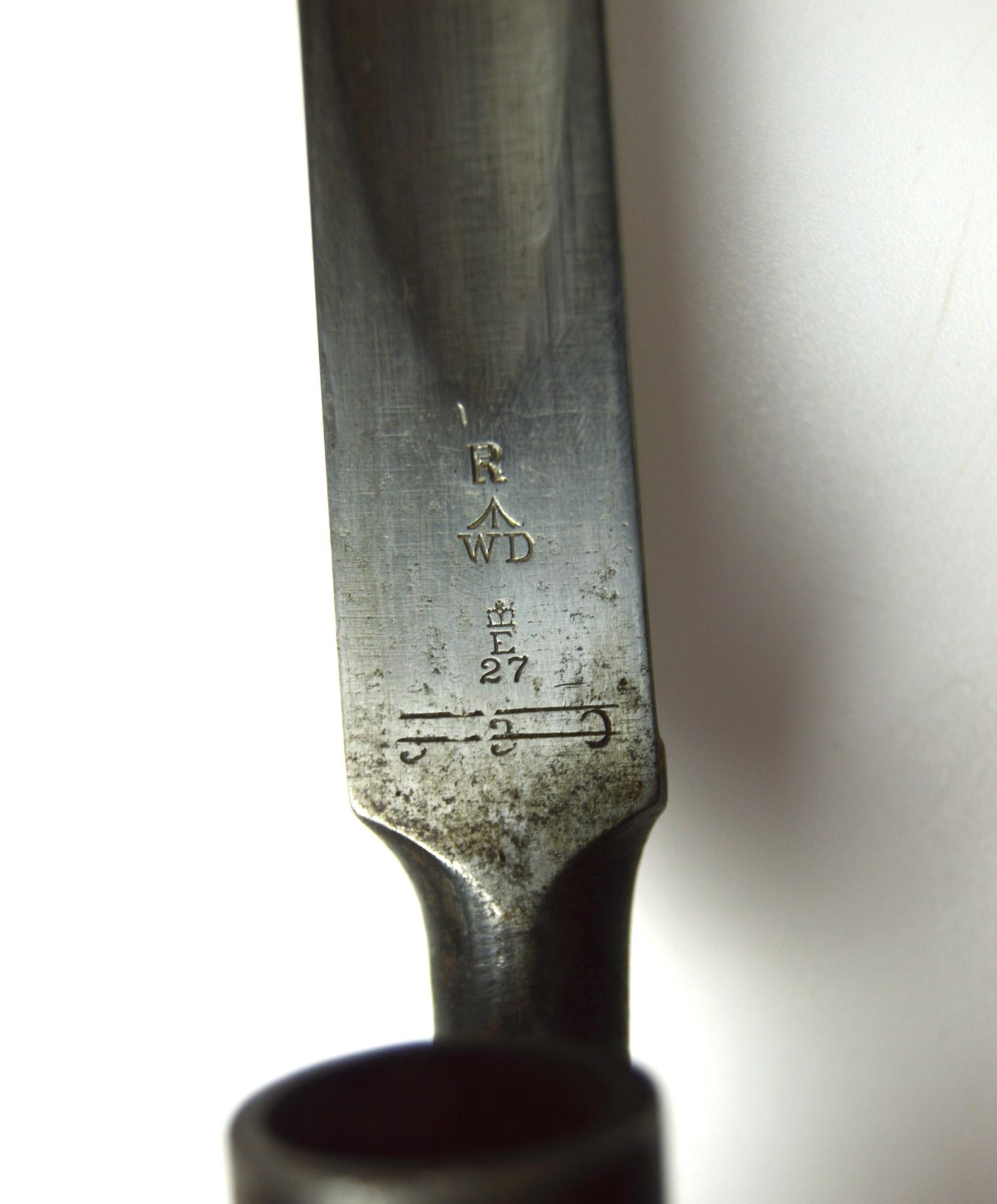 Marked on the blade “R (broad arrow) WD (War Department), (crown), E, 27 (Enfield Royal Small Arms Factory)”