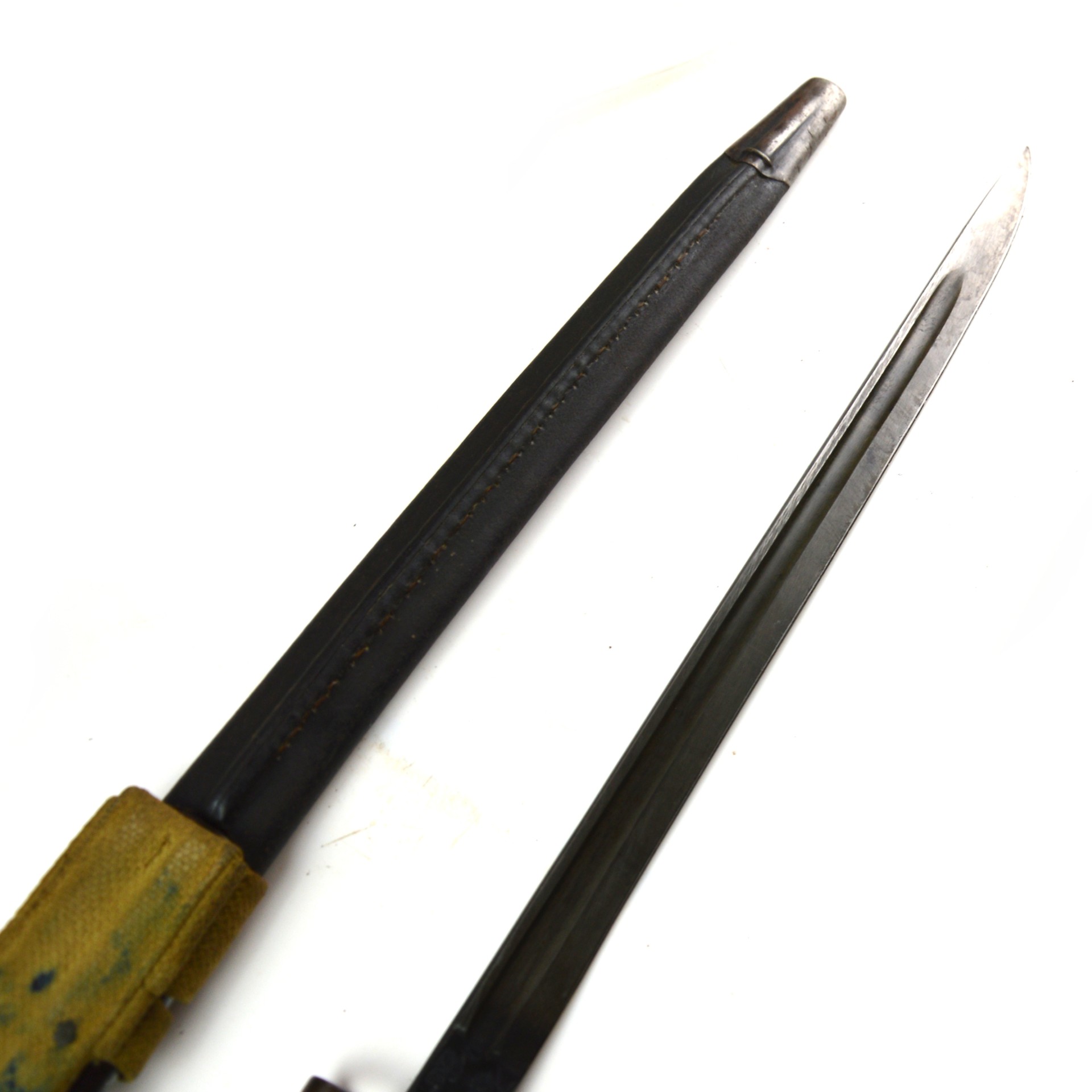 Good to very good condition. The blade retains clear markings with most of its original finish remaining. The wooden grips are intact and secure. The scabbard leather is in very good condition, and the mounts are relatively worn but firm. The web frog is complete with light discolouration and staining, consistent with age. The locking catch is functional.