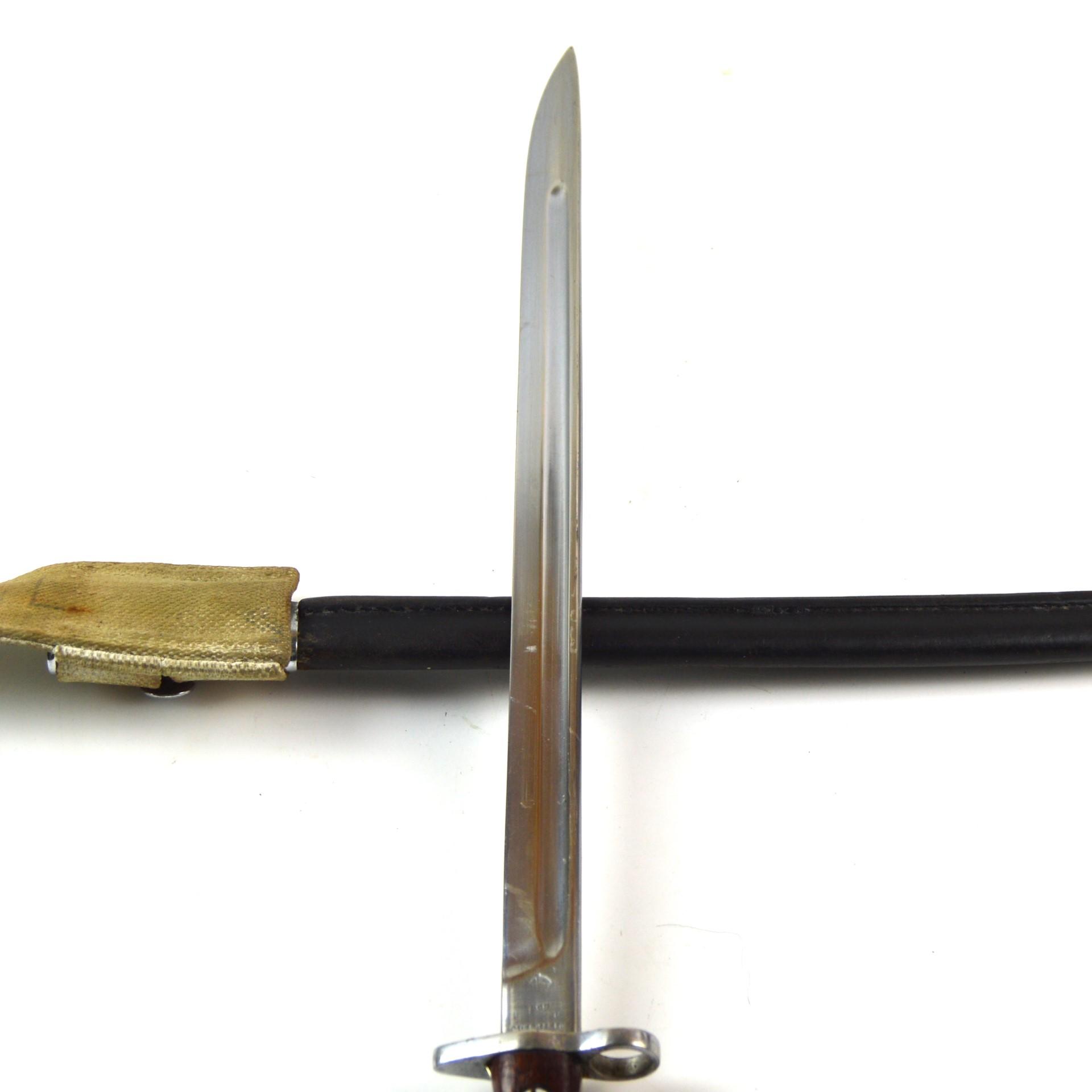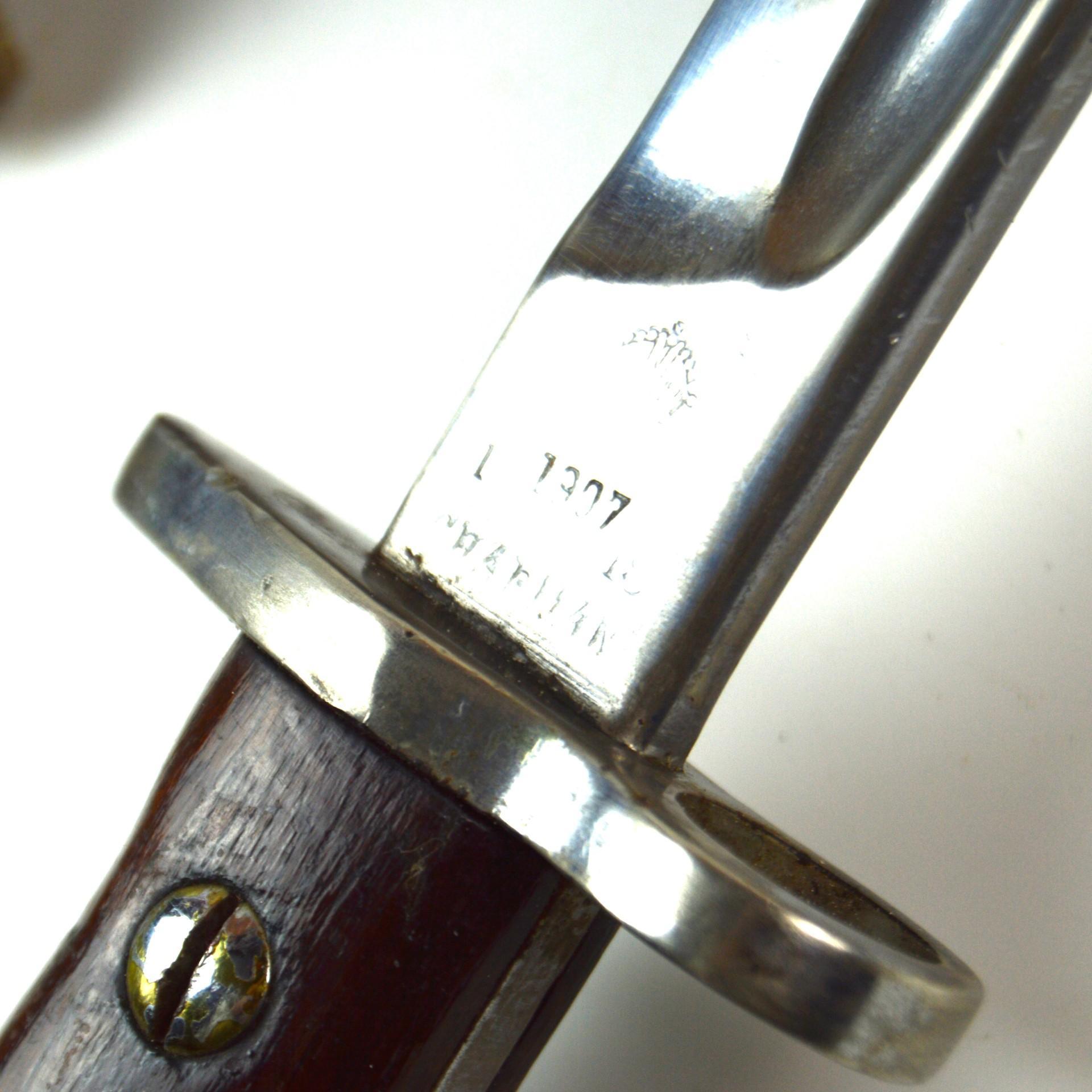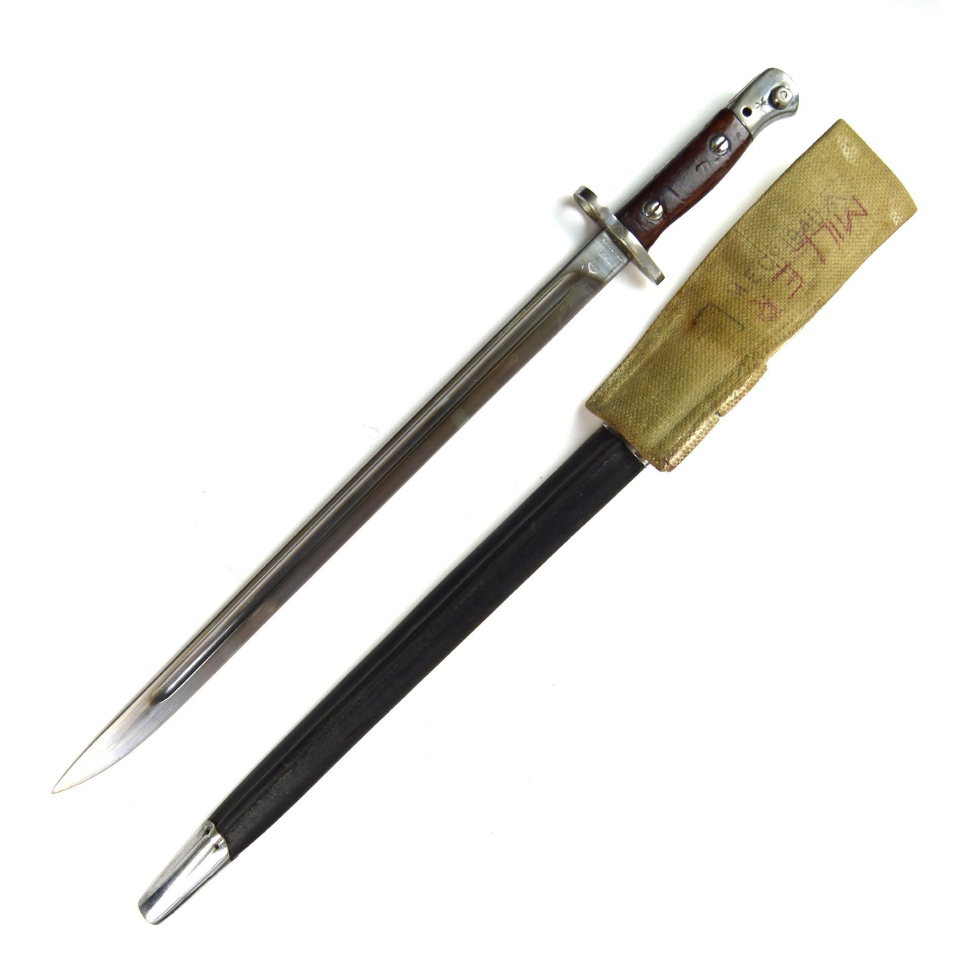 British 1907 Pattern Parade Bayonet, Dated 1918 by Chapman, RAF Unit Marked in the WWII pattern scabbard with round frog stud. Used on the SMLE throughout the First and Second World Wars. Chrome-plated for use during parades and worn while in ceremonial dress.