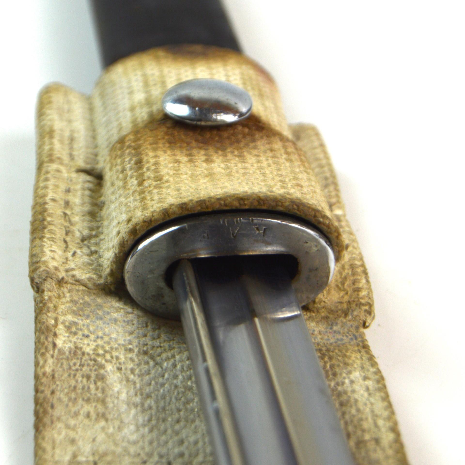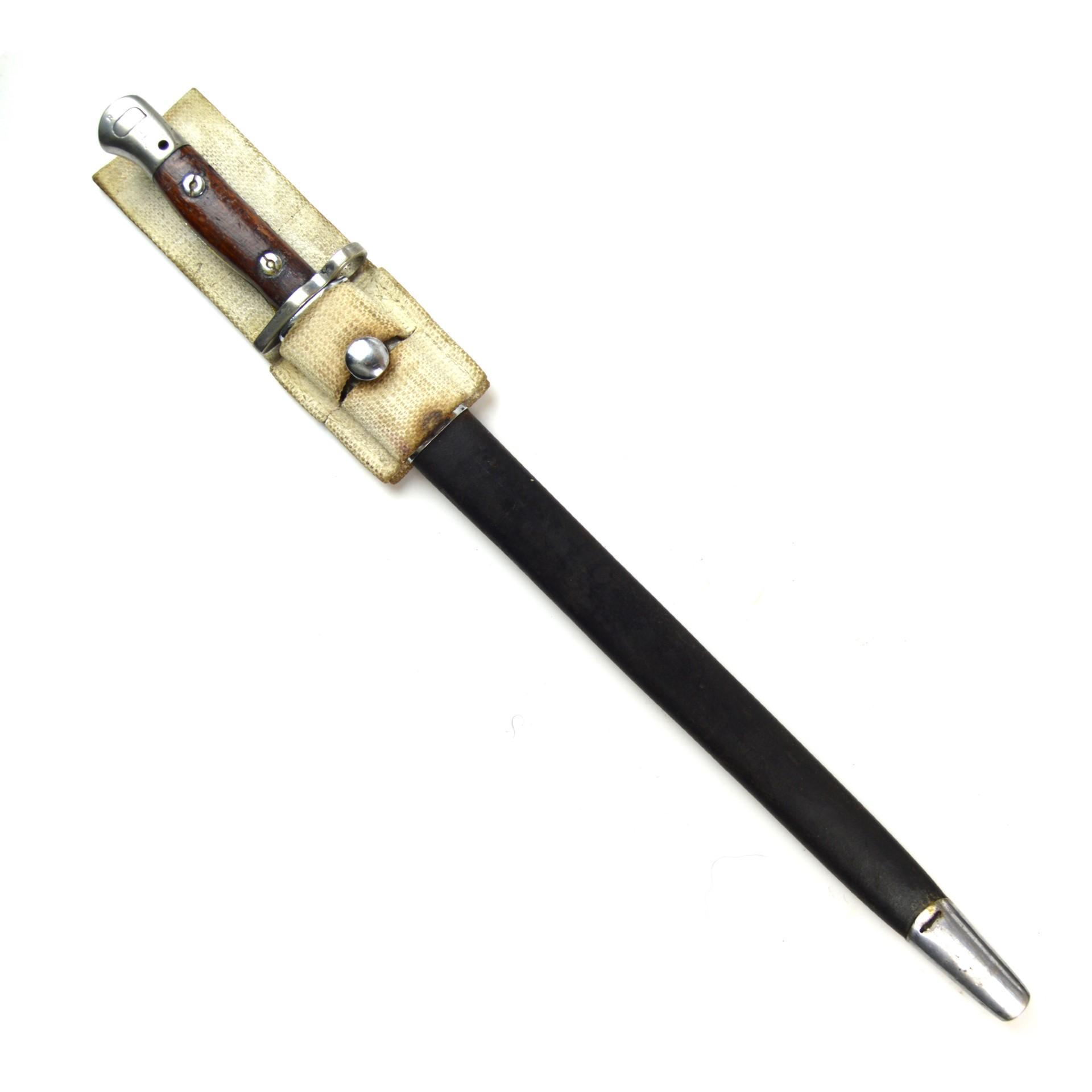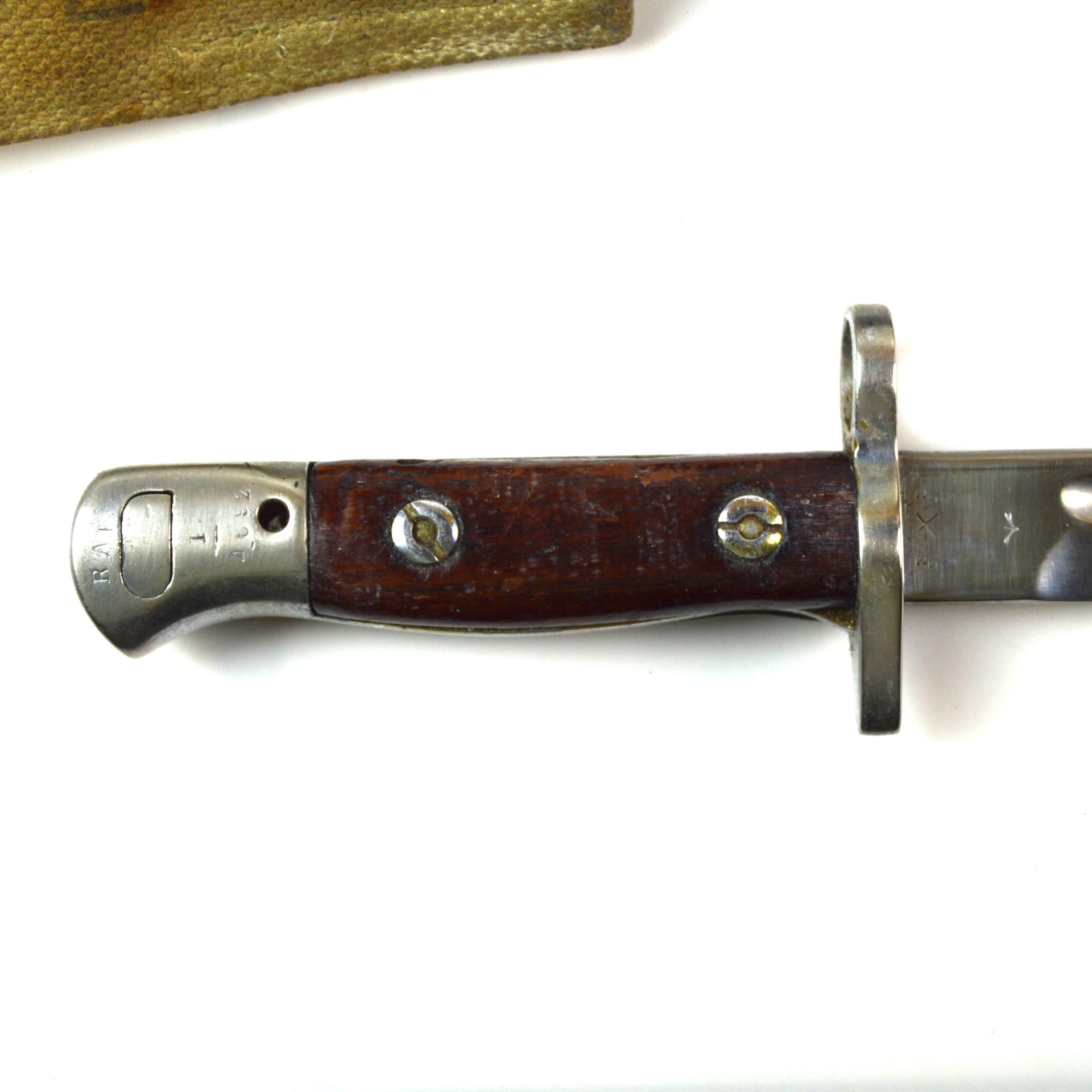 British 1907 Pattern Parade Bayonet, Dated 1918 by Chapman, RAF Unit Marked in the WWII pattern scabbard with round frog stud. Used on the SMLE throughout the First and Second World Wars. Chrome-plated for use during parades and worn while in ceremonial dress.
