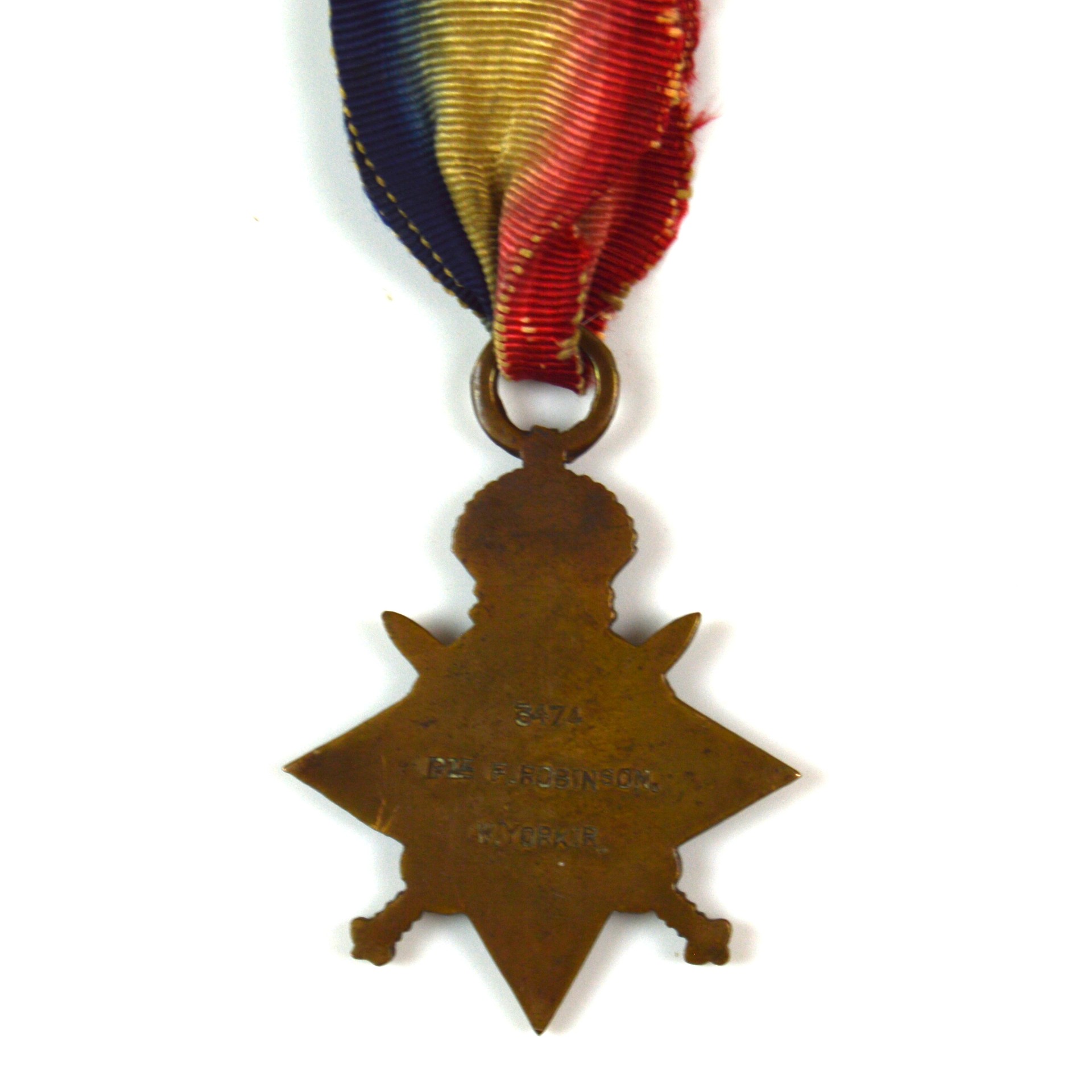 British 1914-15 Star Medal, Private Fred Robinson, 1/6th West Yorkshire Regiment (Prince of Wales's Own) (KIA 17/7/15)British 1914-15 Star Medal, Private Fred Robinson, 1/6th West Yorkshire Regiment (Prince of Wales’s Own) (KIA 17/7/15)