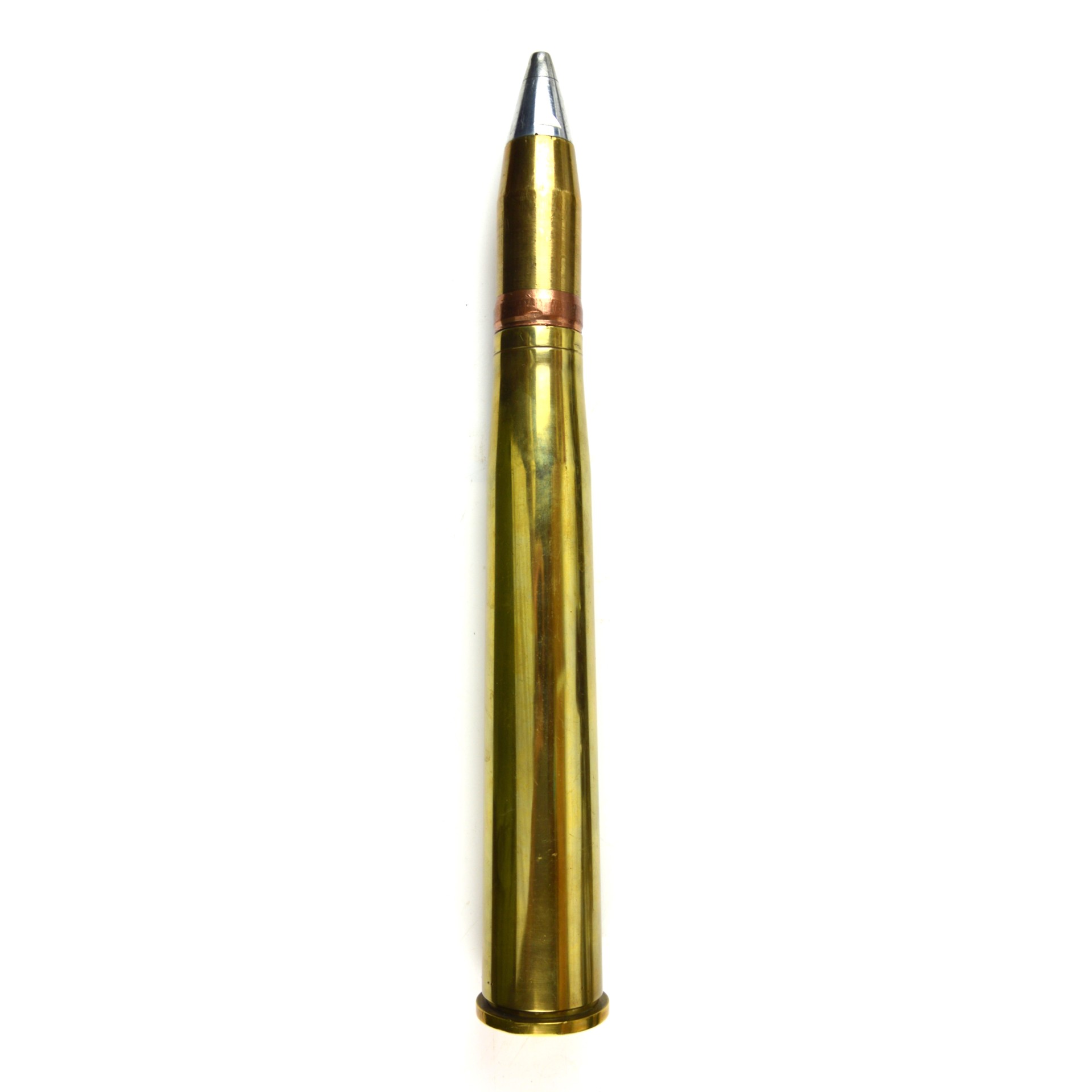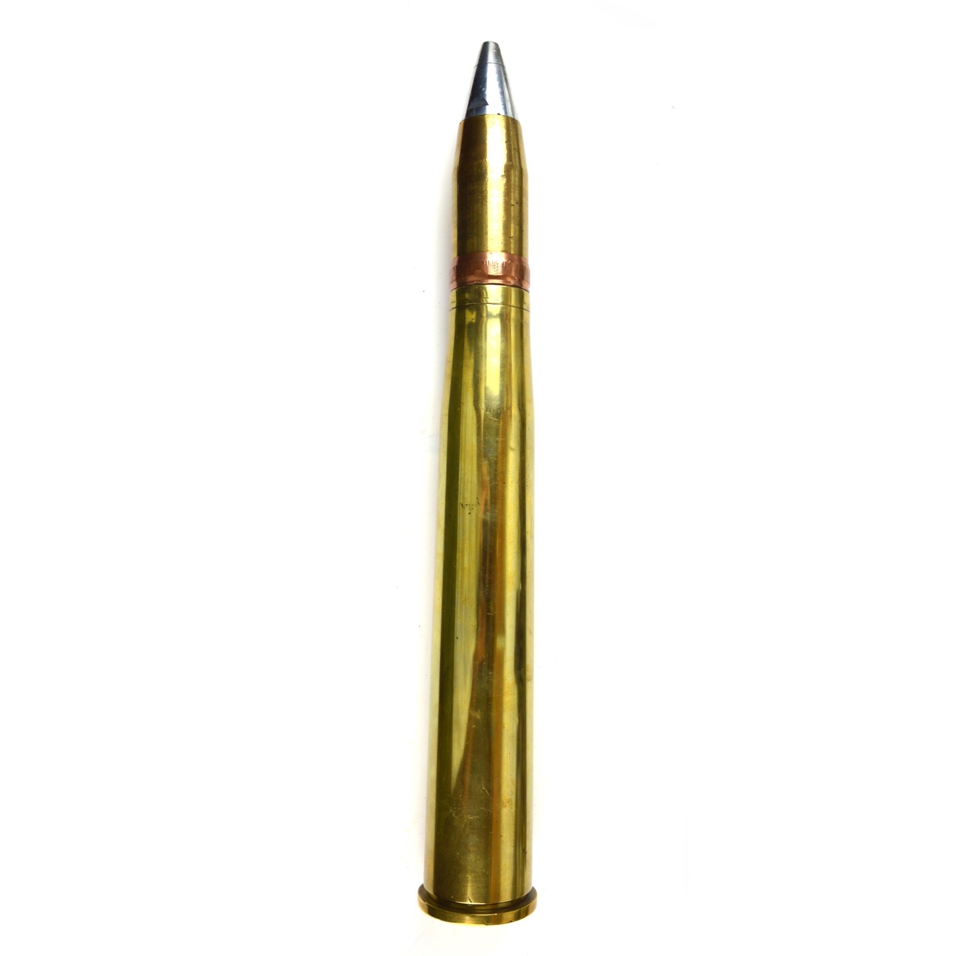 An original British 40mm Mk. 4 shell case, dated 1943, manufactured by Platers & Stampers Ltd., Burnley, Lancashire. The 40mm Bofors round was the standard ammunition for the British Army’s 40mm Bofors L/60 (designated the QF 40mm) anti-aircraft gun, widely used throughout the Second World War across all theatres of operation by both Army and Naval forces.