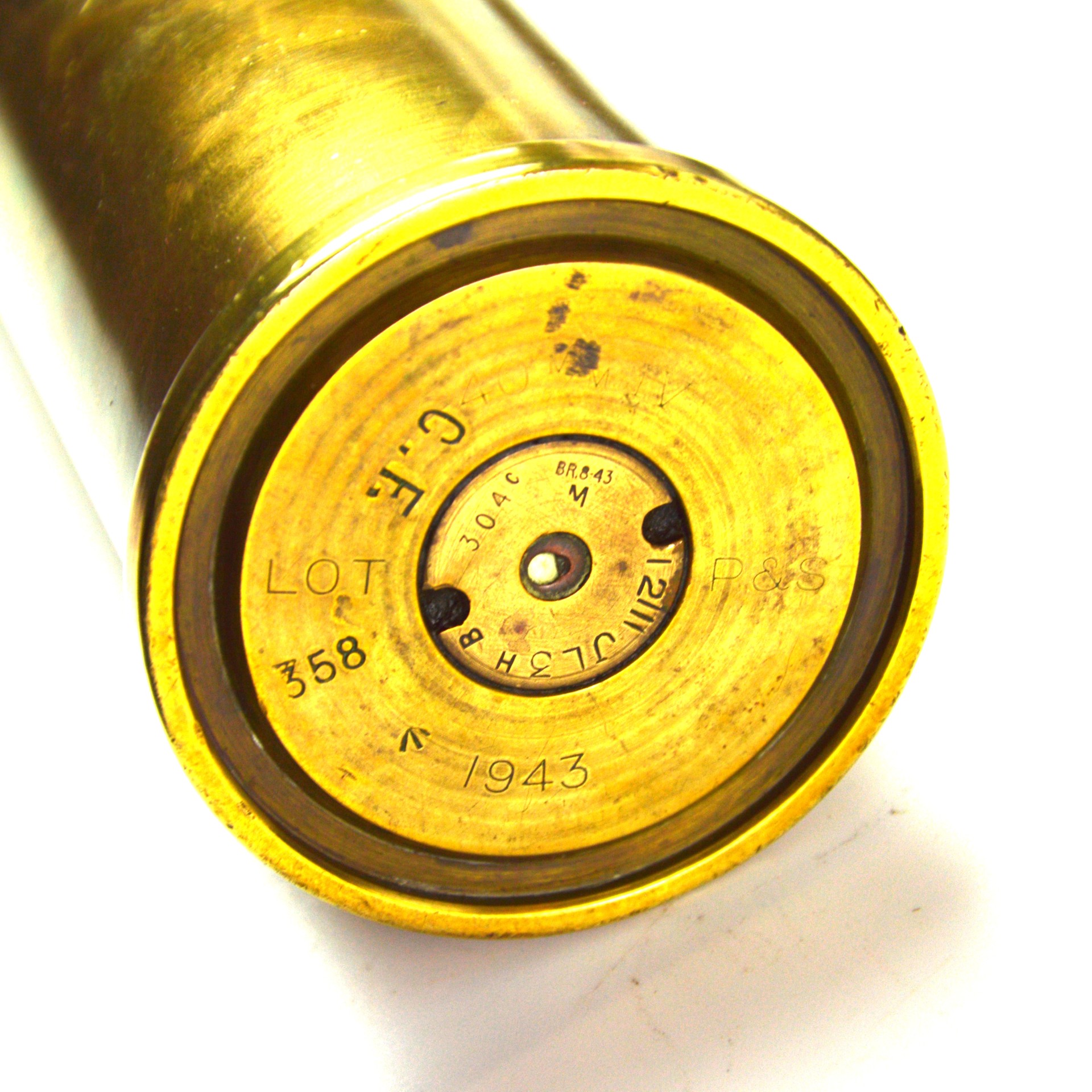 This example is of drawn brass construction, retaining clear base markings that include the manufacturer’s monogram, “P&S”, date “1943”, lot number “358” and designation “40mm Mk. IV”. No naval markings present, so it was presumably issued to the Army or for Home Defence. The case is complete, empty, and fully inert, originally intended for the Bofors autocannon.
