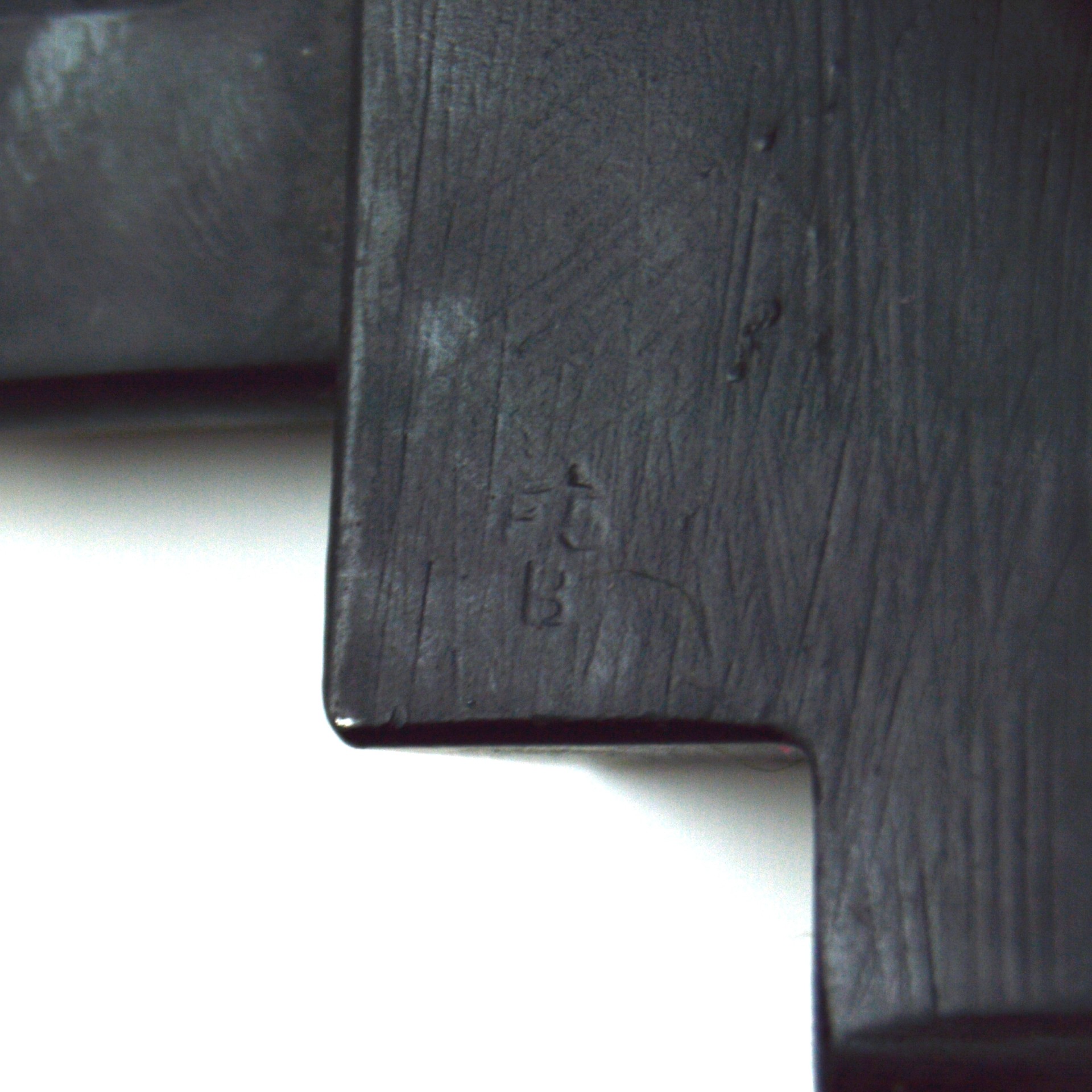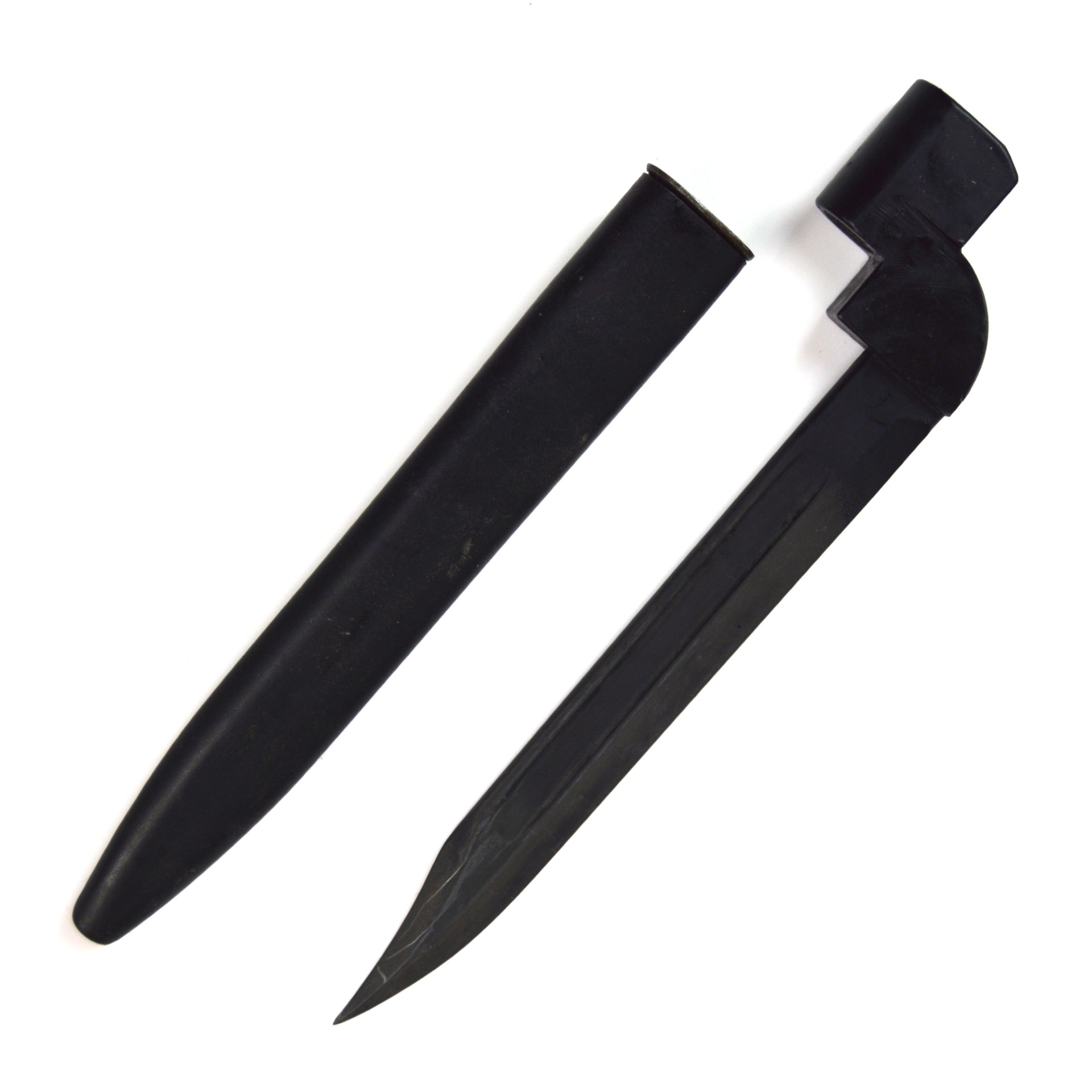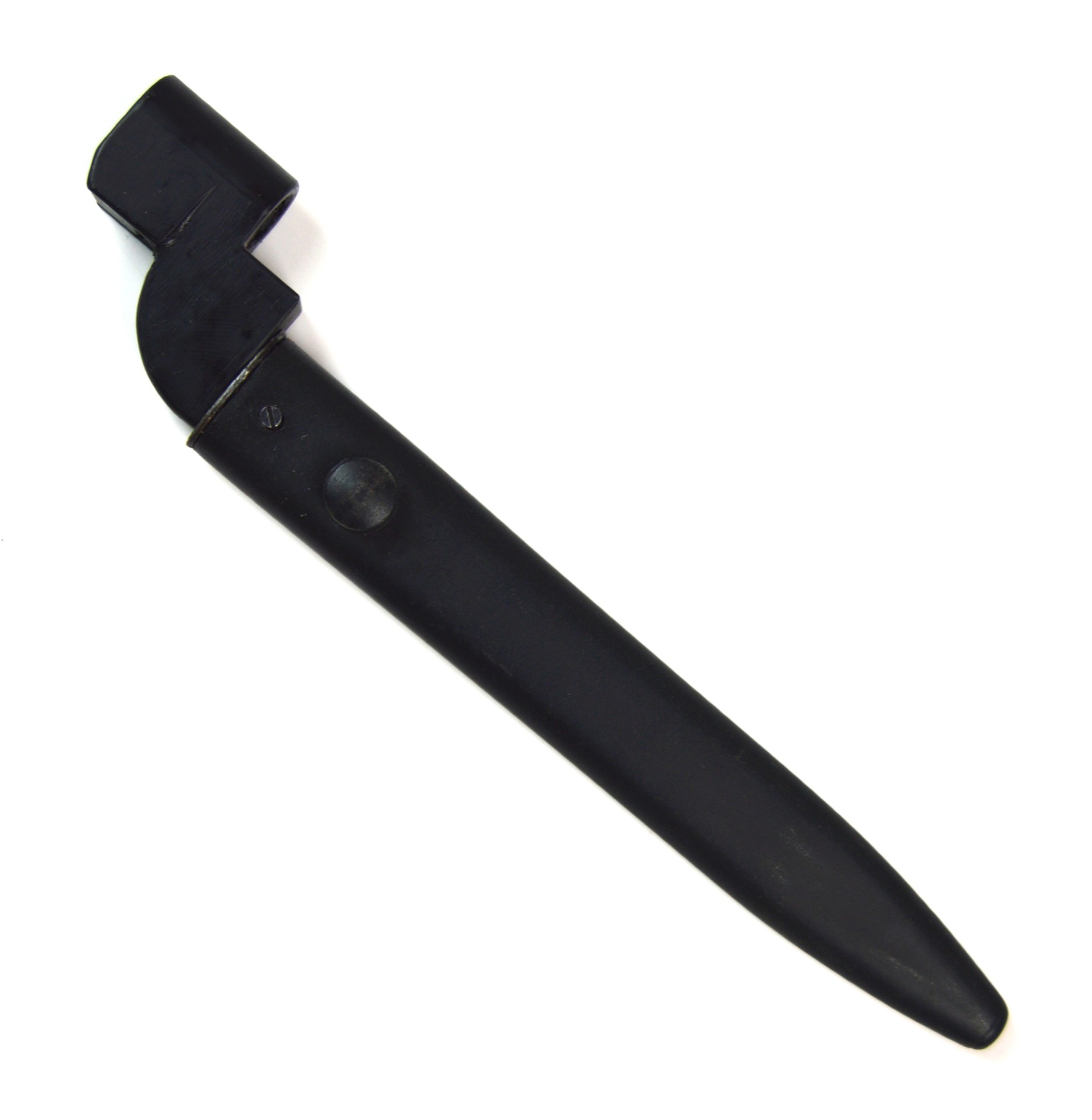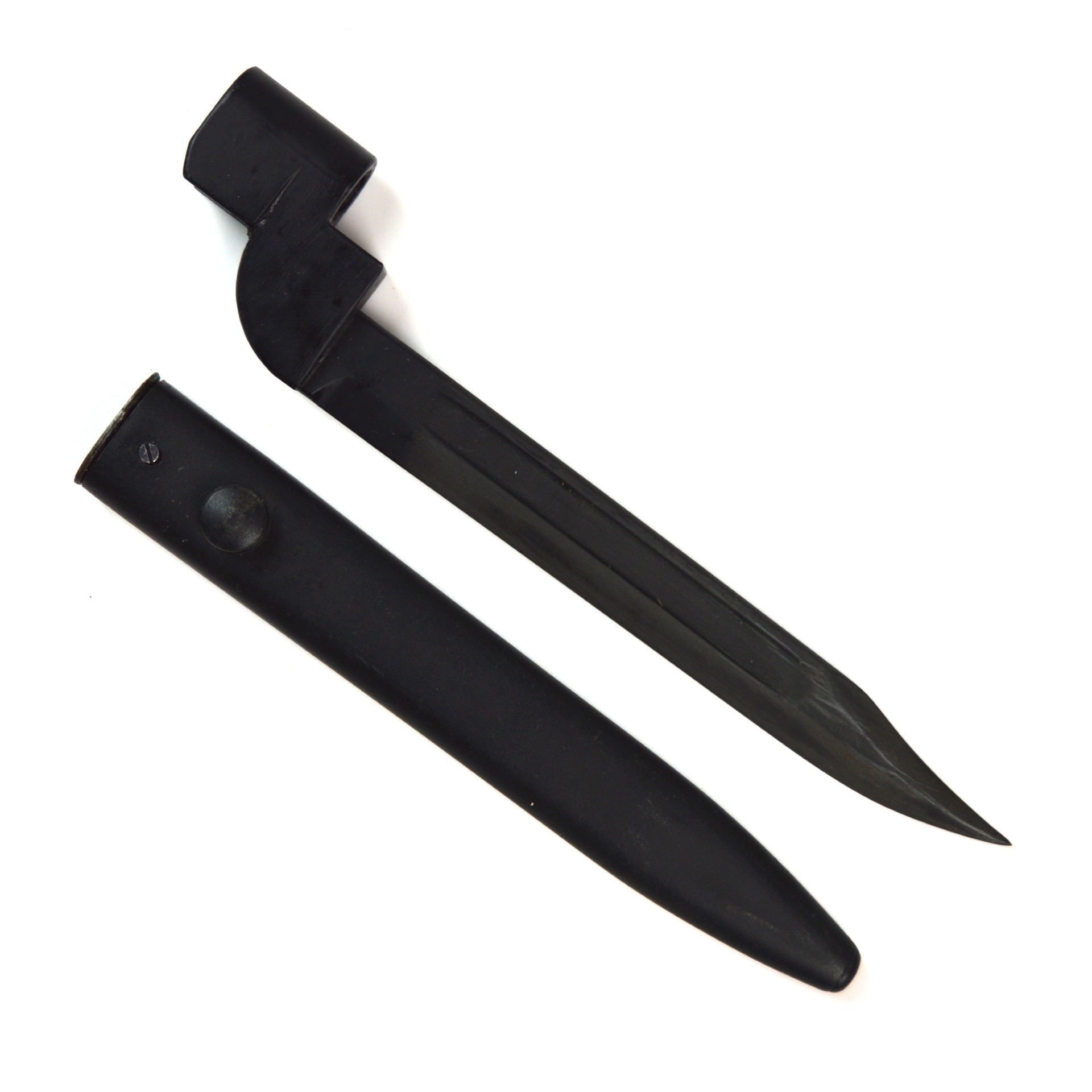 Features the distinctive socket-and-blade design, combining the No. 4 socket design and traditional blade form as seen on the No. 5 Jungle Carbine and L1A1 (SLR) Bayonet. Fullered steel blade with blackened socket, clearly marked with “P” (Poole) and date stamp “1949”. Complete with original steel scabbard.