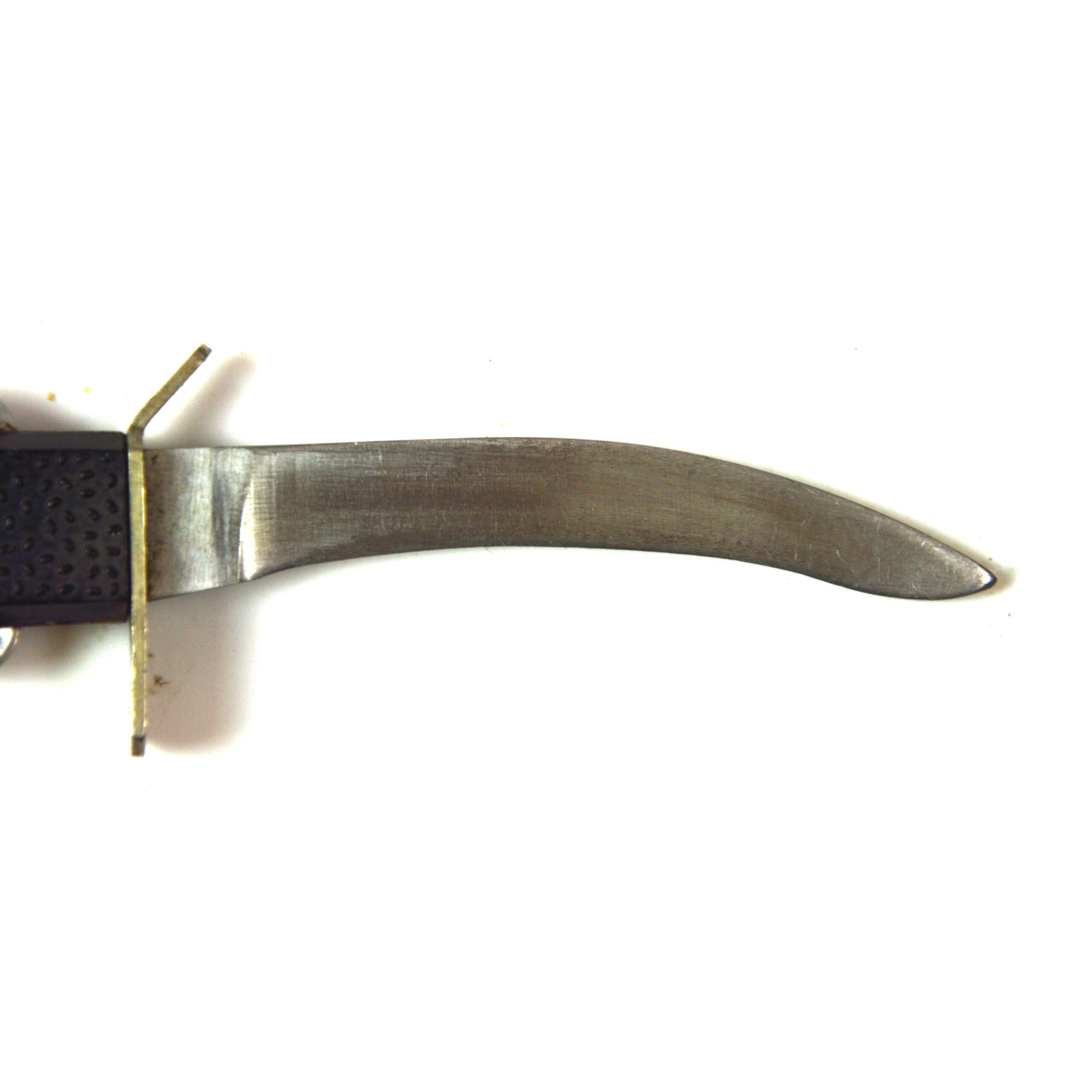 The Mk. III escape knife features a robust fixed “J-shaped” blade, designed for general utility tasks such as cutting, prying, and preparing materials for survival. The handle is constructed from black textured plastic for a secure grip under adverse conditions, reflecting its intended operational role.