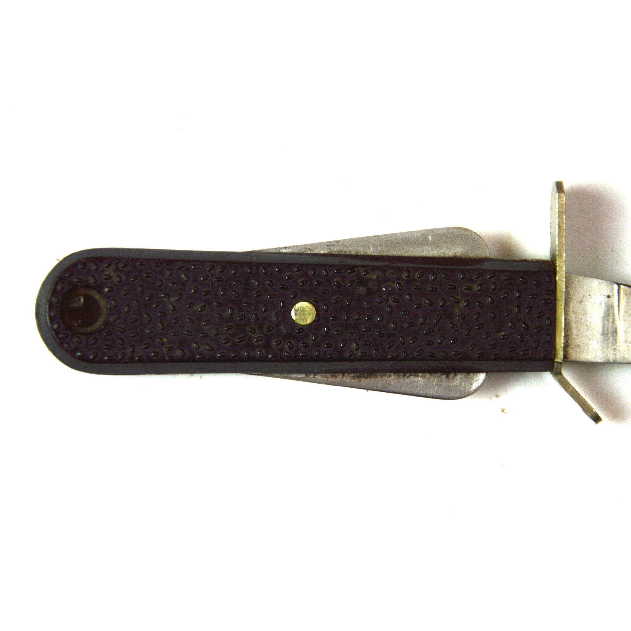 This example is accompanied by its sheath of pressed stainless steel construction with a catch, allowing for safe storage and attachment to flight gear. The presence of the sheath enhances both the completeness and display appeal of the piece.