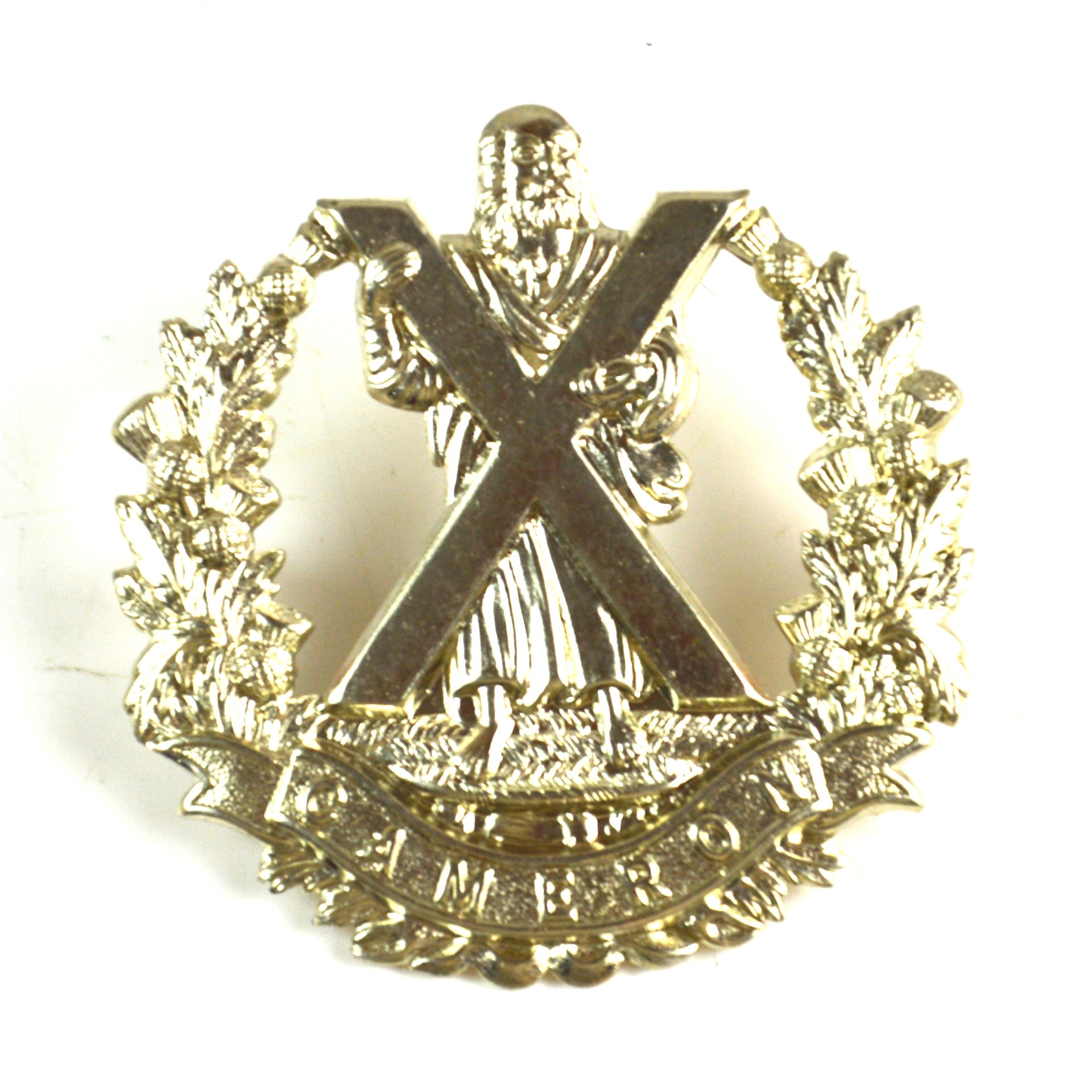 Queen’s Own Cameron Highlanders glengarry badge produced as a restrike of the pattern worn between 1900 and 1961 by the Queen’s Own Cameron Highlanders of the British Army. This Highland infantry glengarry badge displays the recognised insignia of the regiment in clear relief, incorporating St. Andrew and cross as the central device, encircled by a wreath and with a scroll below bearing the regimental title “Cameron”. The composition is arranged in the traditional Highland regimental style and is characteristic of Scottish infantry headdress insignia worn on the glengarry bonnet.