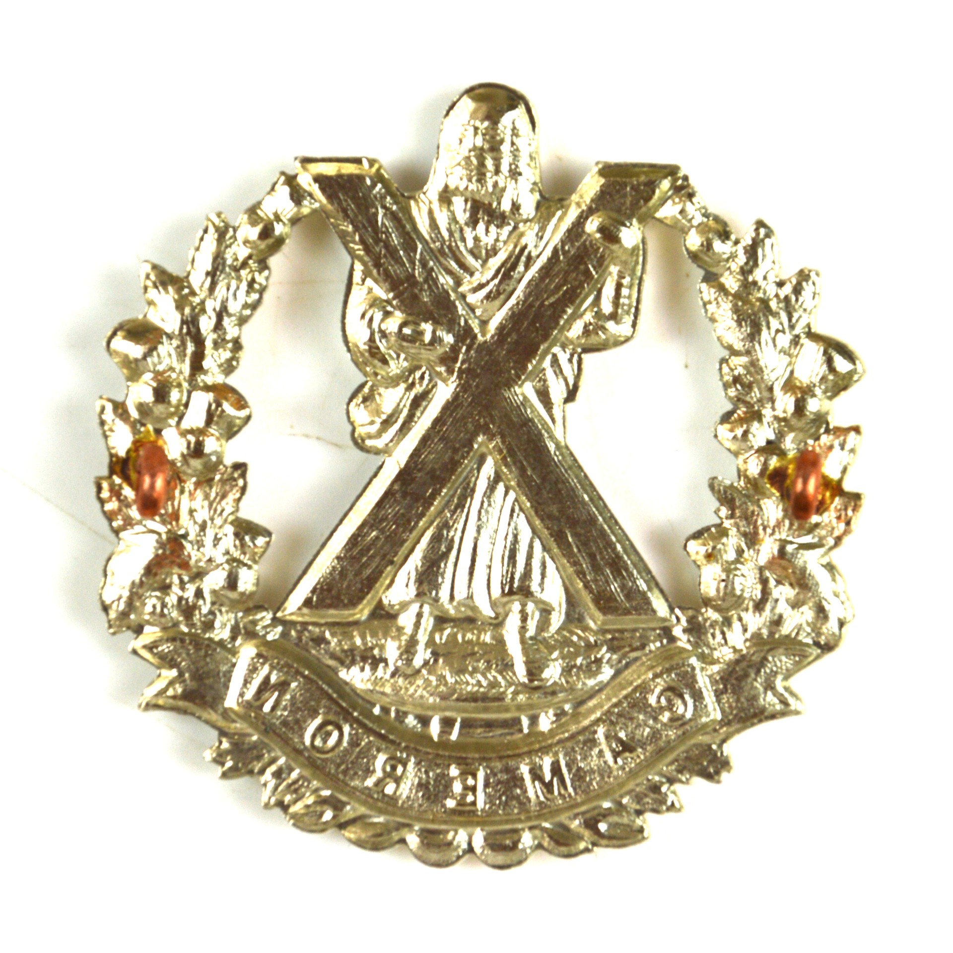 Manufactured in white metal consistent with traditional Highland regimental headdress insignia, this restrike example provides a sharply defined representation of the original pattern. Queen’s Own Cameron Highlanders glengarry badges are collected as examples of Scottish Highland regiment militaria, British Army infantry insignia, and historic regimental uniform hardware.
