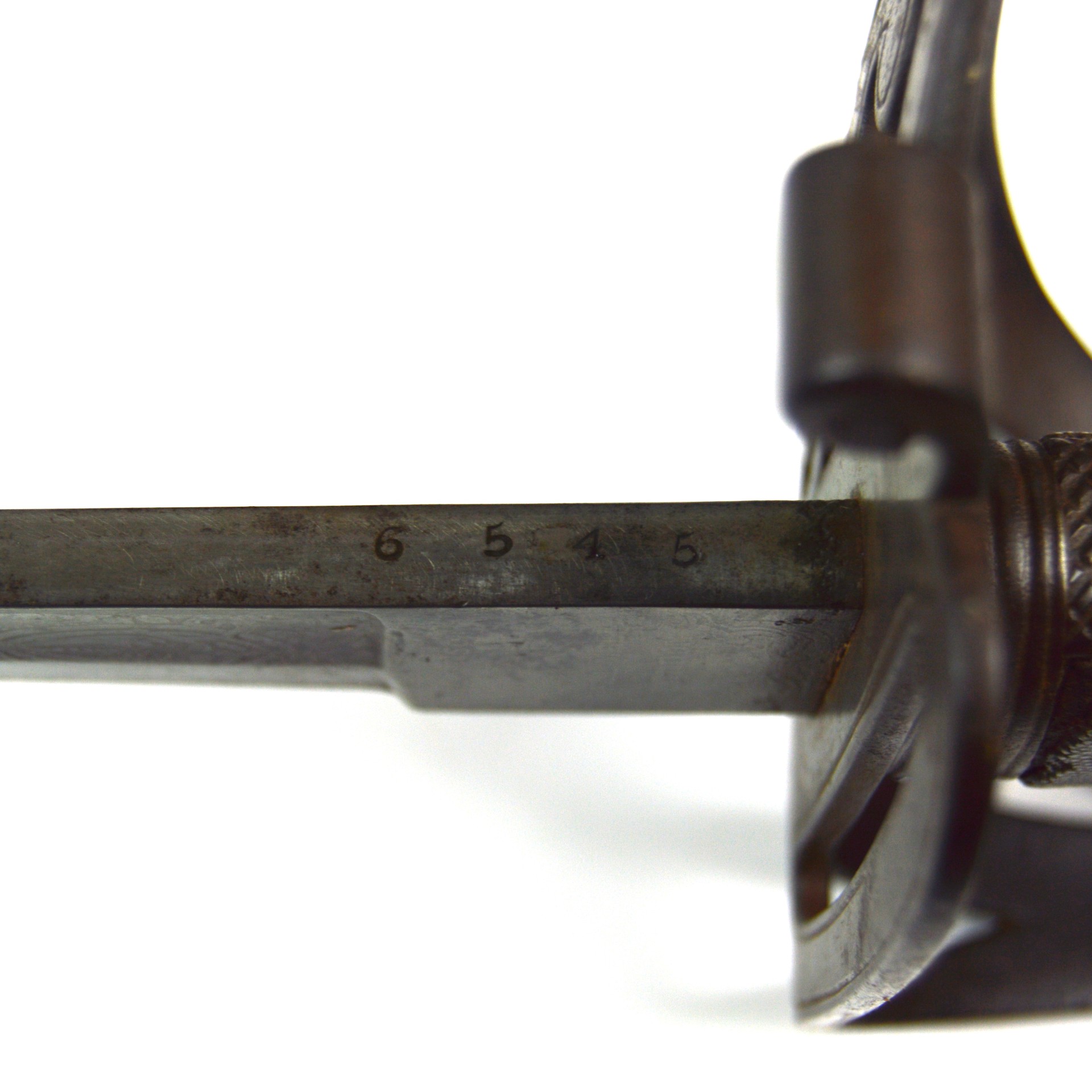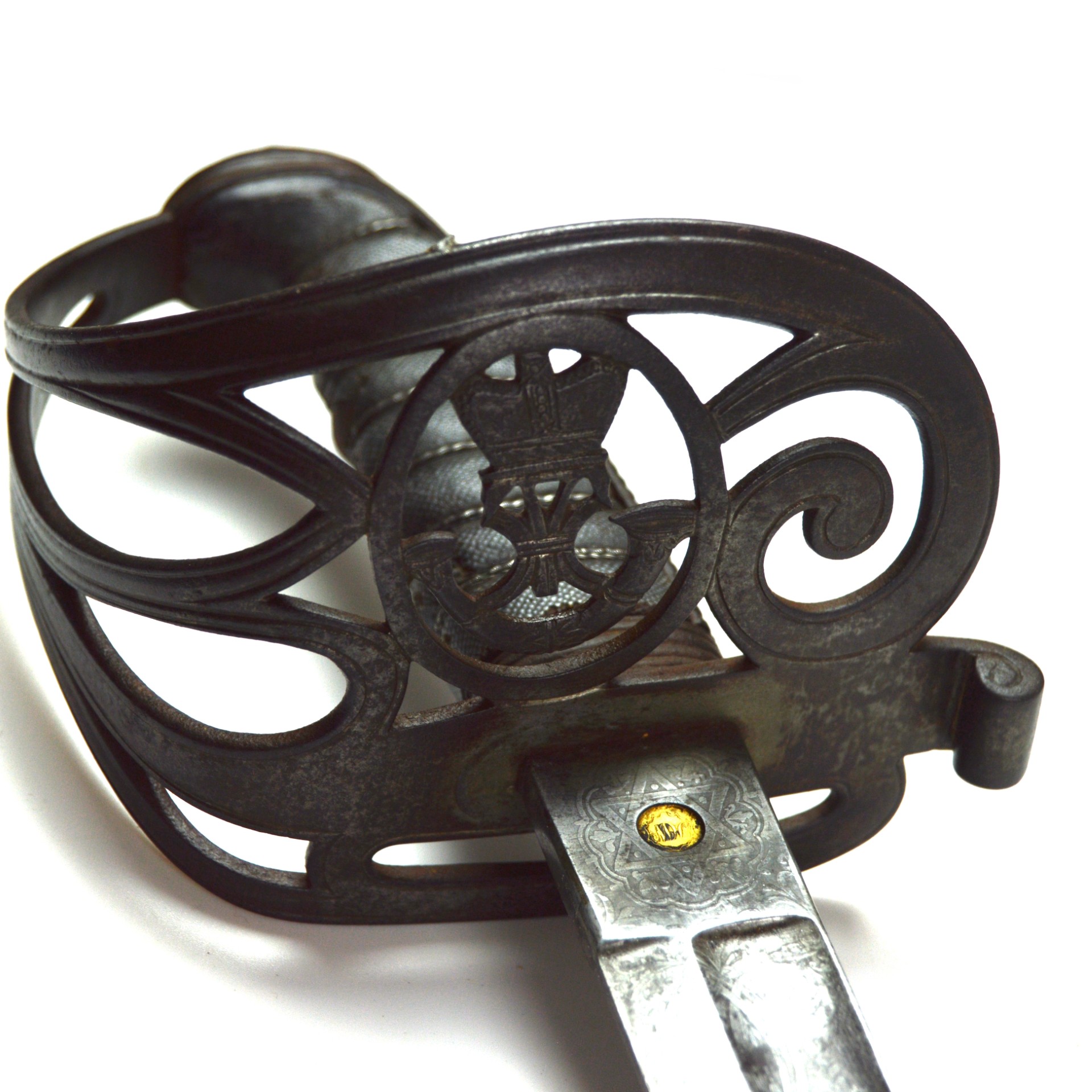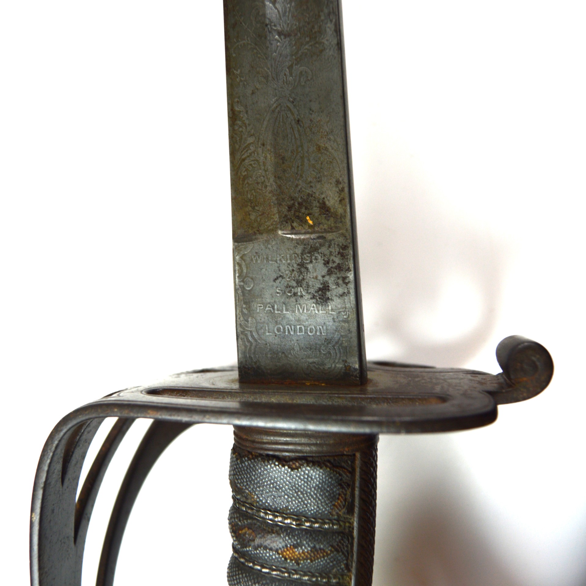 This sword features a steel guard with pierced gothic scrollwork, incorporating the stringed bugle and crown of Queen Victoria, and a shagreen-covered wooden grip bound with original twisted wire. The blade bears a visible etching of Wilkinson’s name and address, as well as the Wilkinson proof slug, and retains faint traces of foliate and military motif etching. The spine of the sword is stamped “6545”, which dates the blade to 1855 and, in turn, to the Crimean War era, according to known Wilkinson serial numbers.