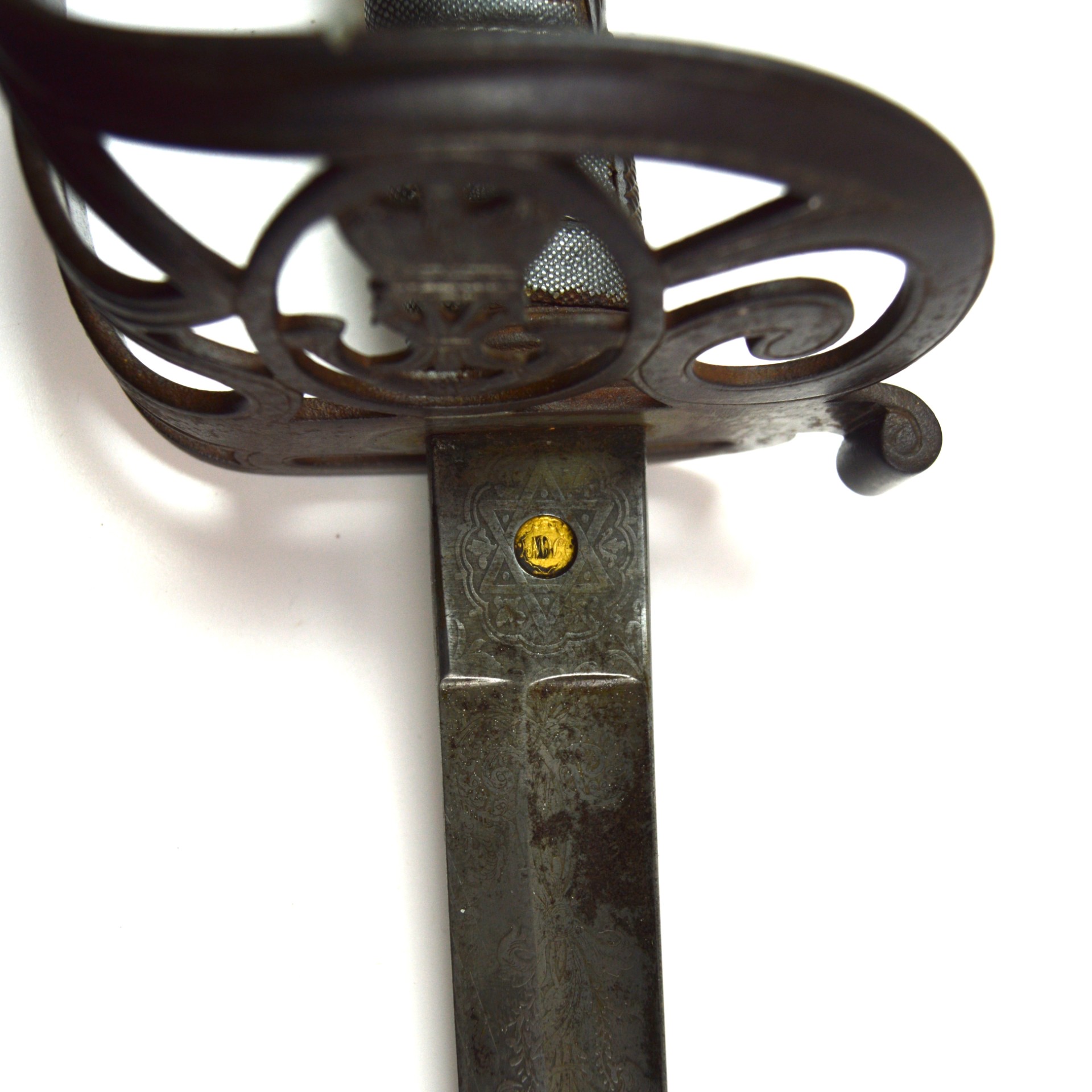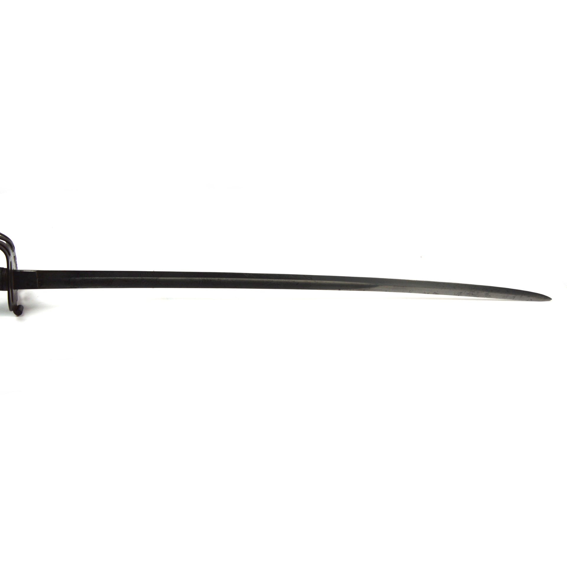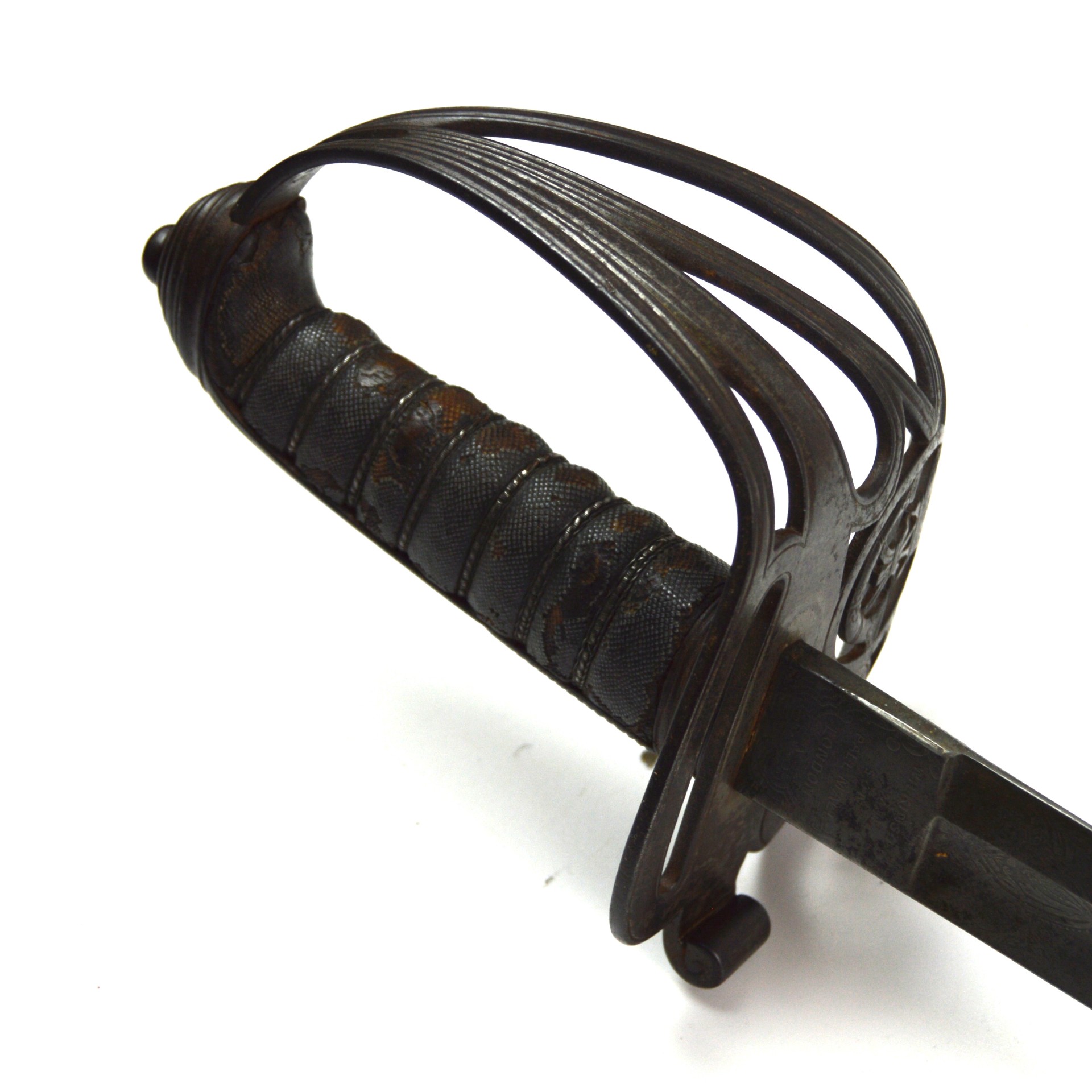 This sword features a steel guard with pierced gothic scrollwork, incorporating the stringed bugle and crown of Queen Victoria, and a shagreen-covered wooden grip bound with original twisted wire. The blade bears a visible etching of Wilkinson’s name and address, as well as the Wilkinson proof slug, and retains faint traces of foliate and military motif etching. The spine of the sword is stamped “6545”, which dates the blade to 1855 and, in turn, to the Crimean War era, according to known Wilkinson serial numbers.