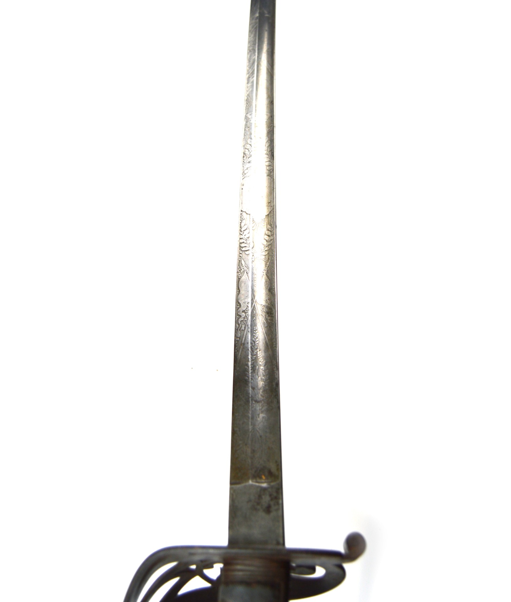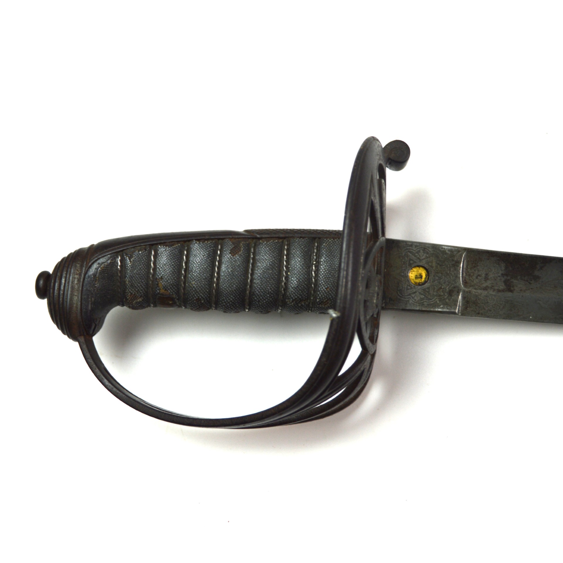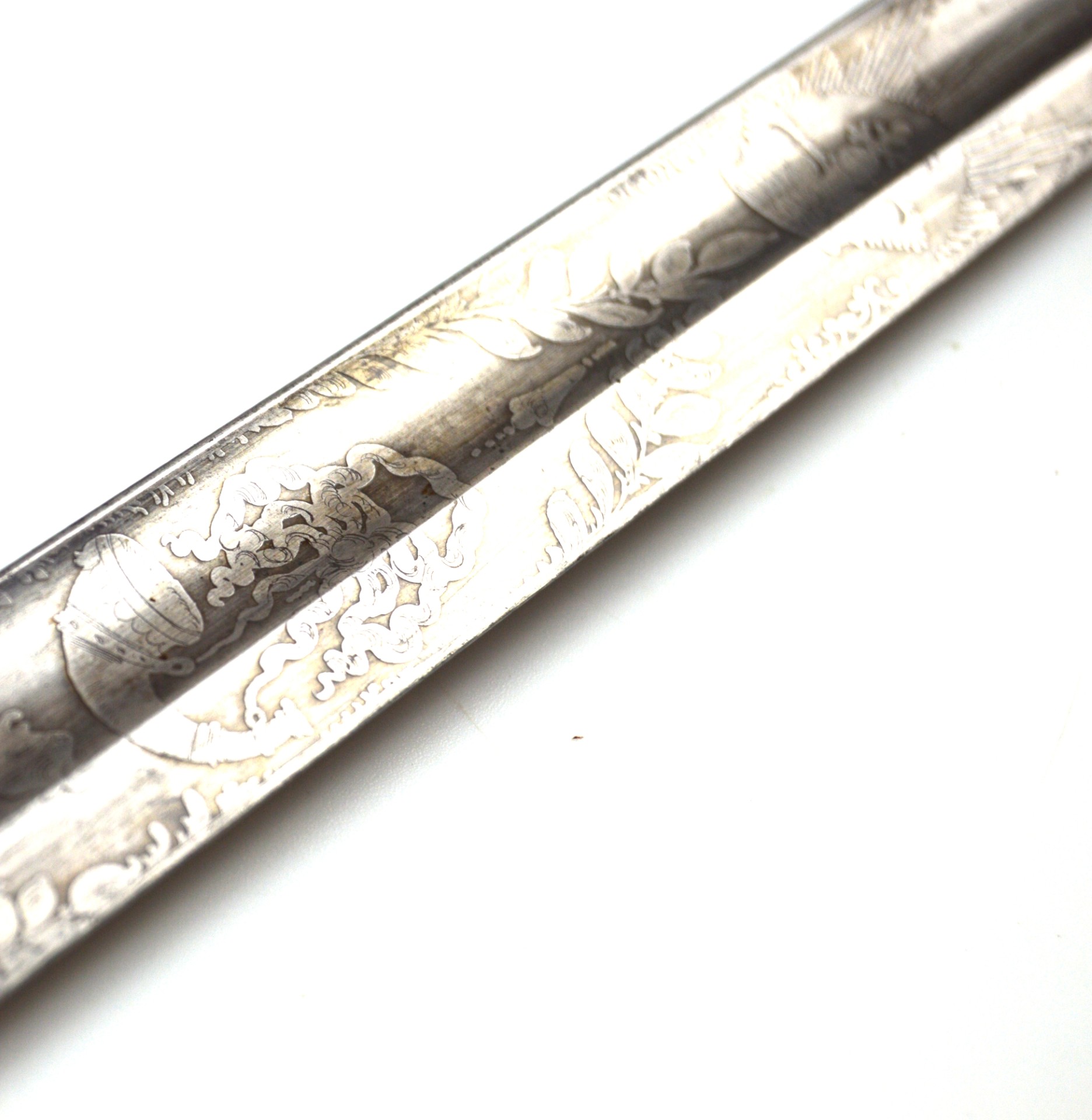 Condition: Good – the etching is still clearly visible with patches of rust and some small nicks on the blade. The scabbard was previously painted silver, although mostly removed, some patches remain. Some portions of the shagreen grip are absent.