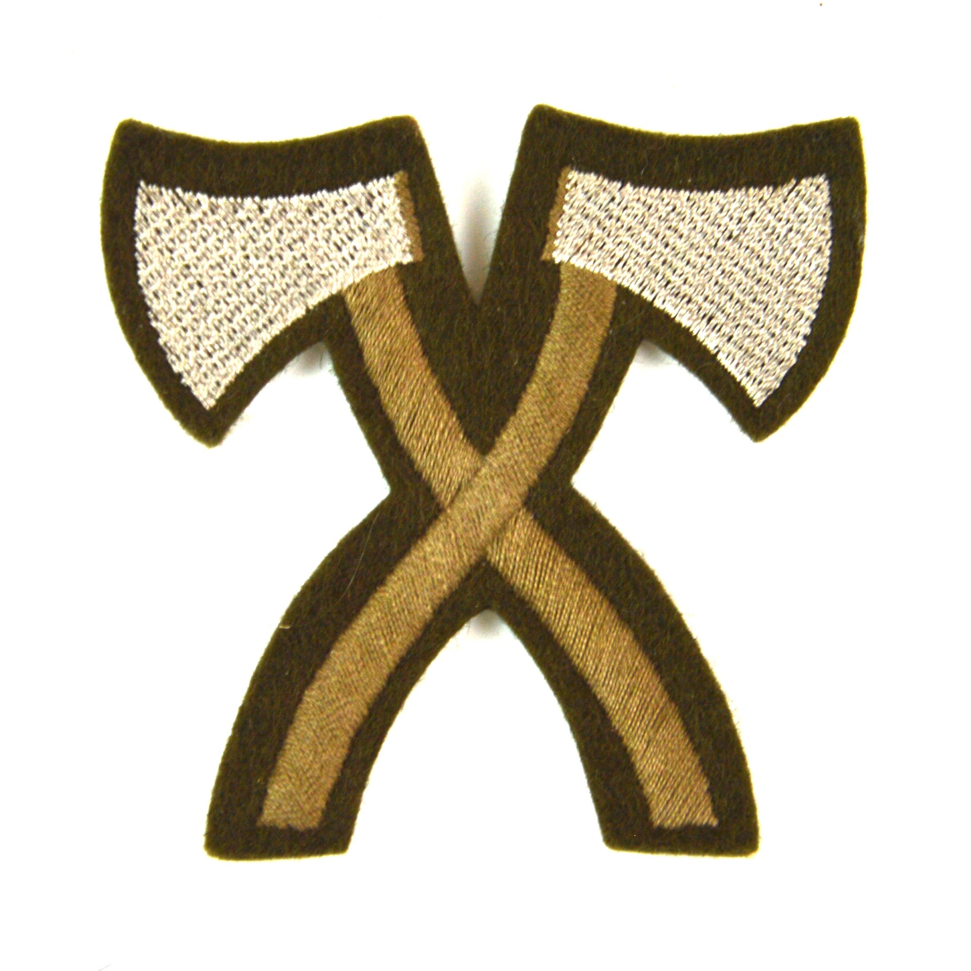 The badge is usually executed in embroidered thread on a worsted wool backing in full colour. The crossed axes motif has long been associated with pioneer troops, reflecting their role in clearing paths and preparing the battlefield.
