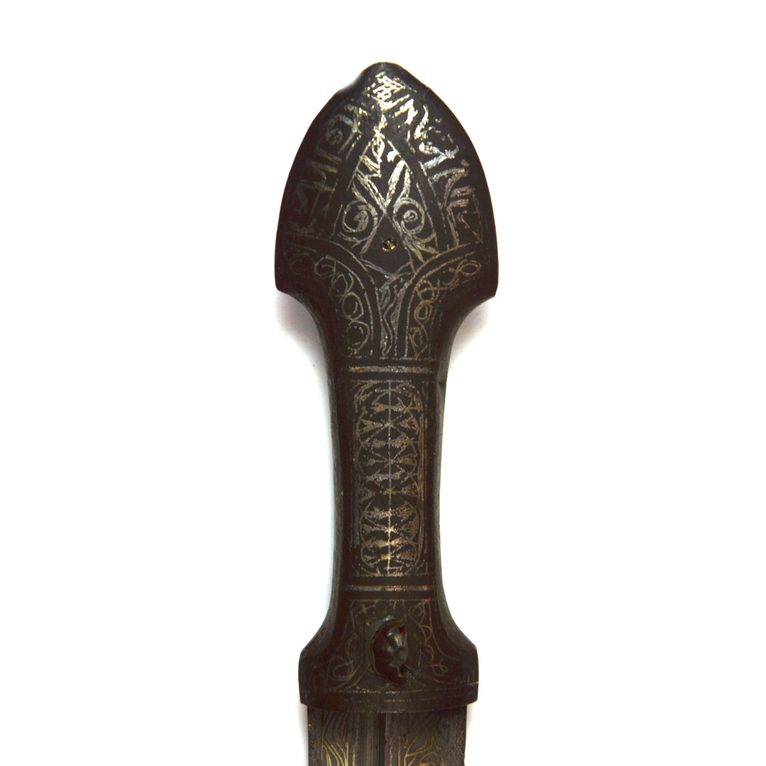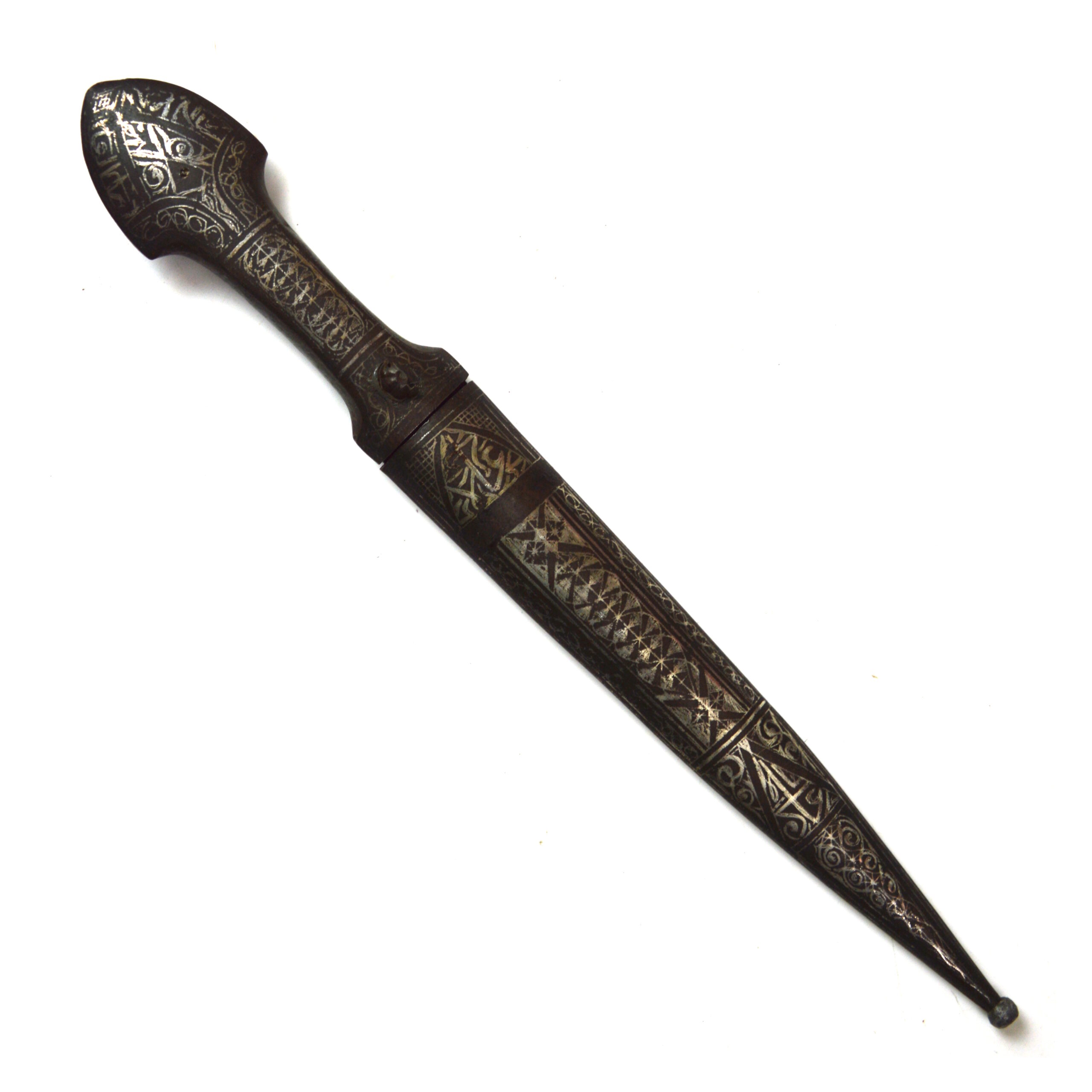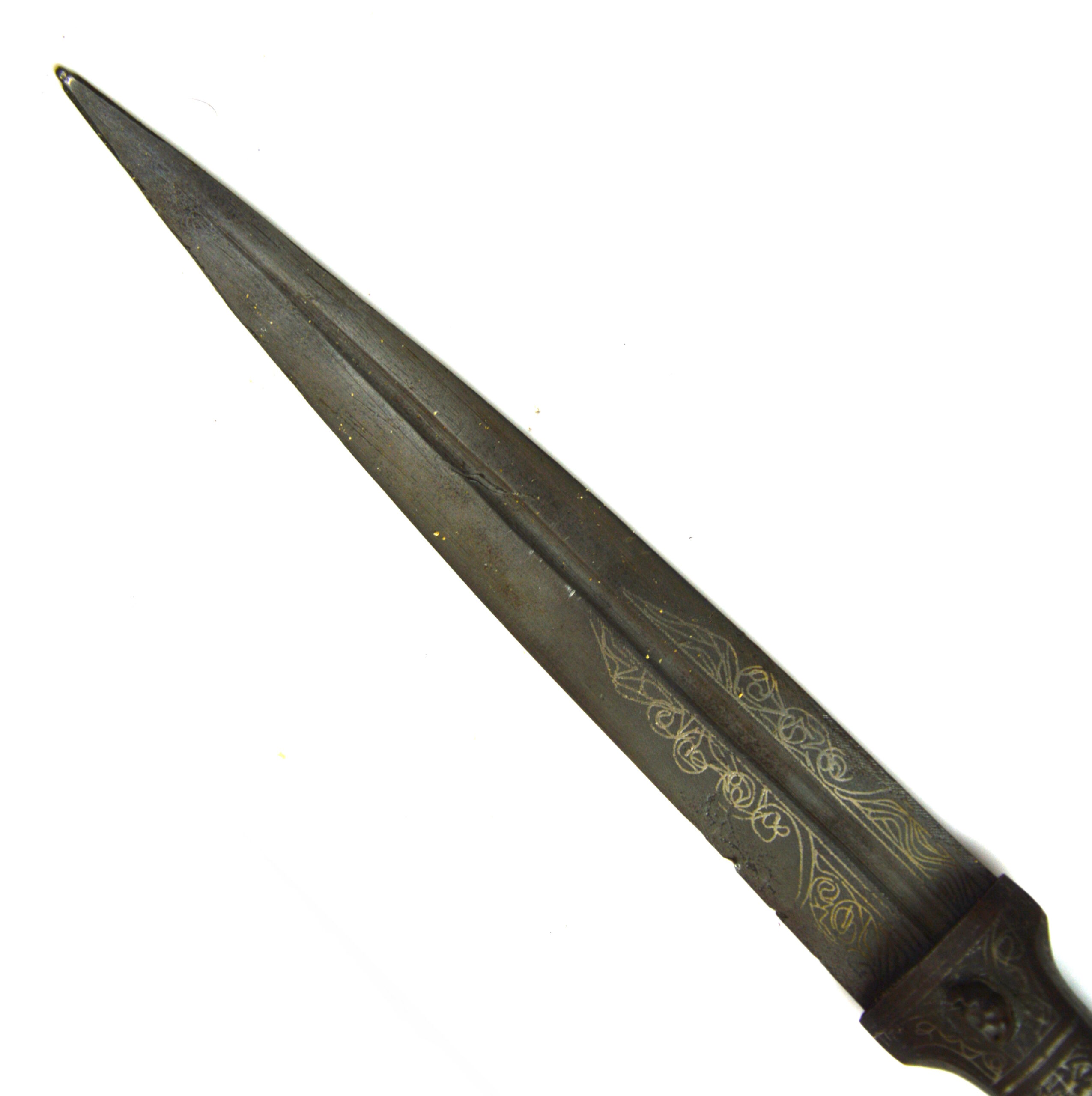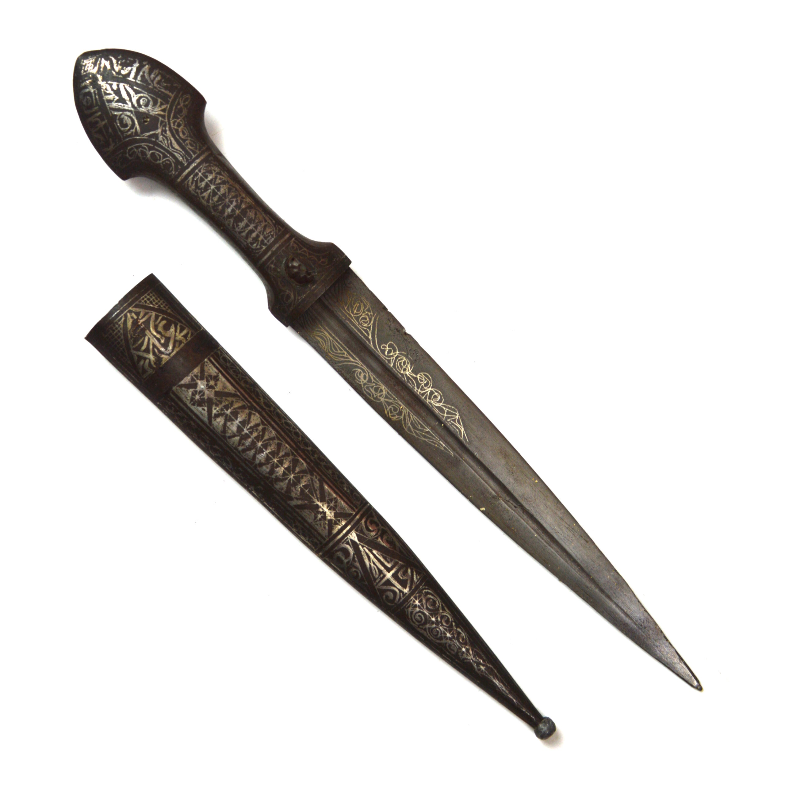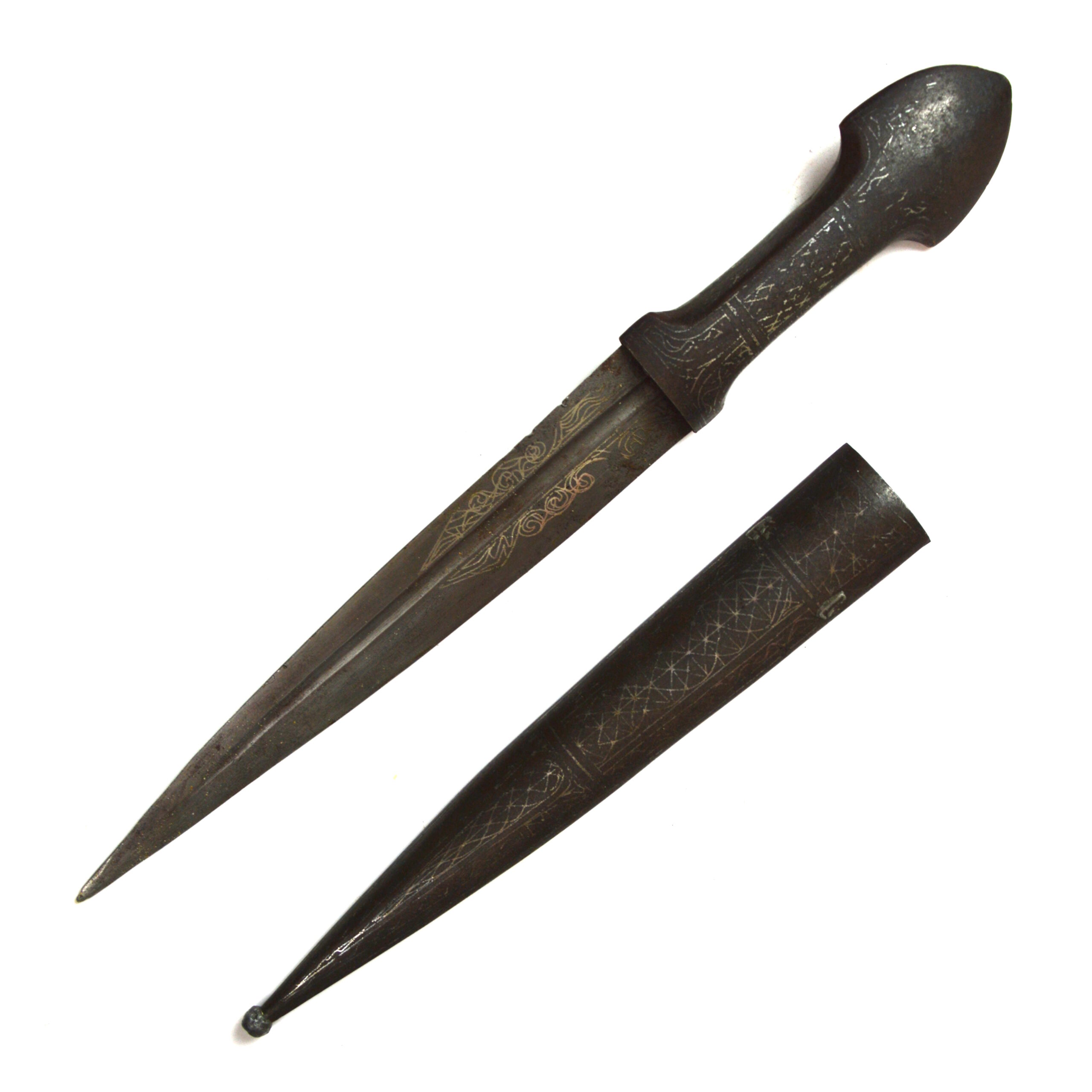 Indo-Persian silver inlay koftgari kindjal dagger with scabbard, a decorative edged weapon reflecting the artistic metalworking traditions of the Indo-Persian and Turkic cultural spheres. The Kindjal dagger form is characterised by its broad, double-edged blade with a pronounced central fuller, designed for close combat while also serving as a status object.
