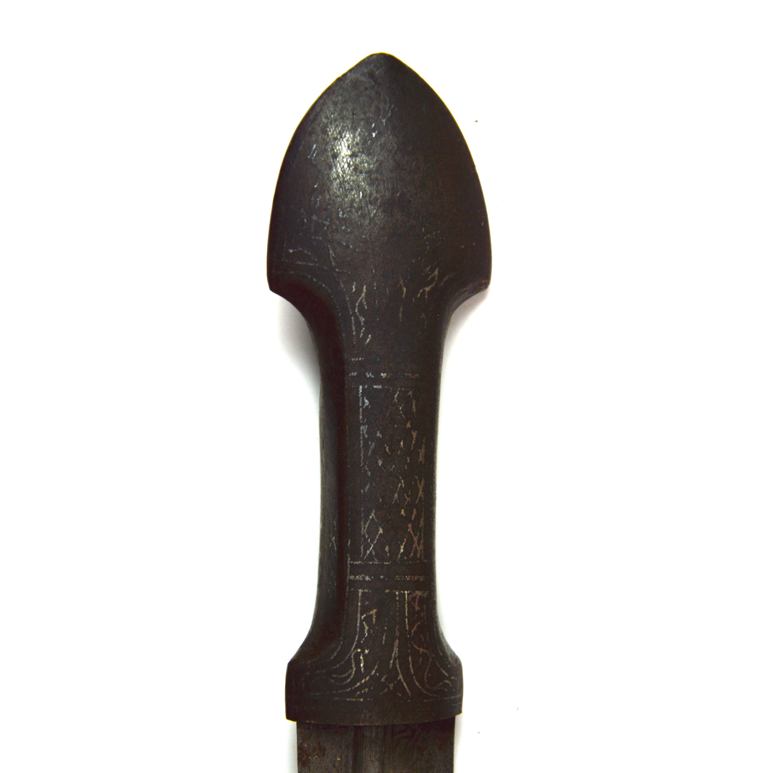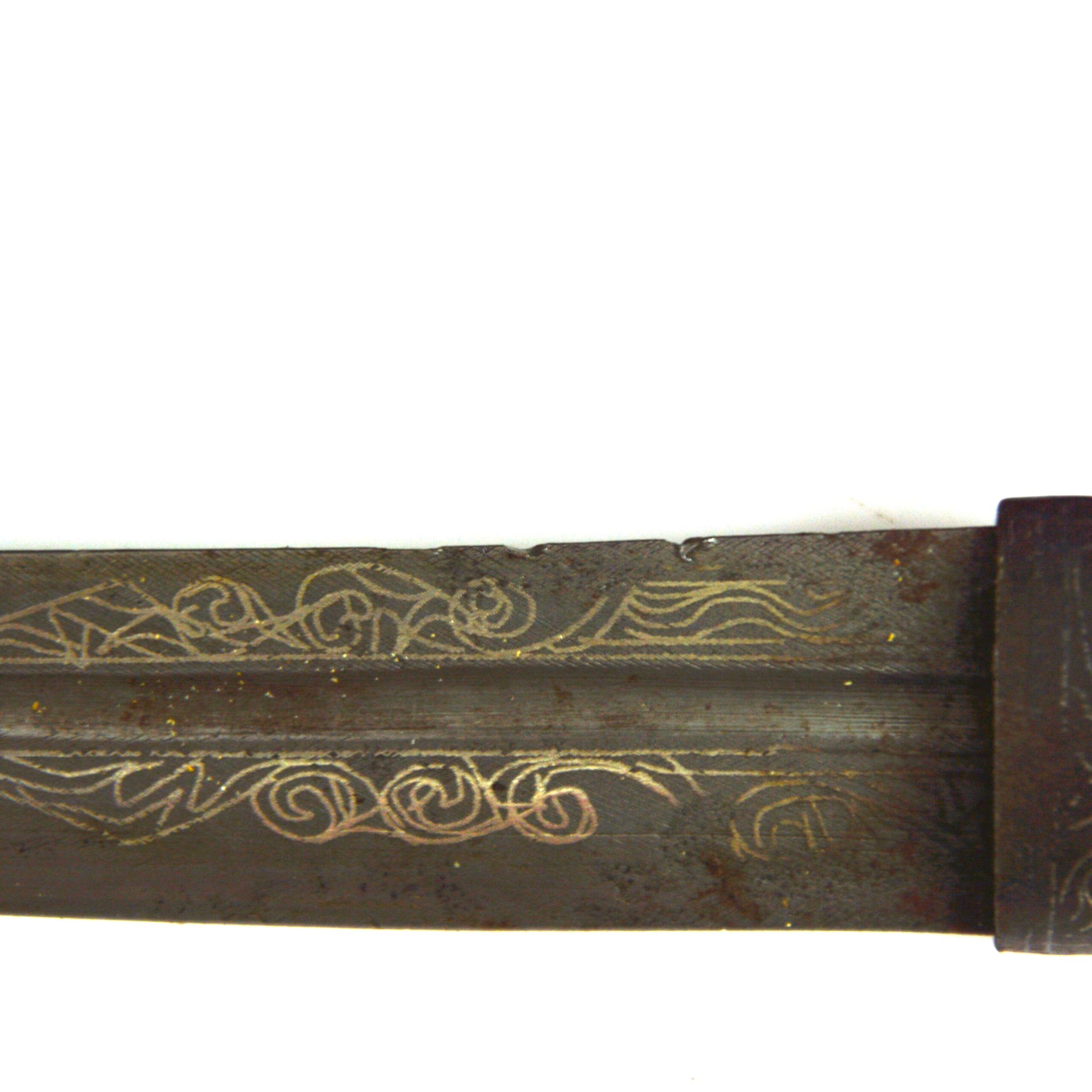 Good overall condition, with clear silver inlay decoration and defined blade form. The blade shows surface marks, with 2 significant chips in the edge as well as a gouge in the fuller. The scabbard remains intact with expected wear and possible fittings absent. The rosette on the hilt is broken, with only about half of it remaining.