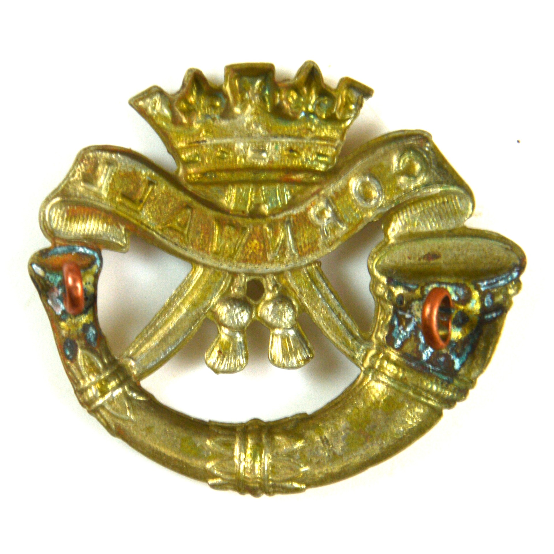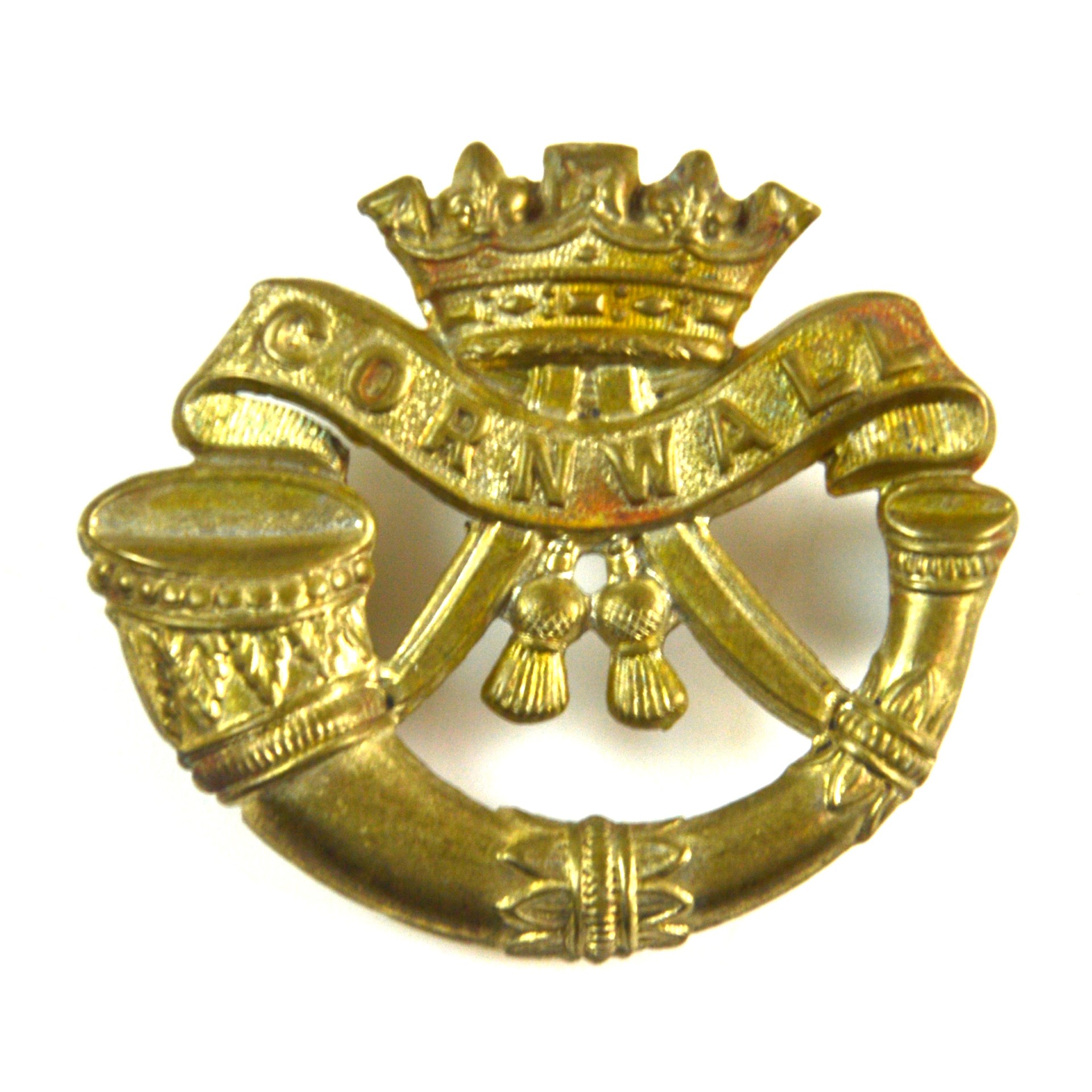 Duke of Cornwall’s Light Infantry (DCLI) cap badge produced as a restrike of the pattern worn from 1881 until the regiment’s amalgamation in 1959. This British Army light infantry cap badge displays the recognised insignia of the Duke of Cornwall’s Light Infantry in clear relief, incorporating the light infantry bugle with a scroll bearing the regiment’s county of Cornwall, surmounted by the ducal crown, arranged in a formal and balanced composition characteristic of line and light infantry headdress insignia.