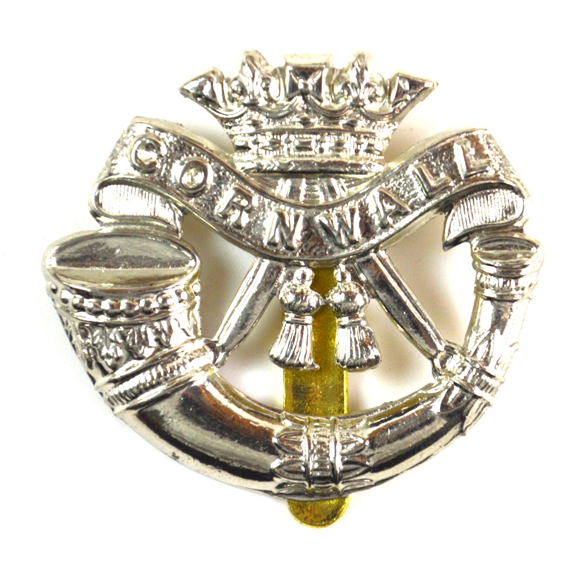 Duke of Cornwall’s Light Infantry (DCLI) cap badge produced as a restrike of the pattern worn from 1881 until the regiment’s amalgamation in 1959. This British Army light infantry cap badge displays the recognised insignia of the Duke of Cornwall’s Light Infantry in clear relief, incorporating the light infantry bugle with a scroll bearing the regiment’s county of Cornwall, surmounted by the ducal crown, arranged in a formal and balanced composition characteristic of line and light infantry headdress insignia.