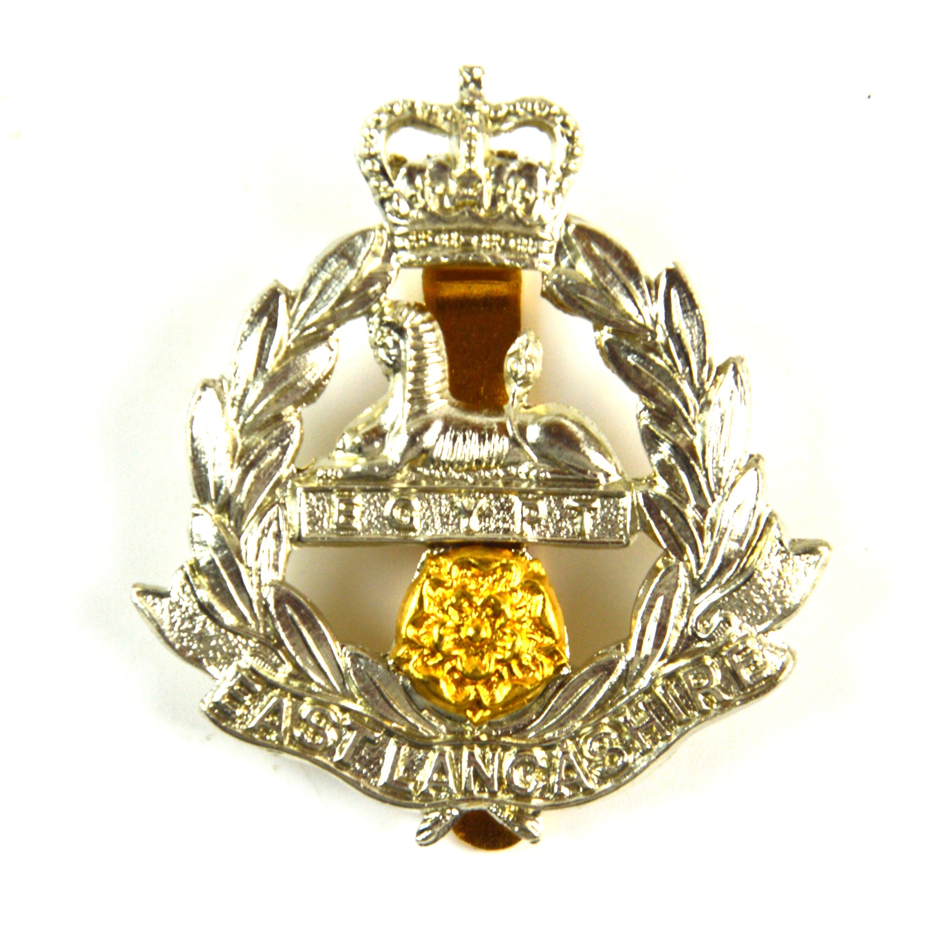 East Lancashire Regiment cap badge produced as a restrike of the Queen’s Crown pattern worn between 1953 and 1958 by the East Lancashire Regiment of the British Army. This British Army infantry cap badge displays the recognised insignia of the regiment in clear relief, incorporating the sphinx resting upon a tablet inscribed “Egypt,” a battle honour granted for the regiment’s distinguished service in the Egyptian campaign of 1801. The sphinx is mounted above a scroll bearing the regimental title “East Lancashire” and surmounted by the Queen’s Crown, arranged in the formal composition long associated with the regiment’s headdress insignia.